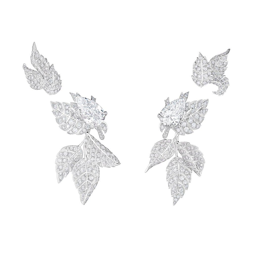 Rihanna arborait les pendants d’oreilles Rosier, issus de la collection Histoire de Style, Untamed Nature : une interprétation joaillière audacieuse de la fleur sauvage, entièrement pavée de diamants sur or blanc, sublimant la grâce florale dans une esthétique résolument contemporaine.