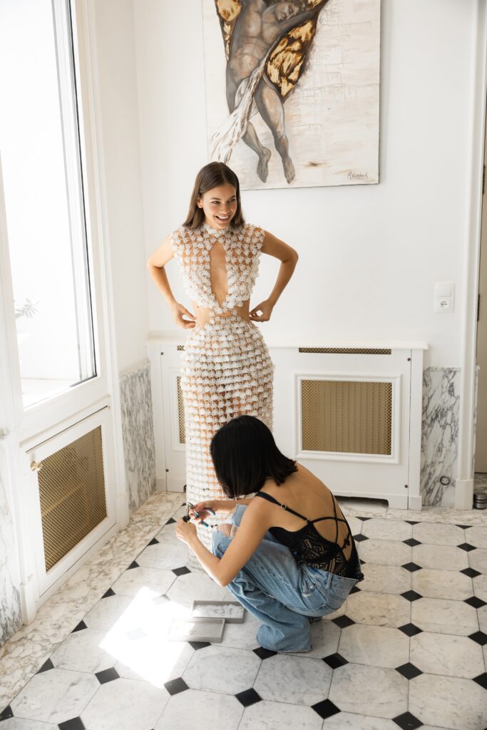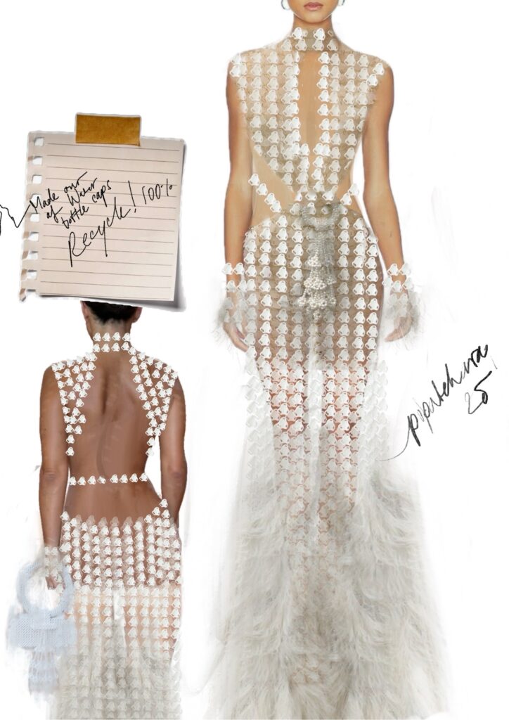 La robe, entièrement assemblée à la main, incarne l’alchimie rare entre artisanat minutieux et éthique environnementale. Chaque bouchon, collecté dans des foyers anonymes, trouve une nouvelle vie dans un design d’une précision quasi architecturale, redonnant sens au mot « sur-mesure ».