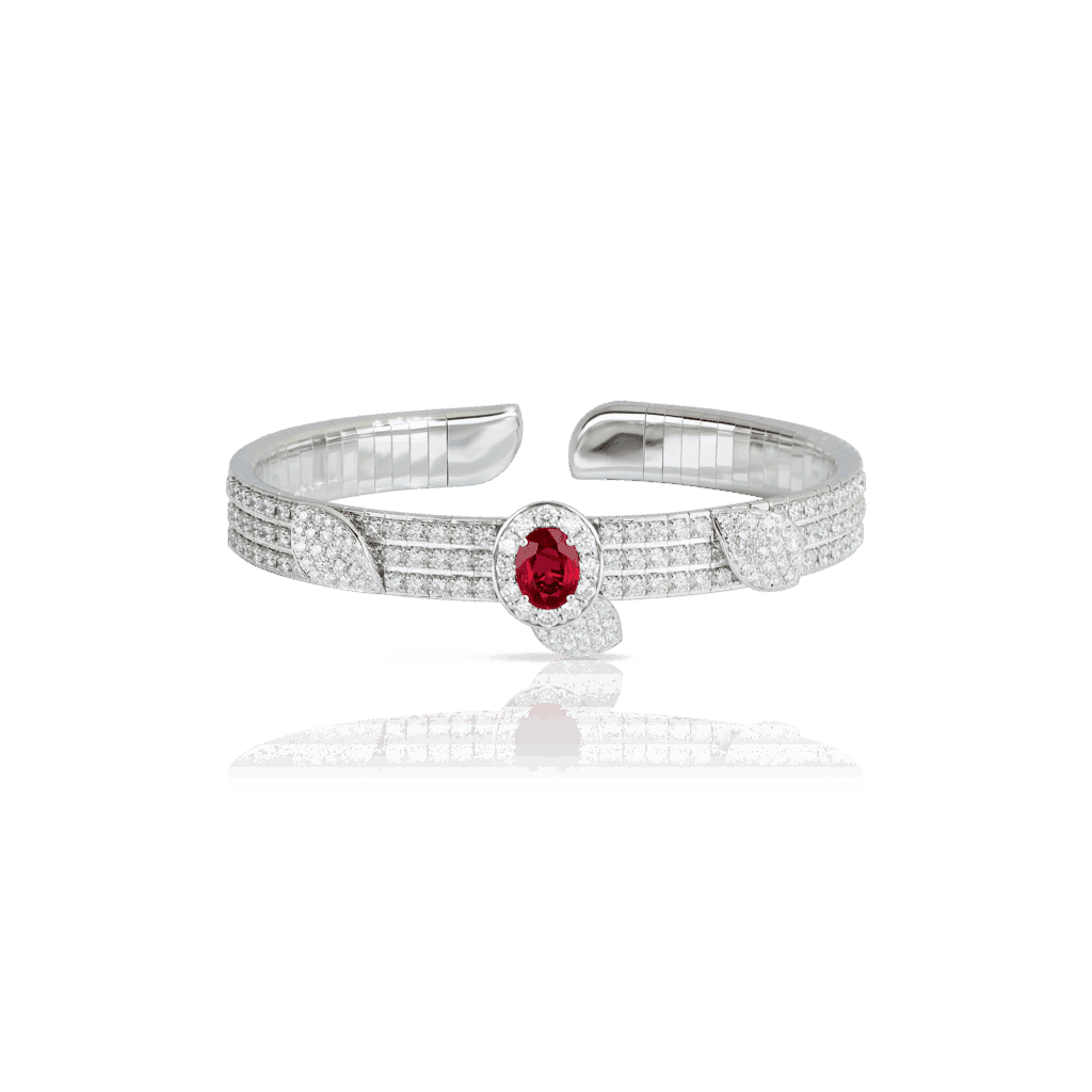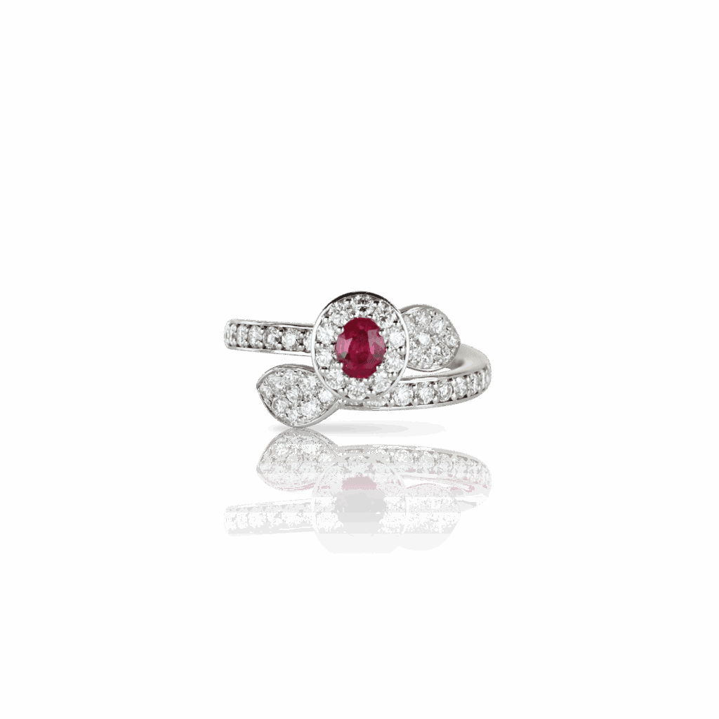 – Enfin, un troisième collier mettant en valeur un rubis ovale, encerclé de feuilles diamantées, évoquant une nature précieuse et protectrice.