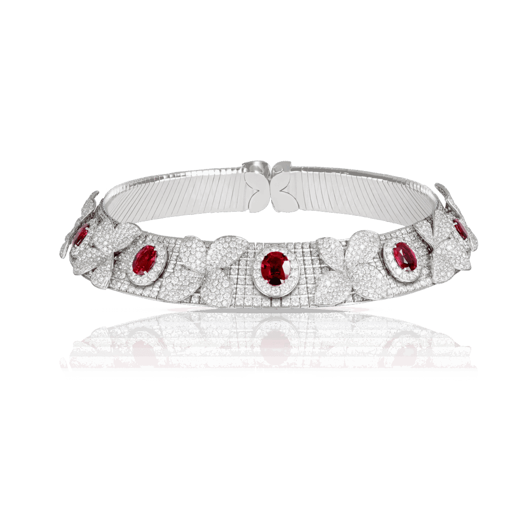 – Superposé à un choker pavé de diamants blancs, formant un halo lumineux autour du cou.
