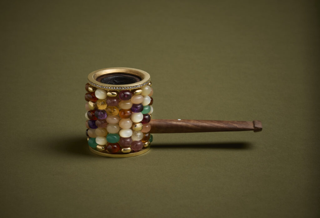 Transmise à l’écran de père en fille, la pièce symbolise à la fois l’héritage et le secret, incarnant le cœur visuel d’un récit baroque, où tycoons et assassins s’entrelacent dans une traque planétaire. Imaginée sur le modèle des pipes de maïs américaines du XIXe siècle, la version dunhill en revisite les volumes avec une main d’orfèvre : structure en or 18 carats, pierres polies montées artisanalement, chaque détail évoque un épi doré – mais en miniature, pour un raffinement suprême.
