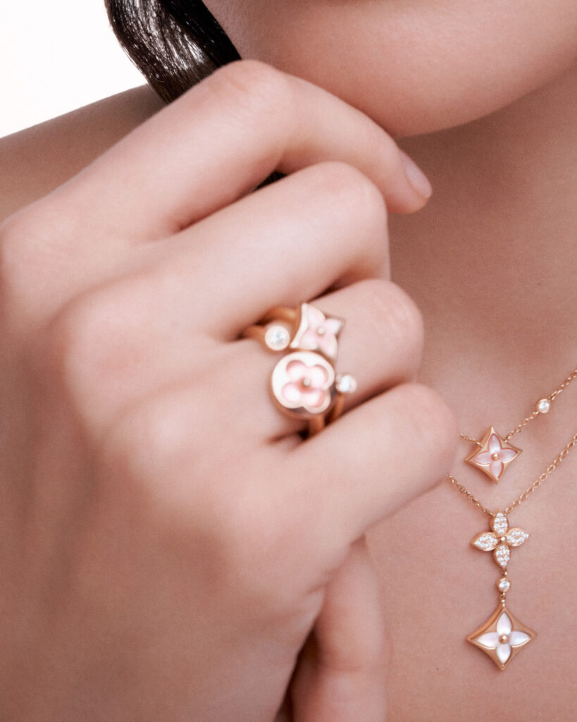 Parmi les créations phares, le bracelet Sun Color Blossom en onyx et or jaune incarne une élégance graphique, tandis que le pendentif Star Color Blossom en malachite et or rose insuffle une énergie vibrante à la silhouette. Les nuances pastel de la nacre rose s’expriment dans des bagues et bracelets d’une délicatesse exquise, réinterprétant avec grâce la tradition joaillière de Louis Vuitton.
