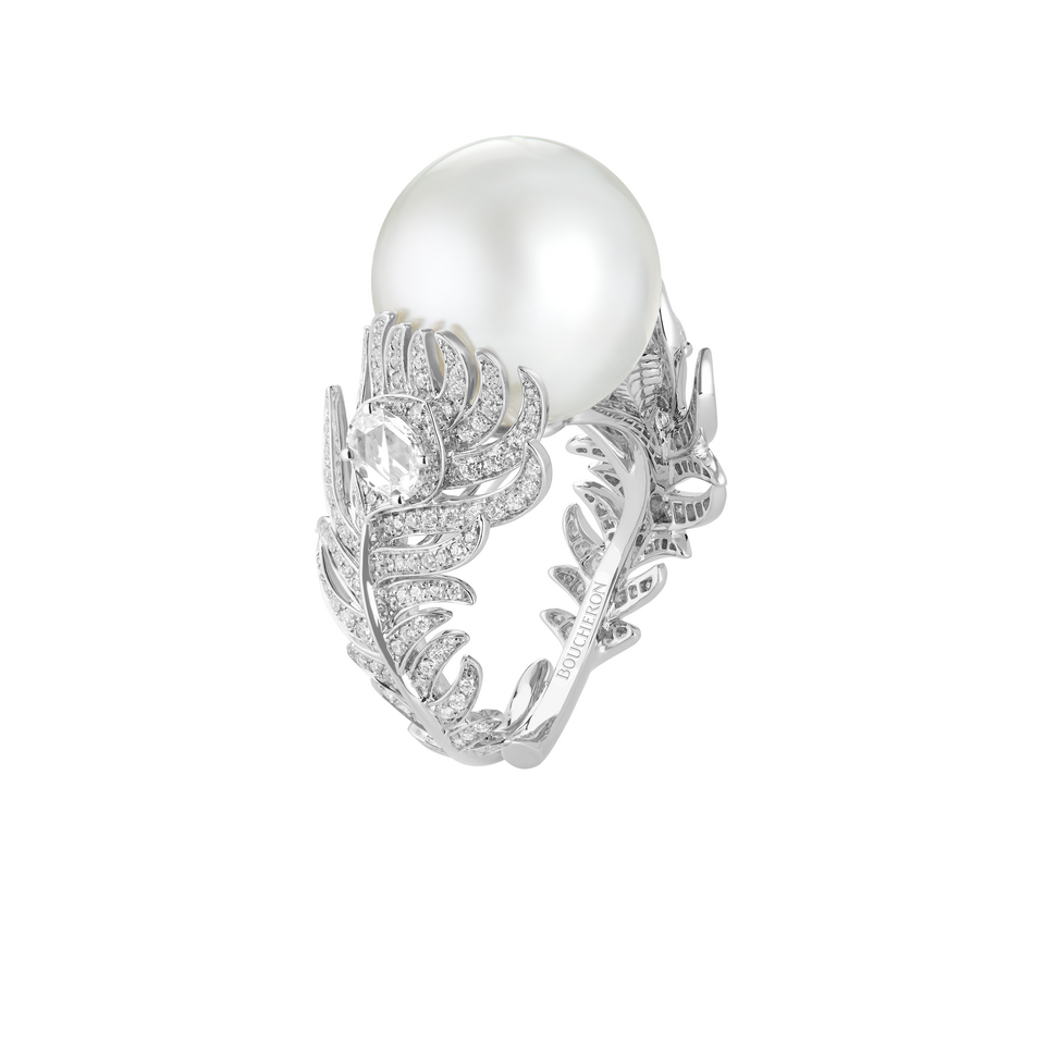 Elle portait les clous d’oreilles Plume de Paon, pavés de diamants sur or blanc, écho délicat au motif préféré de Frédéric Boucheron, inspiré par la légèreté de l’oiseau sacré. À sa main, la bague Plume de Paon, rehaussée d’une perle centrale, dialoguait en délicatesse avec le bijou d’exception qui complétait l’ensemble : le bracelet Art déco souple, en platine et diamants, daté de 1926 et issu de la Collection Privée Boucheron.