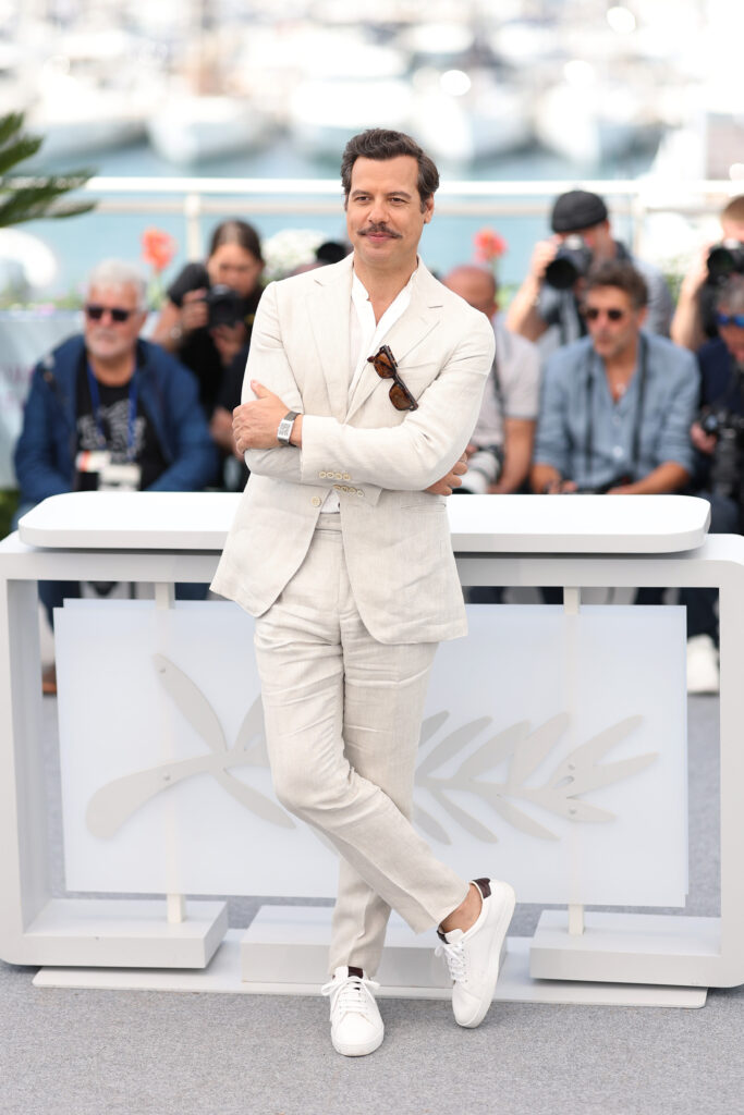 Lors du photocall du film Marcel et Monsieur Pagnol, Laurent Lafitte opte pour une silhouette lumineuse et décontractée, idéale pour la lumière du midi cannois : un costume trois pièces en lin craie, à la coupe fluide, porté avec une chemise sans col en lin blanc. À ses pieds, une paire de sneakers Playtime en cuir blanc complète ce look avec modernité et aisance, parfait équilibre entre chic méditerranéen et décontraction maîtrisée.