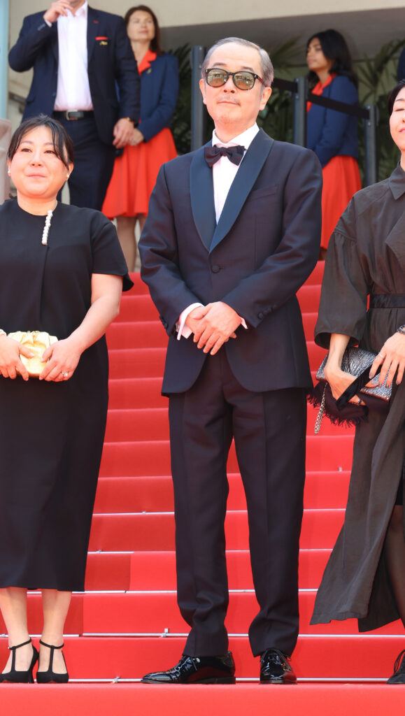Pour la projection du film Renoir en compétition officielle, Lily Franky embrasse le formalisme nocturne avec une rigueur toute cinématographique. Il choisit un smoking à col châle en mohair et satin de soie bleu nuit, associé à une chemise blanche en coton, un nœud papillon en satin de soie bleu nuit, et des souliers Alessandro en cuir verni noir. Une interprétation sobre et élégante, fidèle aux canons de la maison.