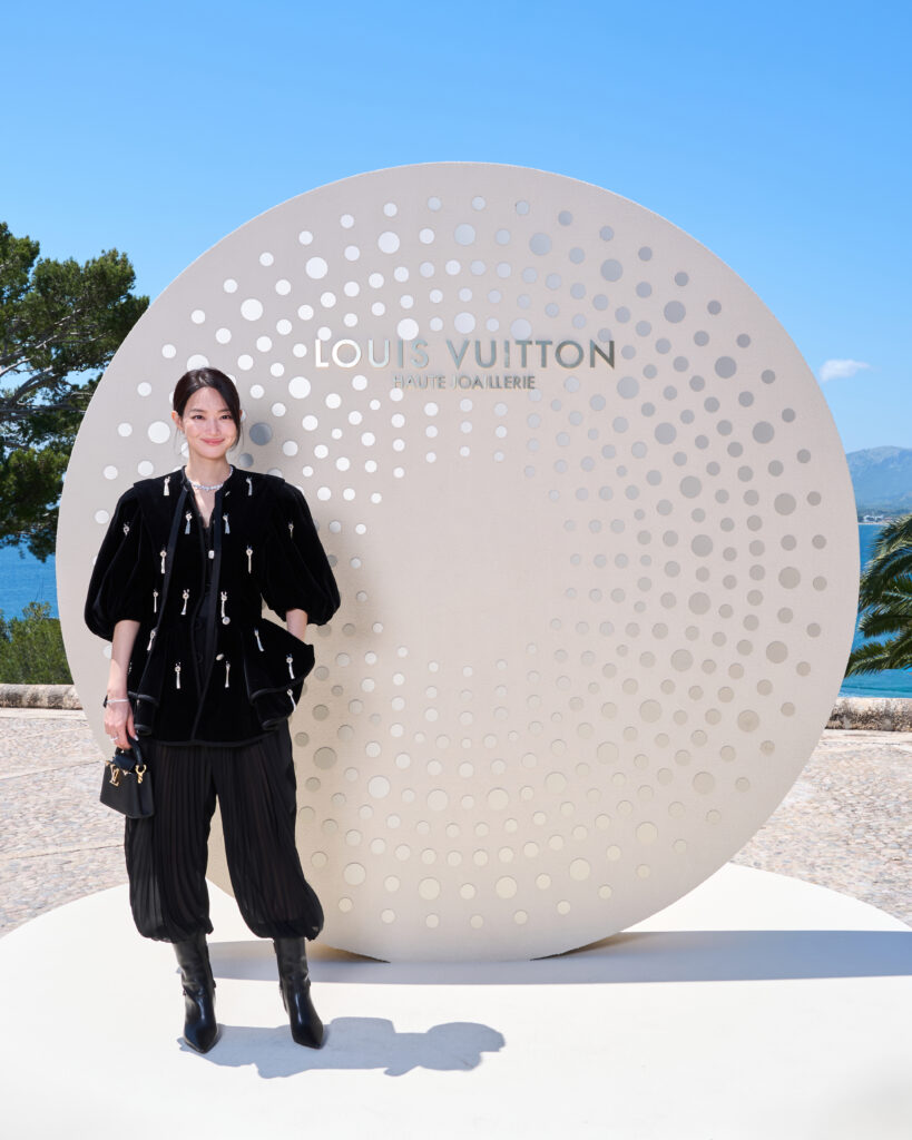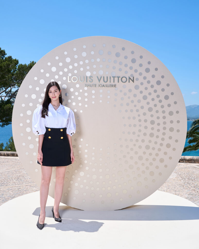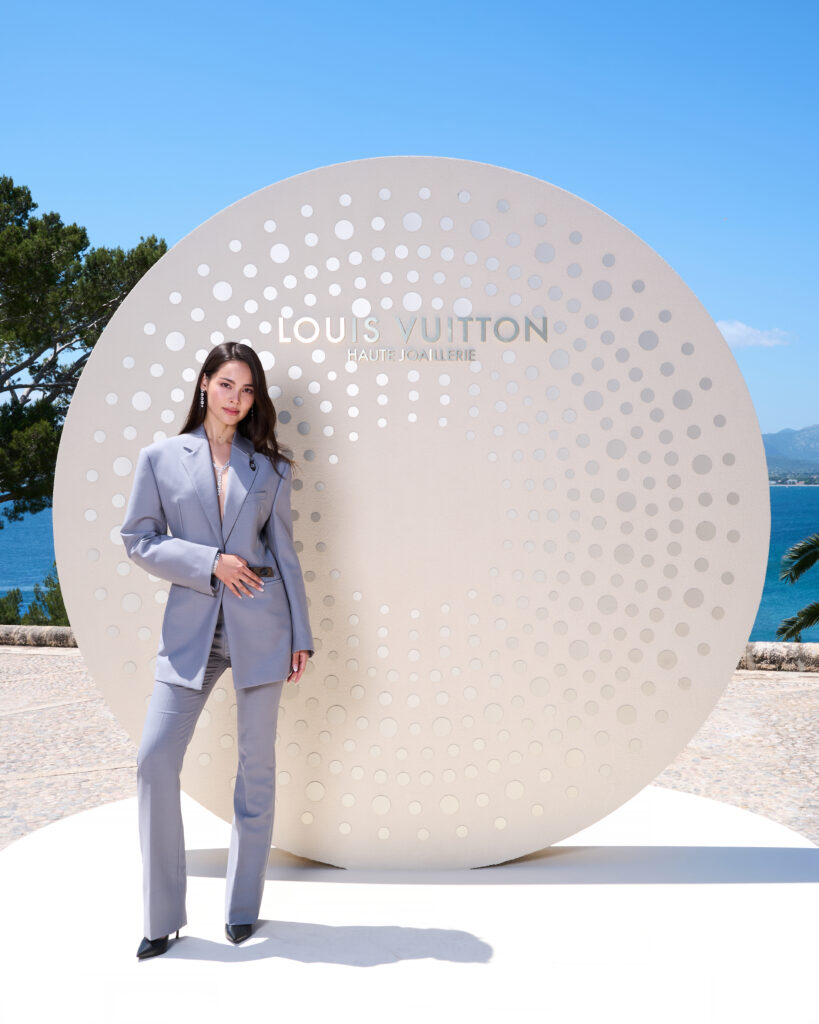 Parmi les invitées, Jin Chen captivait dans une silhouette androgyne épurée : chemise blanche en coton et pantalon plissé bleu, rehaussée d’une ceinture monogram et du sac Petite Malle en Monogram Reverse. Elle arborait l’ensemble Les Armoiries, serti de diamants taille LV Monogram Star, symbole distinctif de la collection.