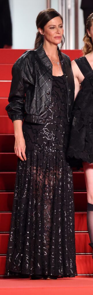 Anna Mouglalis arborait une robe en dentelle noire brodée de sequins de la collection Chanel Prêt-à-Porter Automne-Hiver 2025/26, une silhouette plissée aux résonances gothiques modernes, achevée par des chaussures Chanel au classicisme noir assumé. Le maquillage, également signé de la maison, renforçait ce jeu de contrastes, entre ombre et éclat, entre mémoire et réinvention.