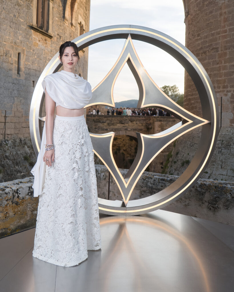 Jin Chen ouvrait la soirée dans une robe noire à découpes, accessoirisée de la mythique Petite Malle en cuir Epi blanc. Elle portait le collier, bague et boucles d’oreilles Gravité de la collection Awakened Hands, Awakened Minds, sertis de saphirs coussin anciens (jusqu’à 7,52 carats) et d’un diamant LV Monogram Star de 1,59 carat.