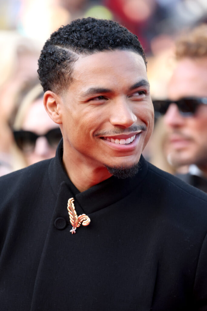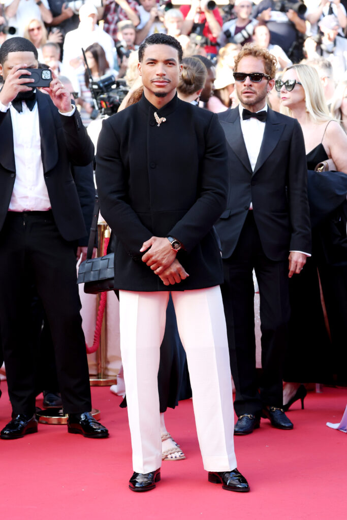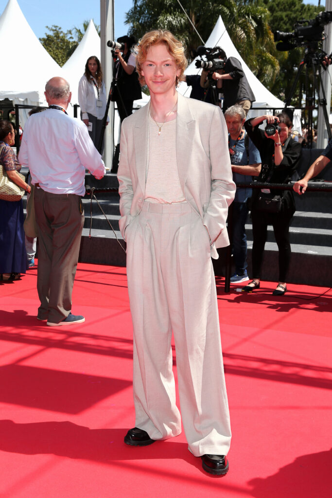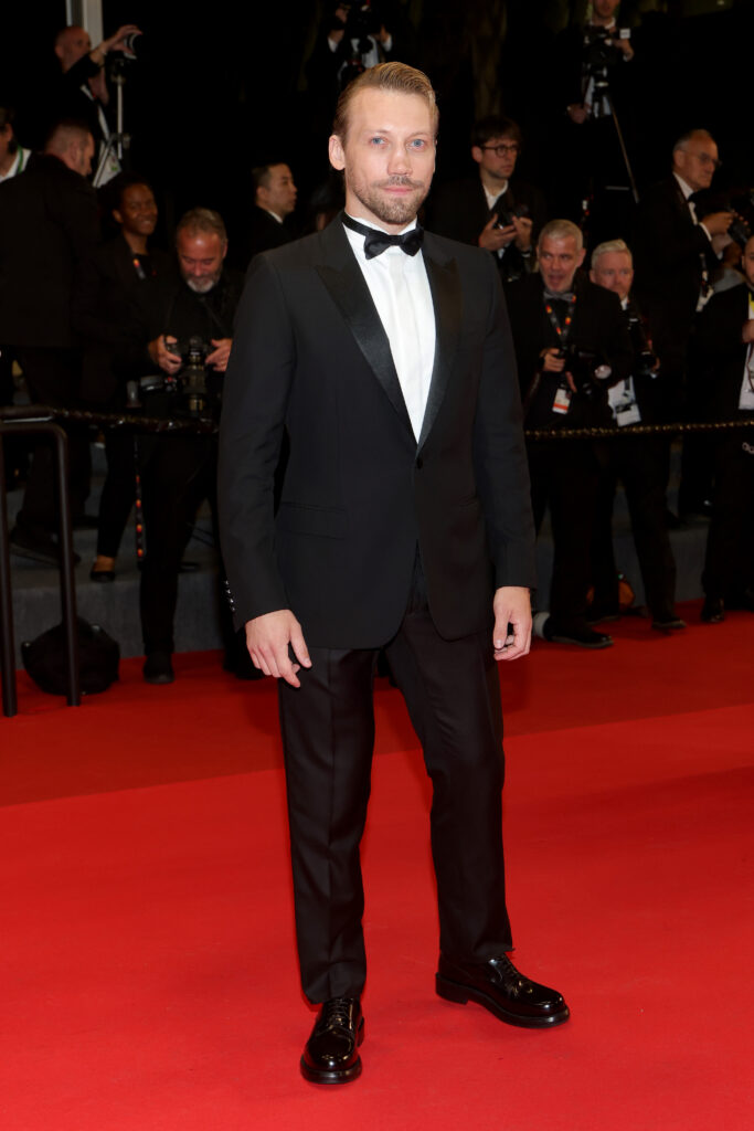 Côté masculin, Kim Jones a habillé trois acteurs phares en Dior Men. Pour Mission Impossible – The Final Reckoning, Tarzan Davis arborait un manteau bar noir sur pantalon blanc et richelieus vernis – un contraste graphique qui actualise les archétypes du smoking classique. Aleksandr Kuznetsov, pour Two Prosecutors, revisitait le tuxedo noir avec chemise col cassé et nœud papillon soyeux, d’une rigueur assumée. Quant à Filip Schnack, il misait sur l’élégance beige du lin et de la laine pour Sound of Falling, adoucie par un débardeur en cachemire et des mocassins Granville en cuir noir.