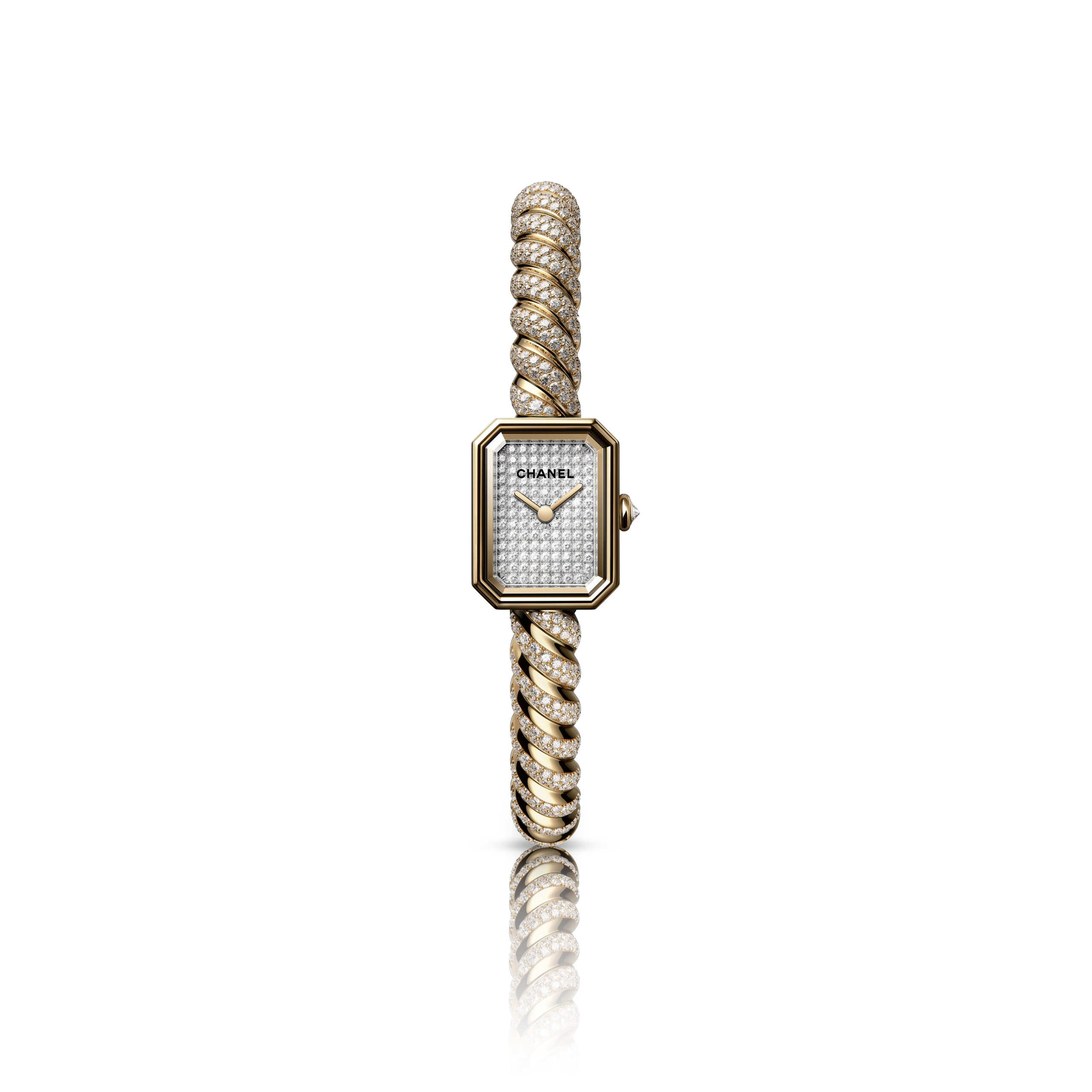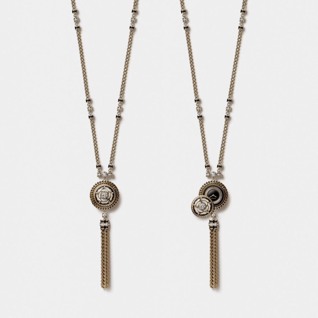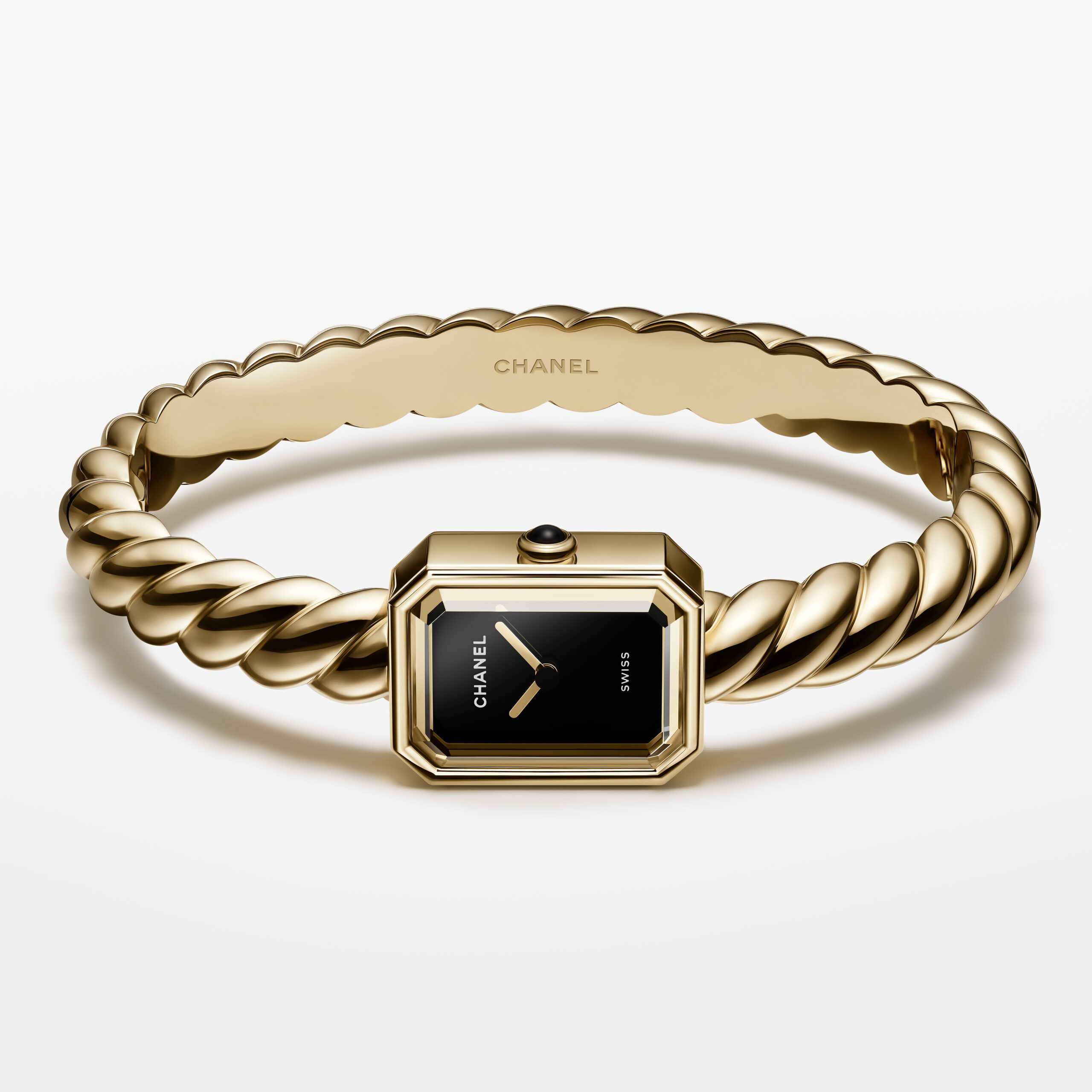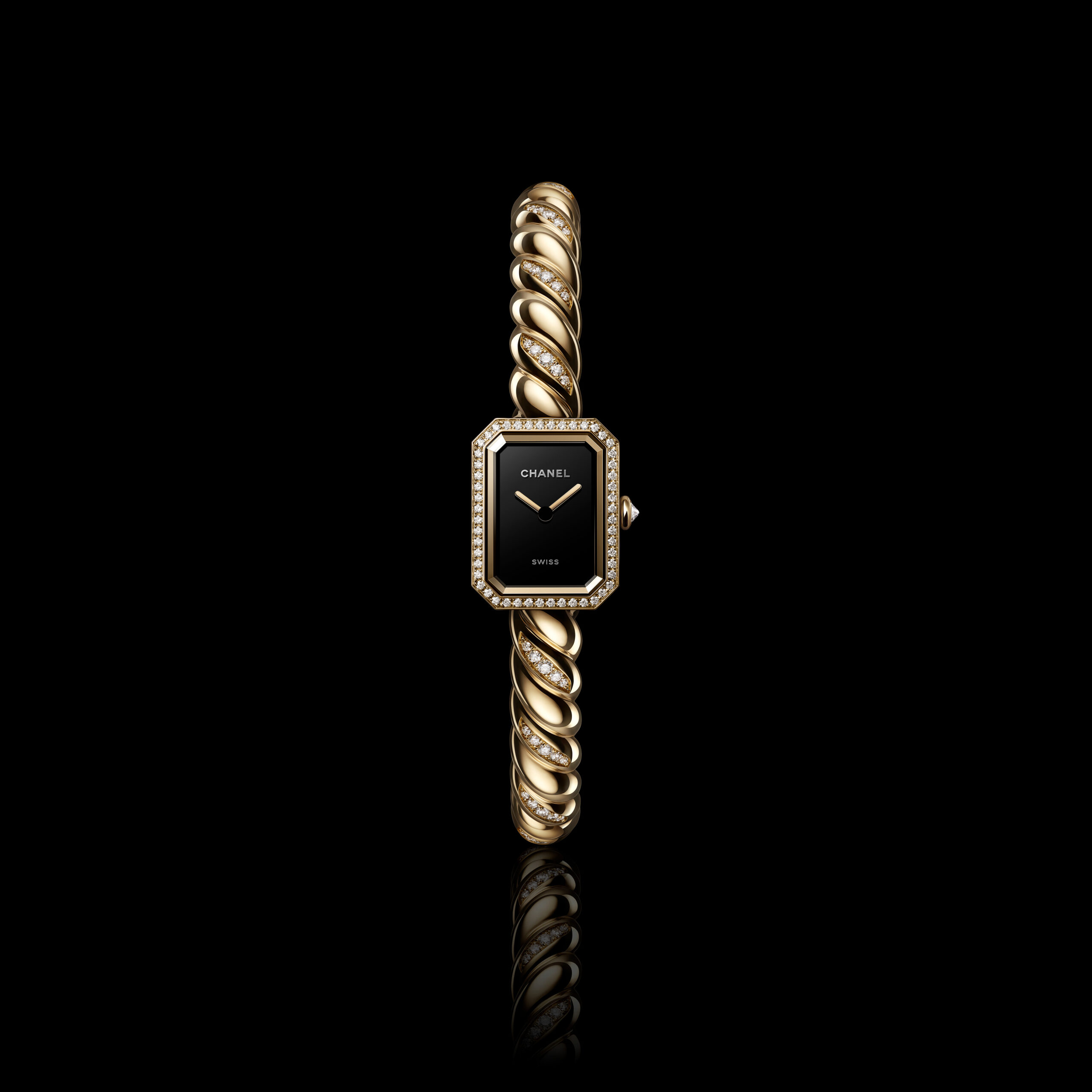 Deux nouvelles variations du modèle PREMIÈRE expriment l’esprit couture : le galon, élément stylistique du tailleur Chanel, devient bracelet rigide en or jaune, serti ou non de diamants. L’édition Chaîne Iconique se décline en version double tour ou collier, jouant des codes du sac matelassé et du flacon N°5. CHANEL fusionne les genres avec audace et élégance.