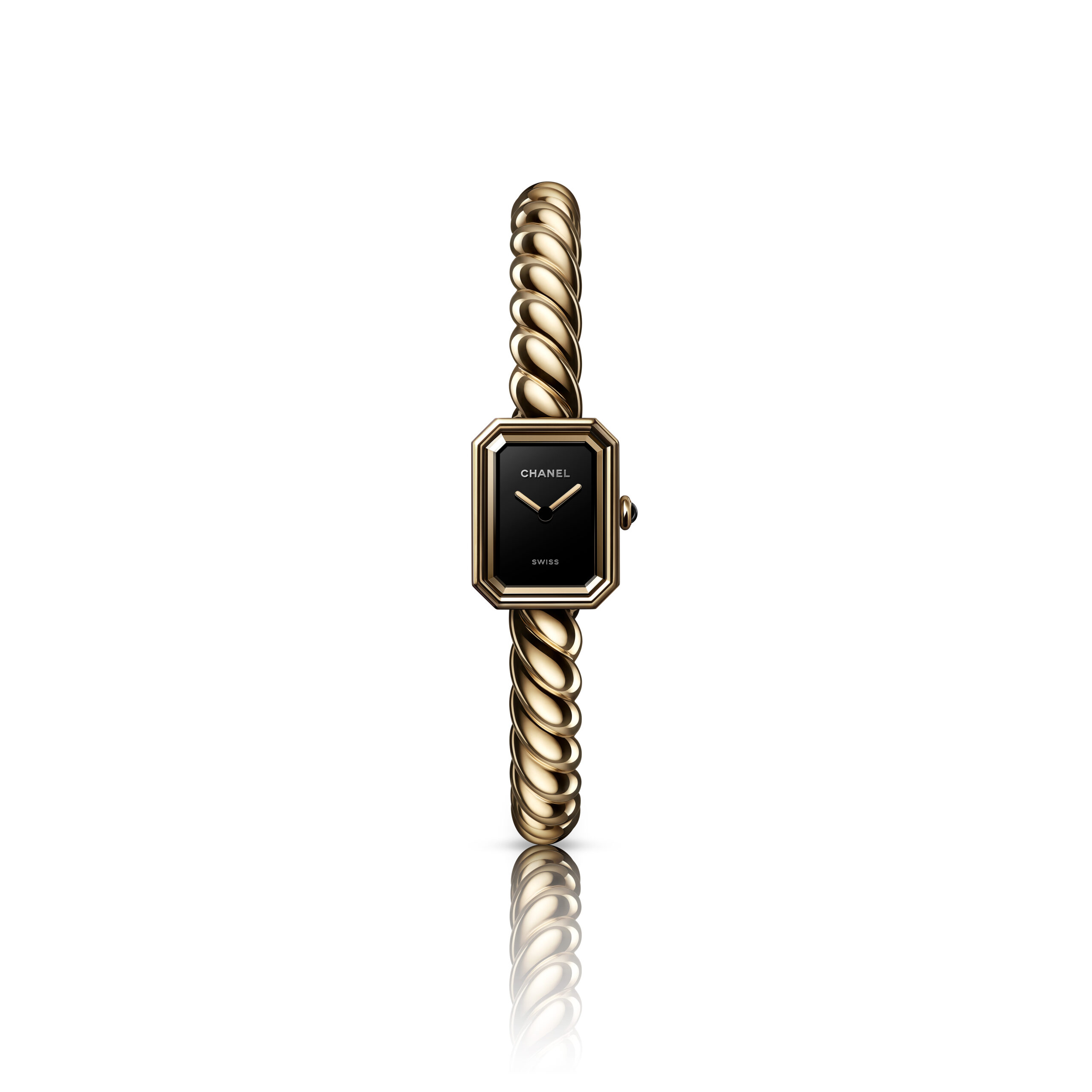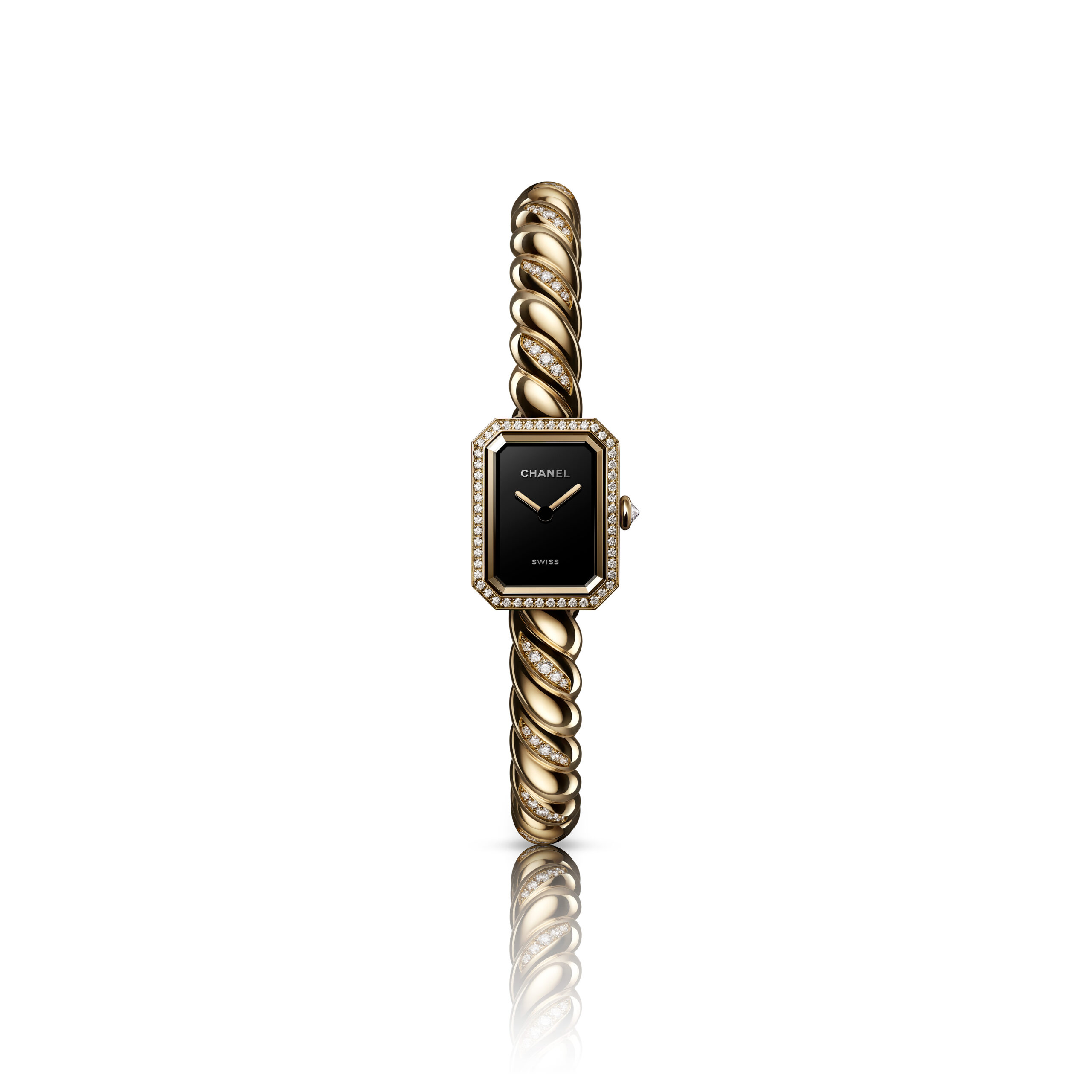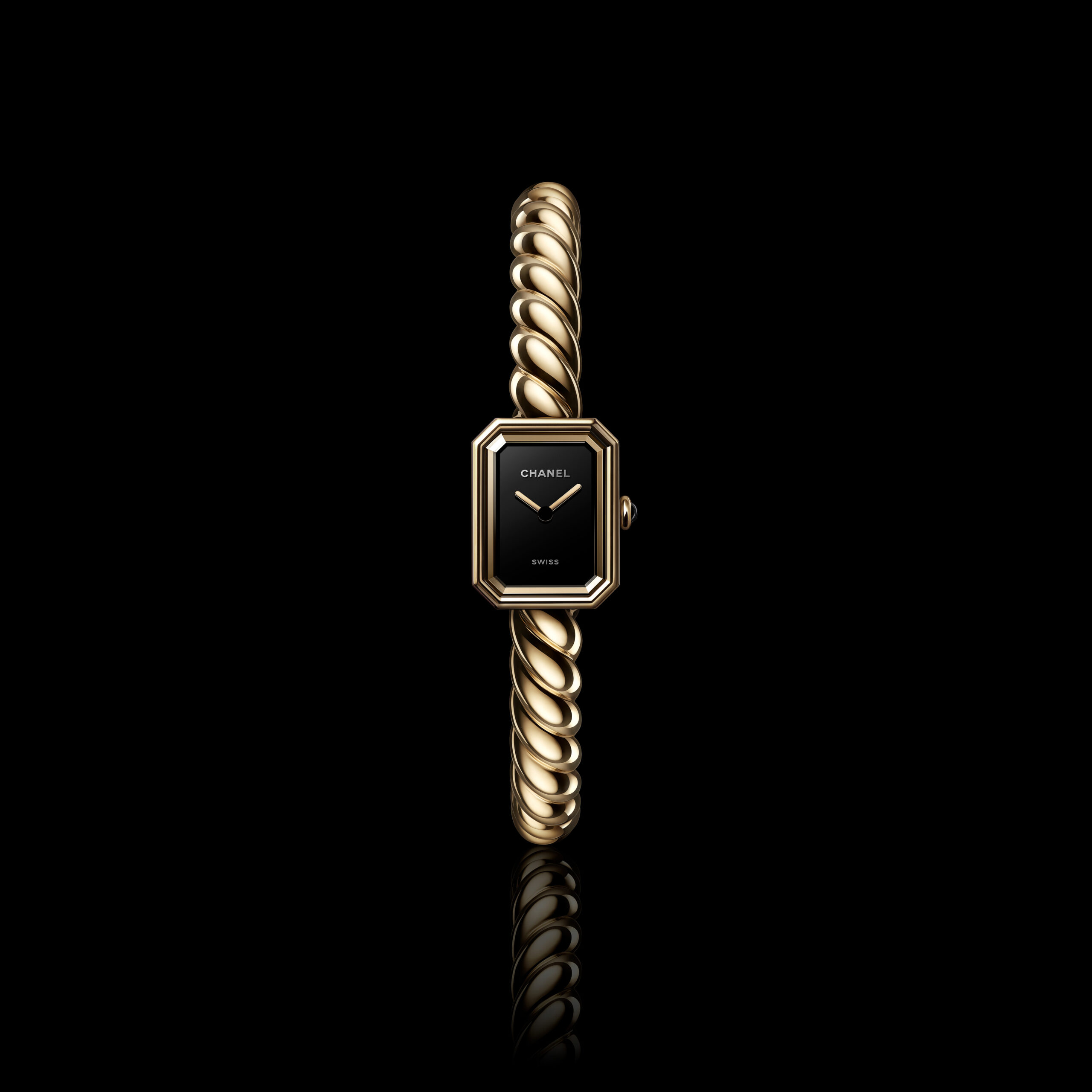 Deux nouvelles variations du modèle PREMIÈRE expriment l’esprit couture : le galon, élément stylistique du tailleur Chanel, devient bracelet rigide en or jaune, serti ou non de diamants. L’édition Chaîne Iconique se décline en version double tour ou collier, jouant des codes du sac matelassé et du flacon N°5. CHANEL fusionne les genres avec audace et élégance.