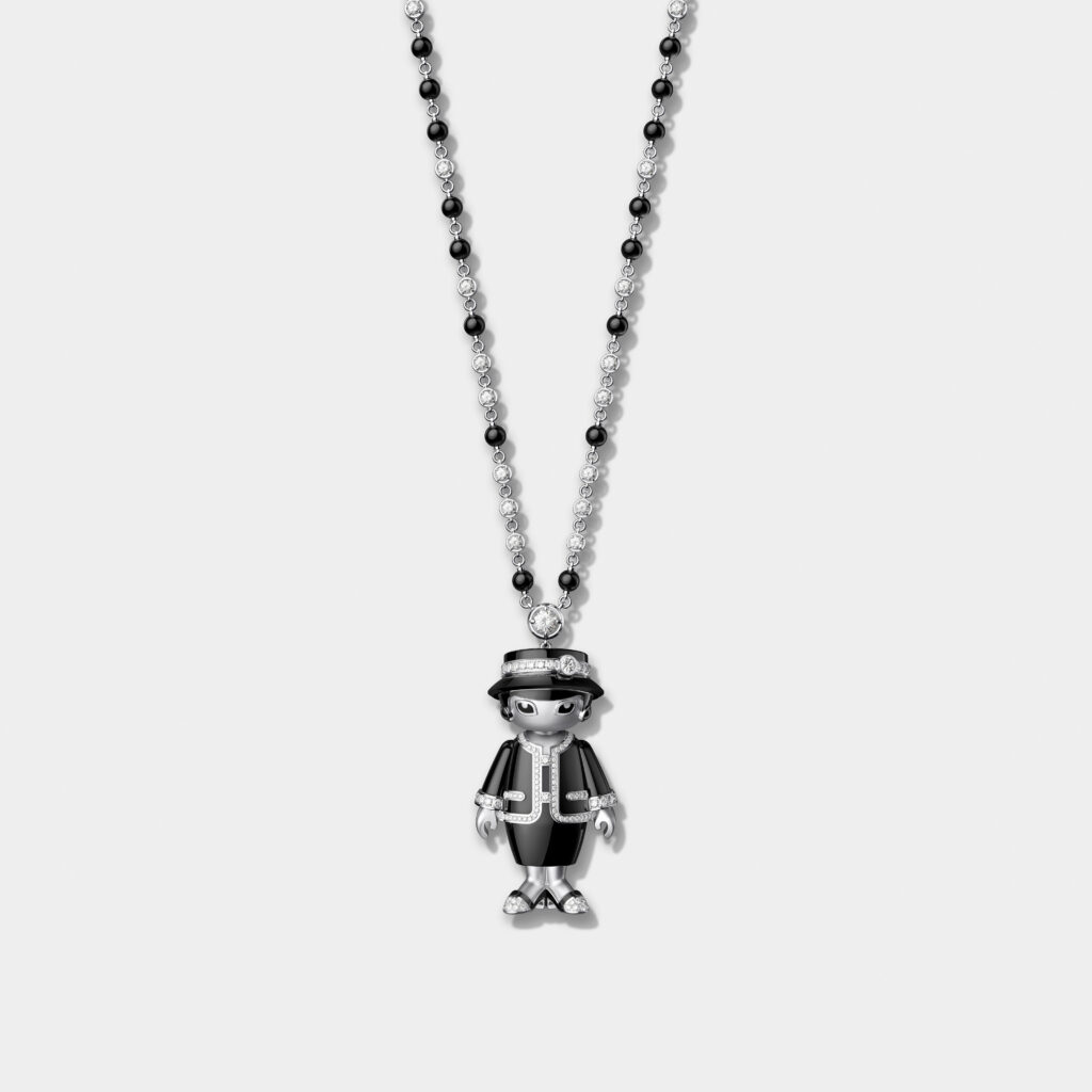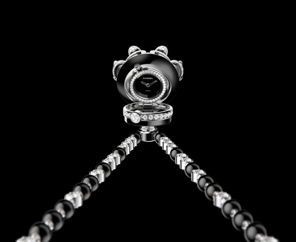 La silhouette de Coco Chanel devient bijou horloger. Sculptée en or blanc et diamants, coiffée d’un canotier, elle dissimule le cadran dans son chapeau. Une chaîne d’or blanc ponctuée de perles d’onyx et sertie de diamants évoque l’harmonie noir & blanc – la grammaire stylistique ultime de CHANEL.