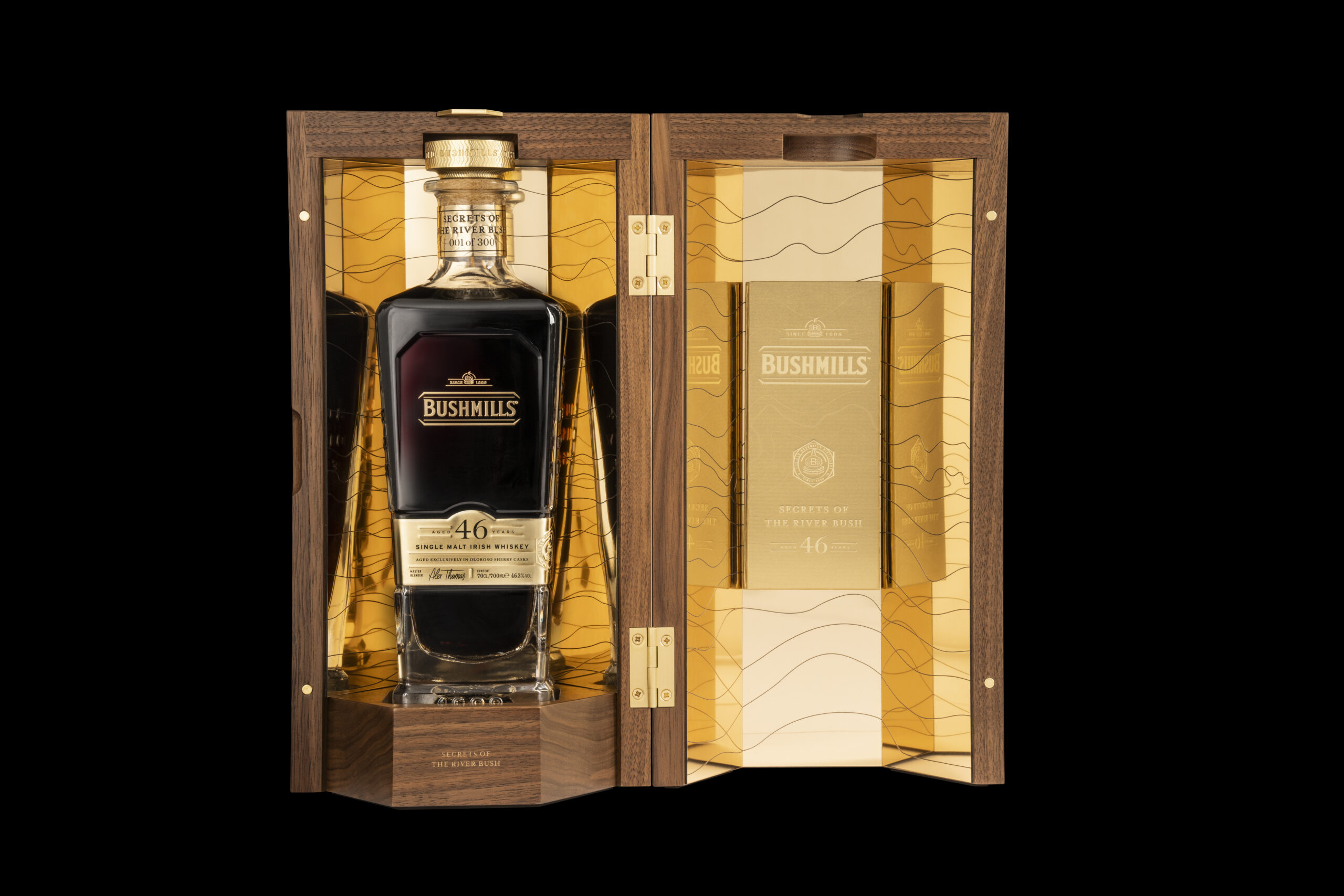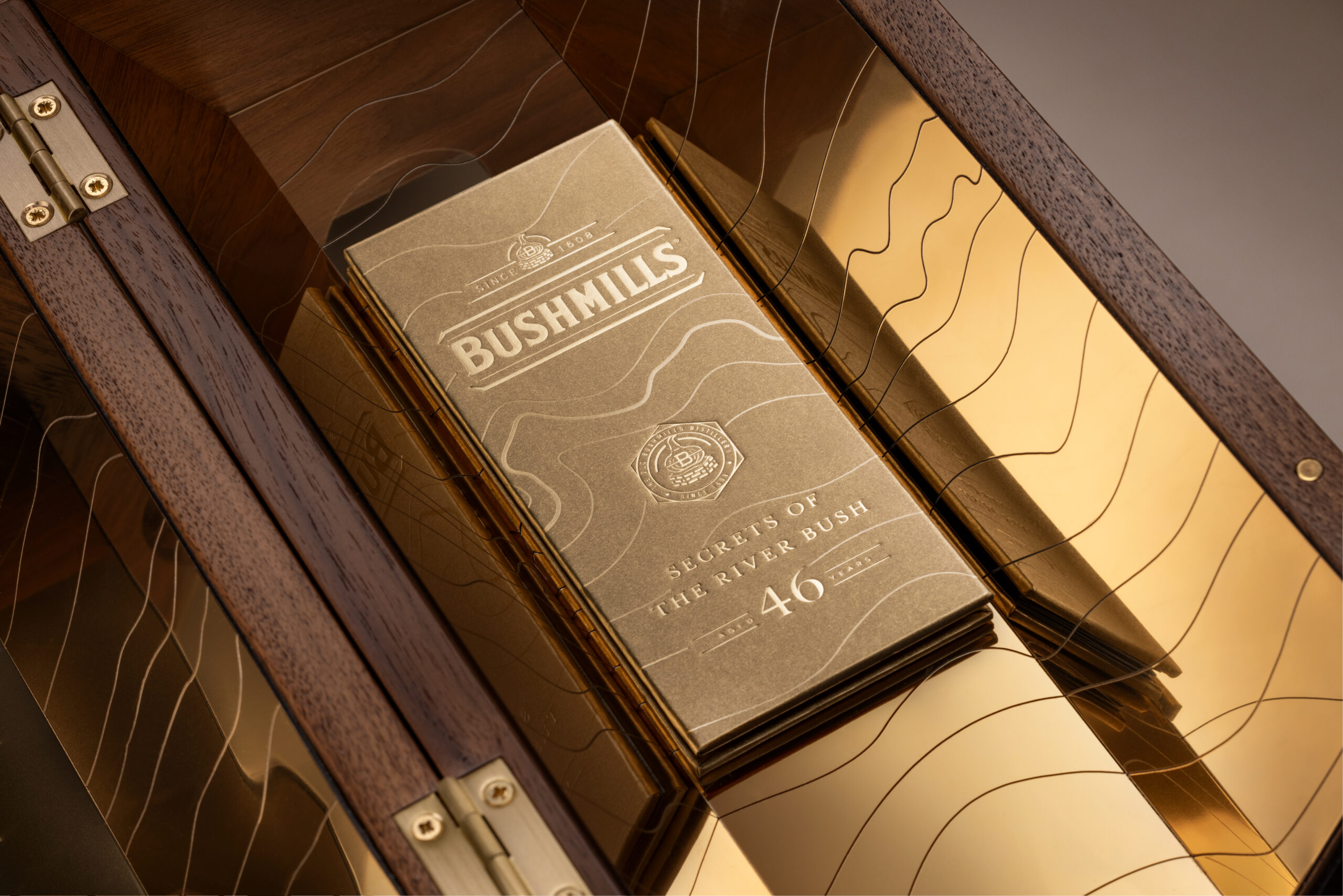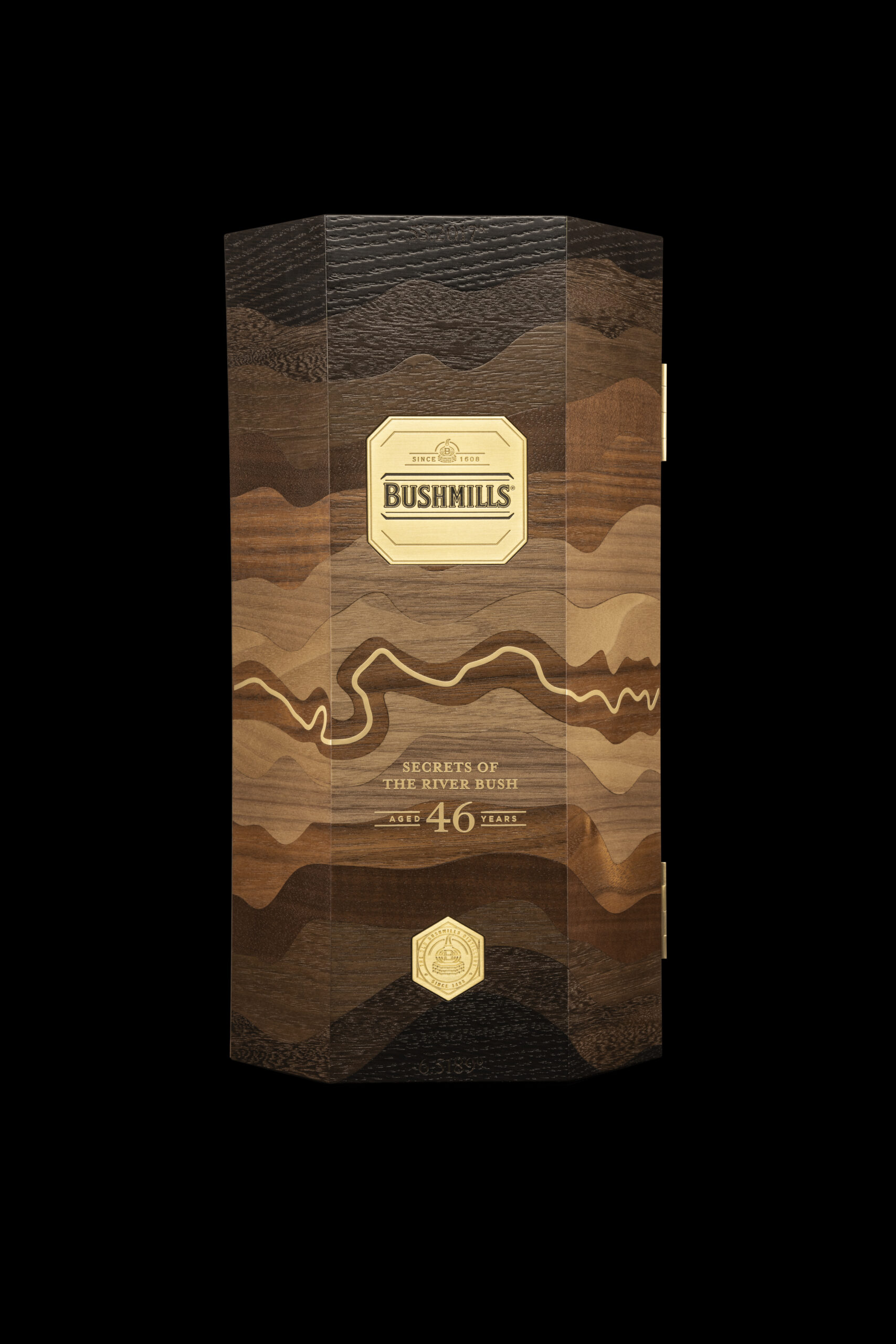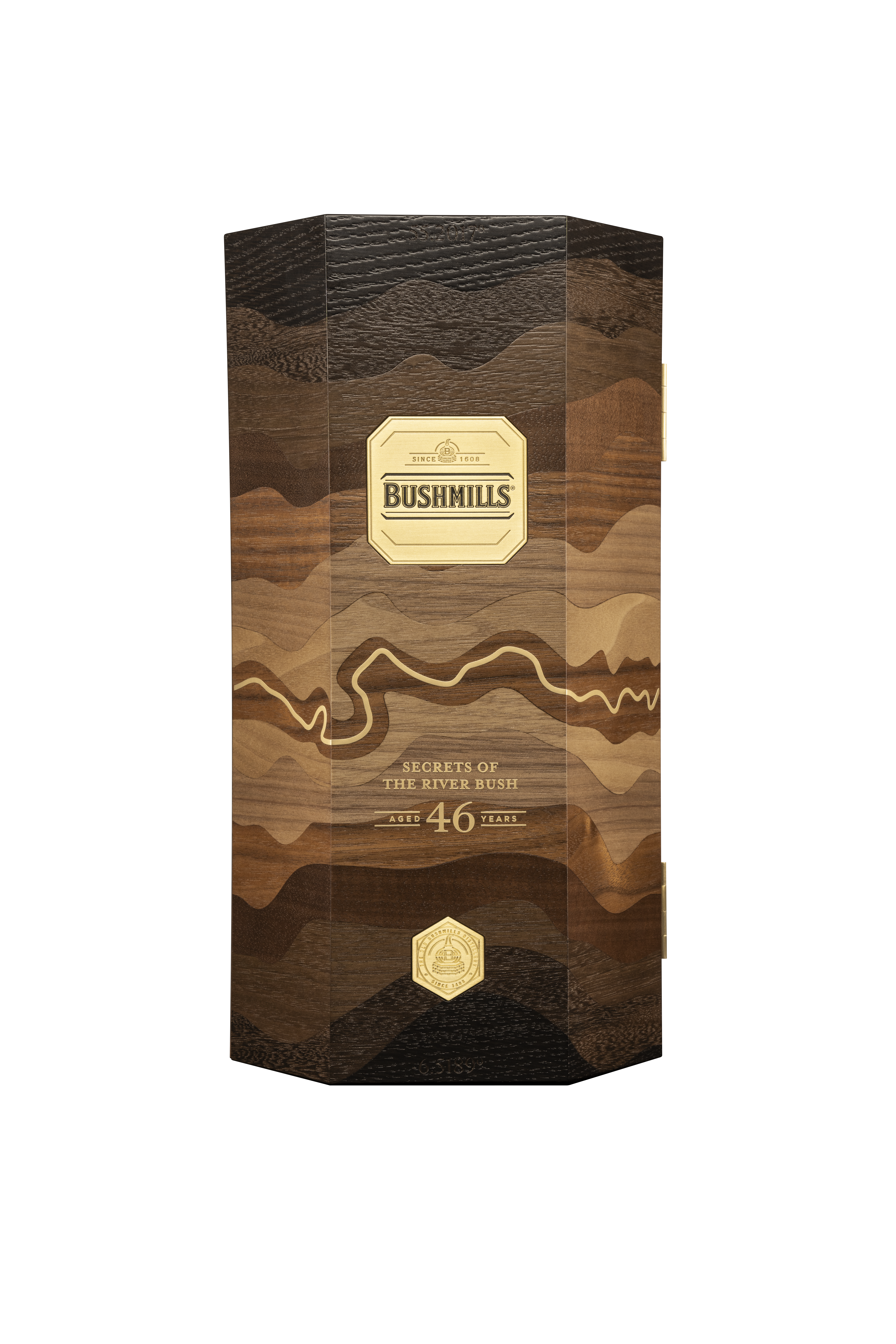 Présenté dans un coffret hexagonal en noyer, sculpté à la main, le design évoque les reliefs topographiques de la rivière Bush. Une gravure dorée retrace son parcours ancestral jusqu’à la distillerie. L’ensemble, d’une élégance discrète et architecturale, confère à cette édition un statut d’objet de collection autant qu’un joyau de dégustation.