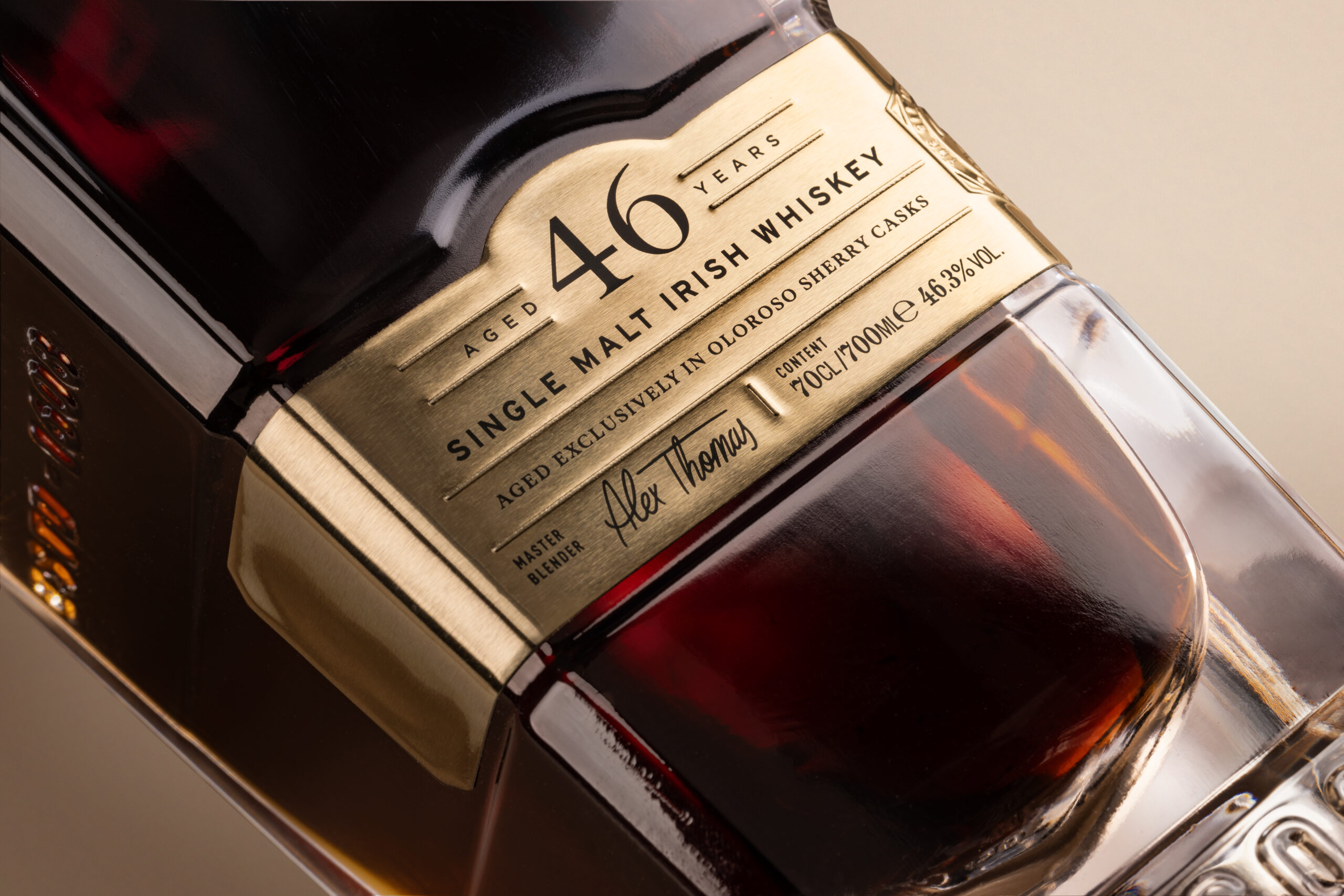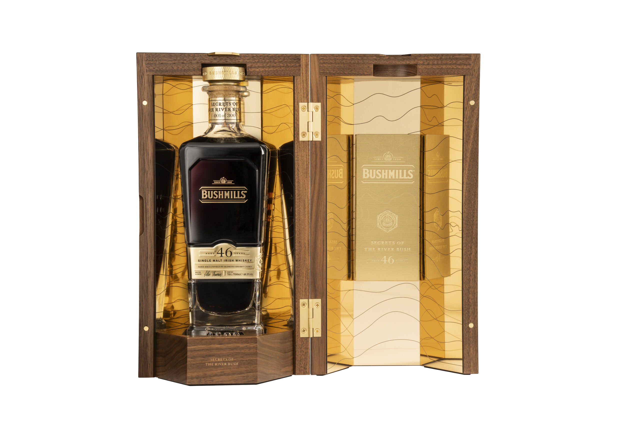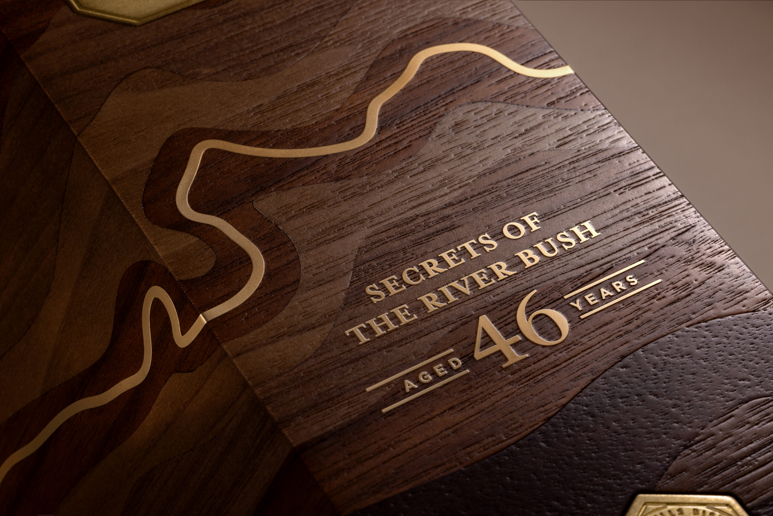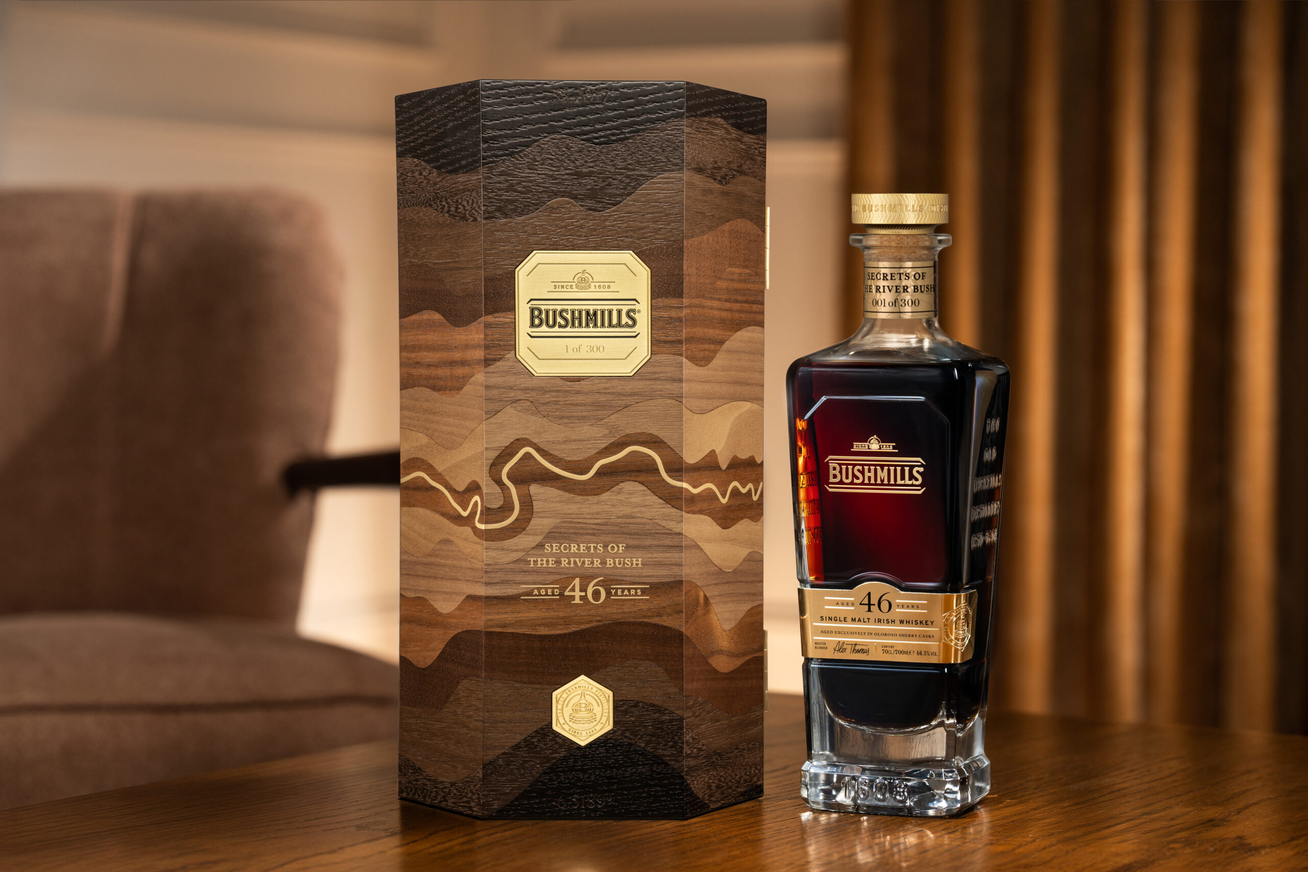 Présenté dans un coffret hexagonal en noyer, sculpté à la main, le design évoque les reliefs topographiques de la rivière Bush. Une gravure dorée retrace son parcours ancestral jusqu’à la distillerie. L’ensemble, d’une élégance discrète et architecturale, confère à cette édition un statut d’objet de collection autant qu’un joyau de dégustation.