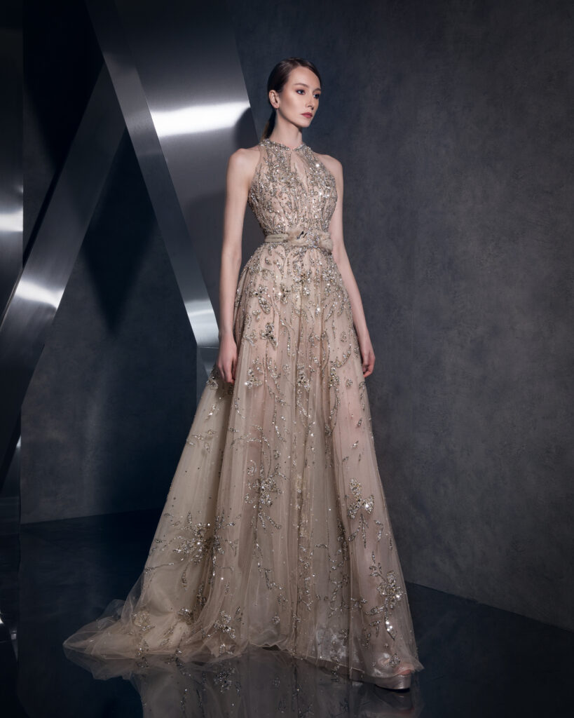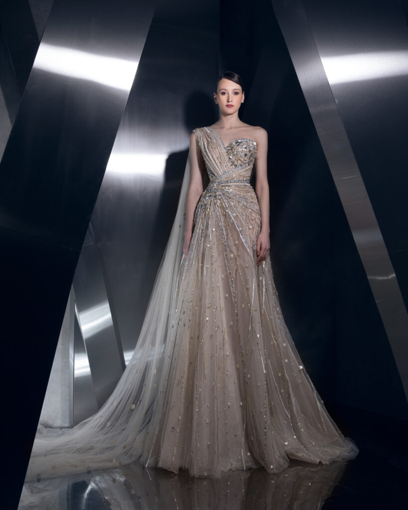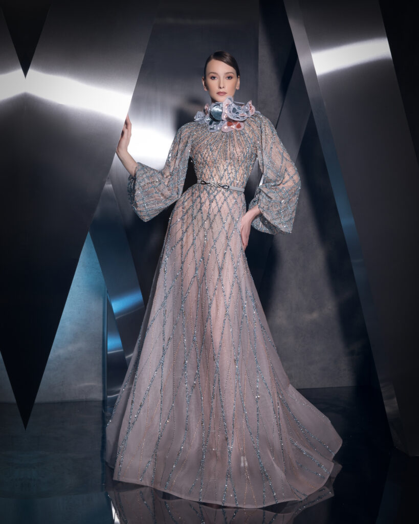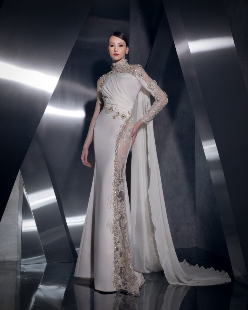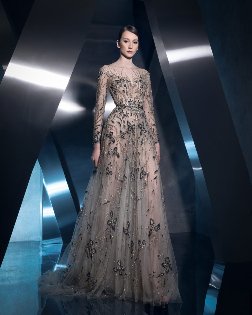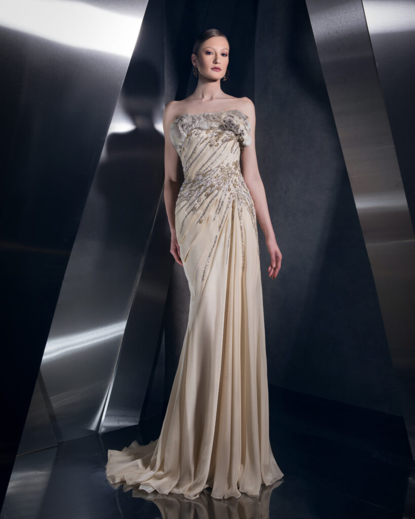 L’élégance du geste s’exprime dans chaque détail : mousselines brodées à la main, crêpes somptueuses, tulles finement travaillés. Des fourrures subtiles viennent rehausser certaines silhouettes sans jamais altérer leur légèreté, instaurant une chaleur contenue, un luxe feutré. Les finitions, précises, convoquent le regard sans l’imposer.