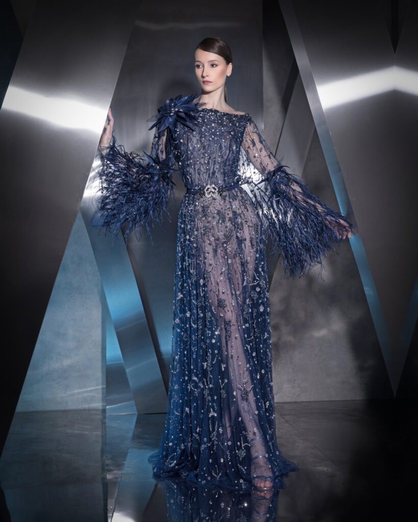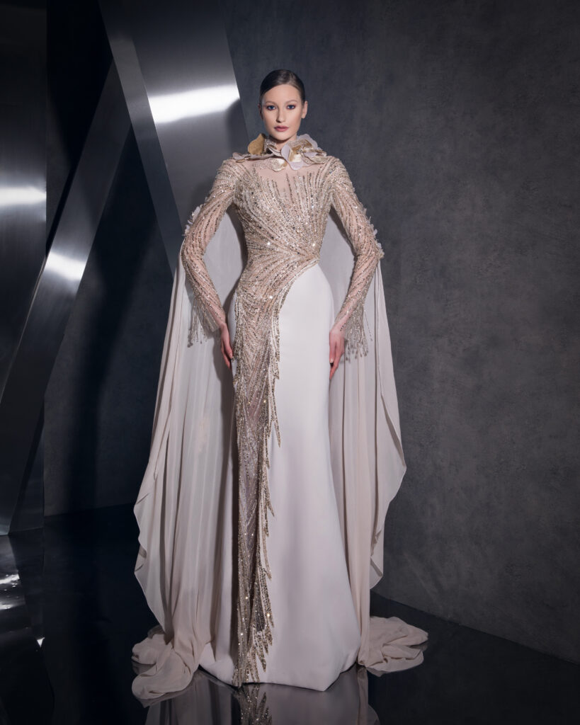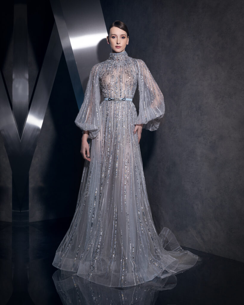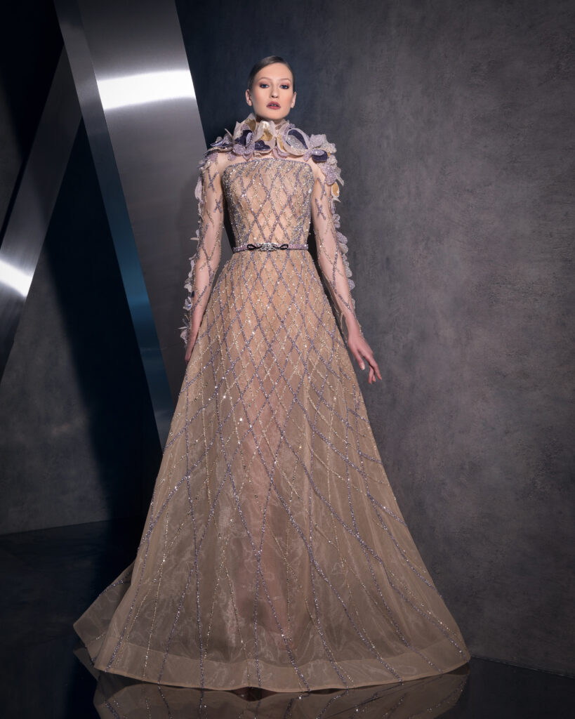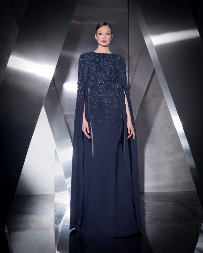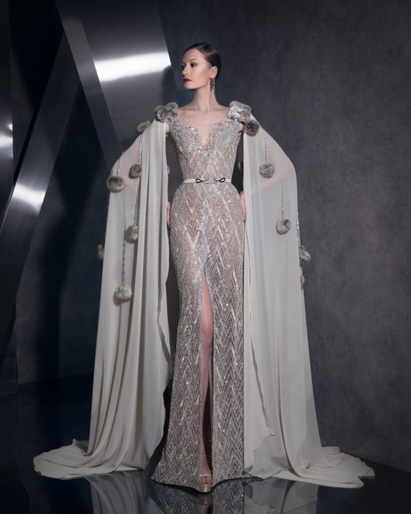 L’élégance du geste s’exprime dans chaque détail : mousselines brodées à la main, crêpes somptueuses, tulles finement travaillés. Des fourrures subtiles viennent rehausser certaines silhouettes sans jamais altérer leur légèreté, instaurant une chaleur contenue, un luxe feutré. Les finitions, précises, convoquent le regard sans l’imposer.