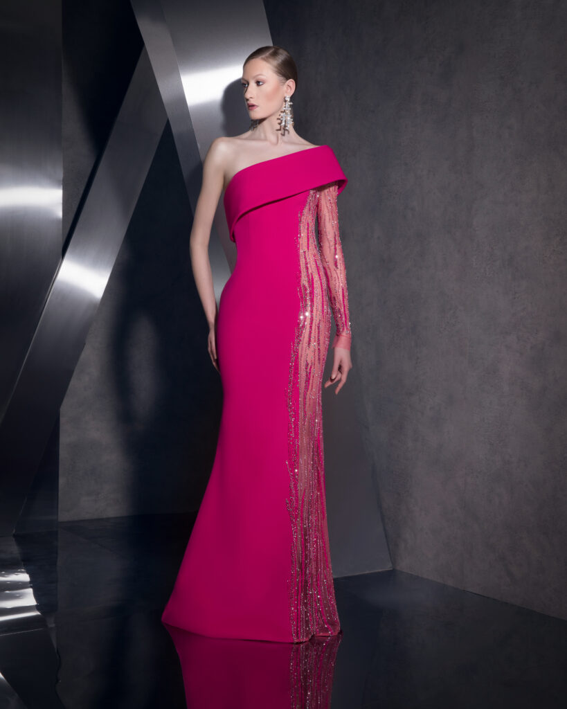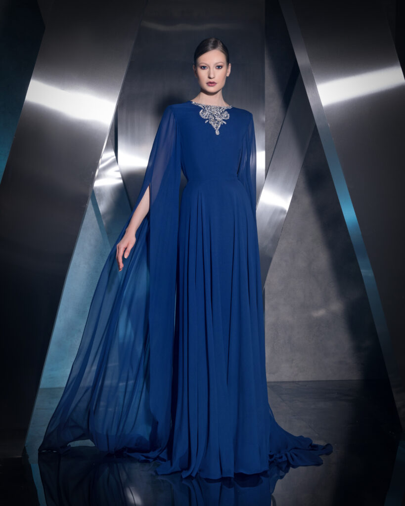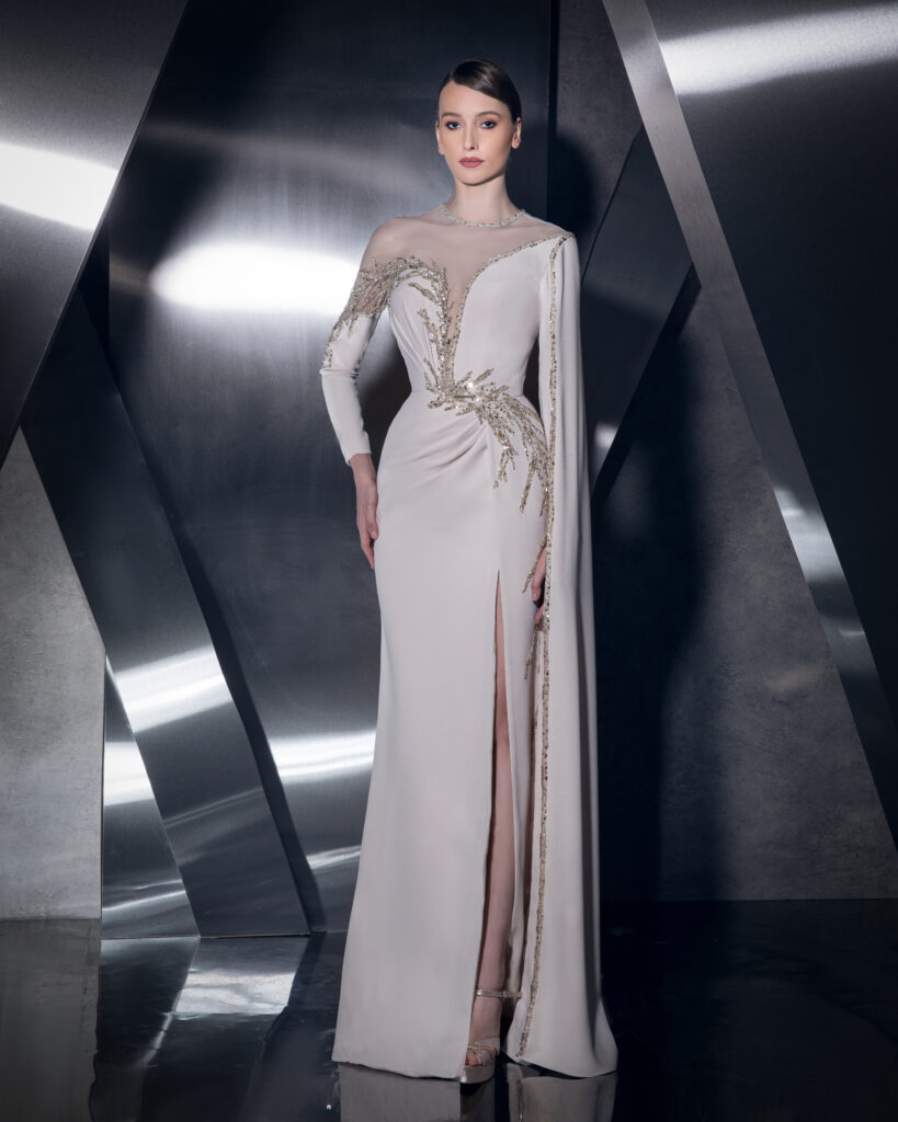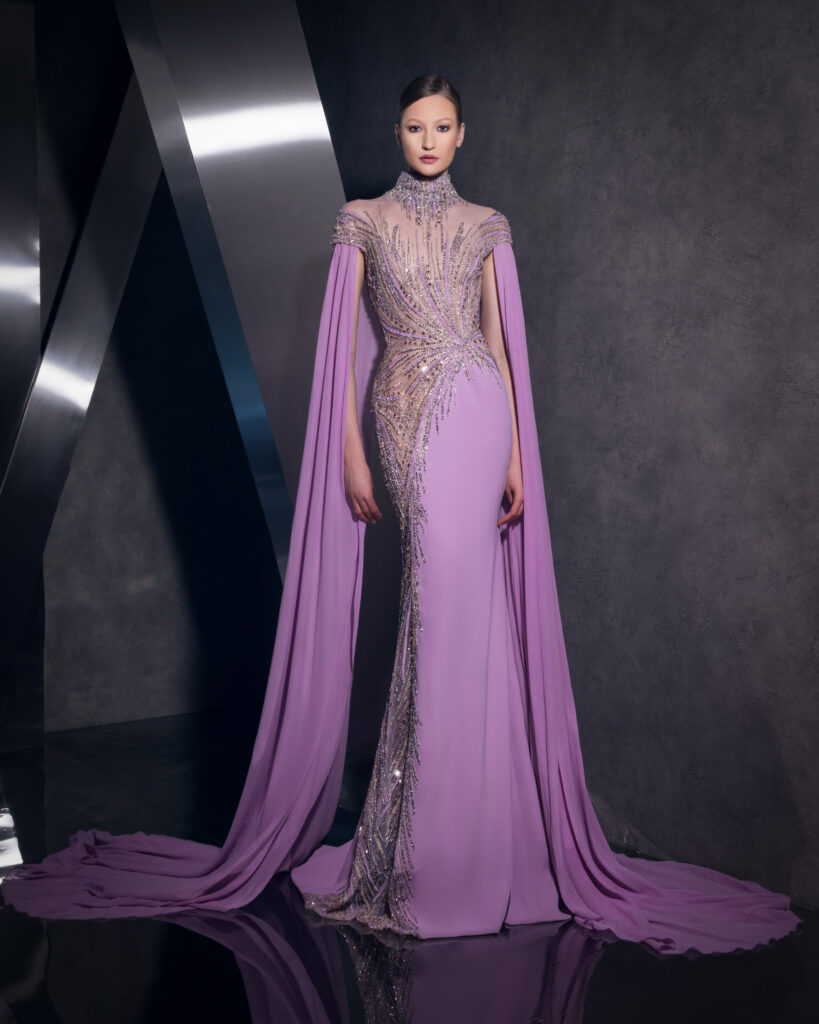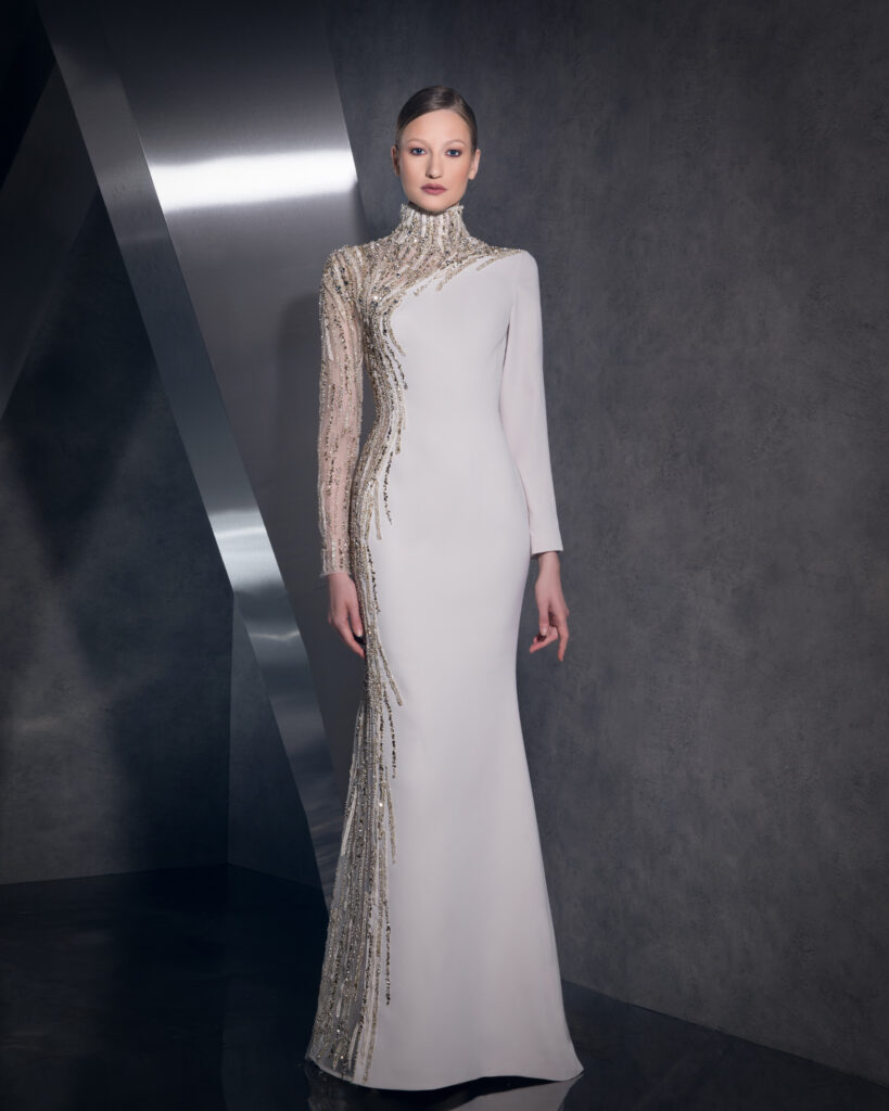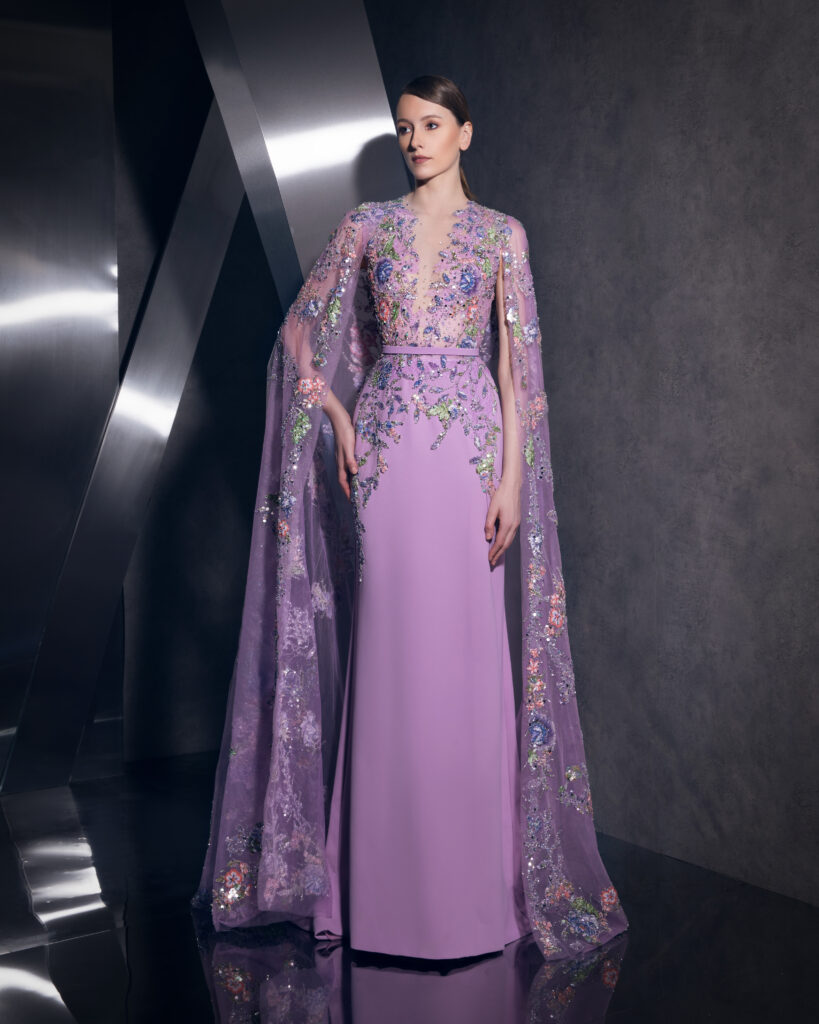 L’élégance du geste s’exprime dans chaque détail : mousselines brodées à la main, crêpes somptueuses, tulles finement travaillés. Des fourrures subtiles viennent rehausser certaines silhouettes sans jamais altérer leur légèreté, instaurant une chaleur contenue, un luxe feutré. Les finitions, précises, convoquent le regard sans l’imposer.
