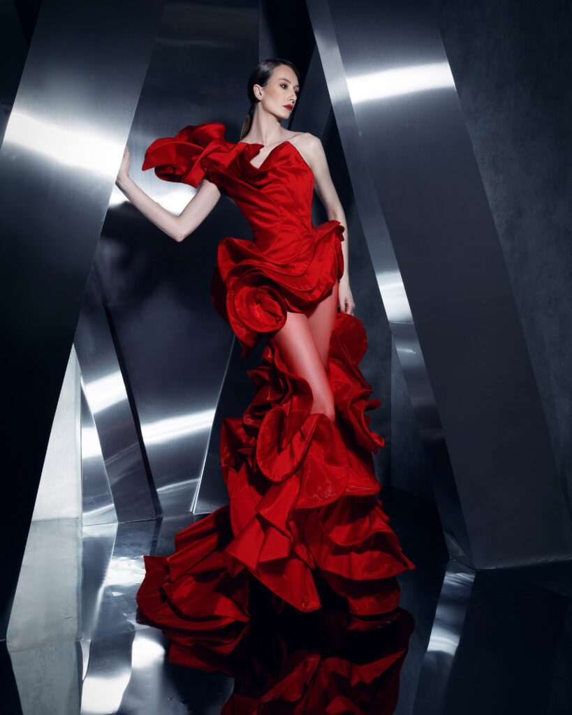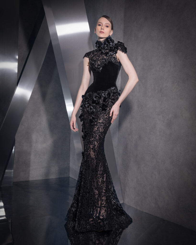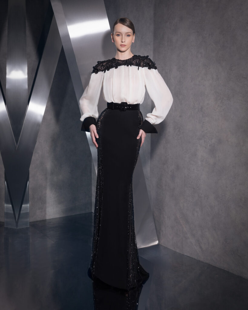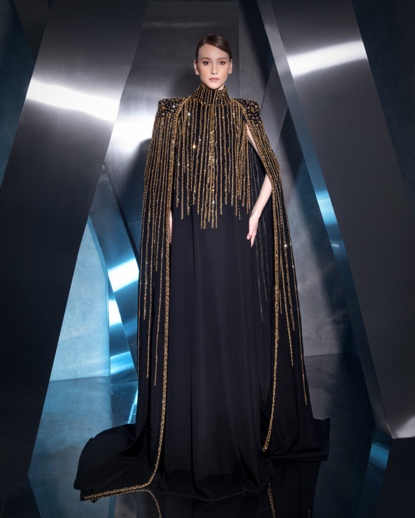 Chaque silhouette est pensée comme un mouvement d’une composition globale. Rien n’est laissé au hasard. Le résultat : une collection qui se lit comme un poème symphonique, où chaque look répond à l’autre, dans un dialogue de textures, de lumières et d’intentions.