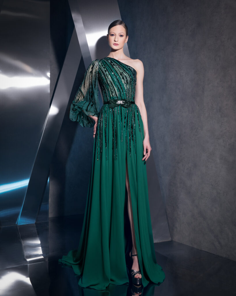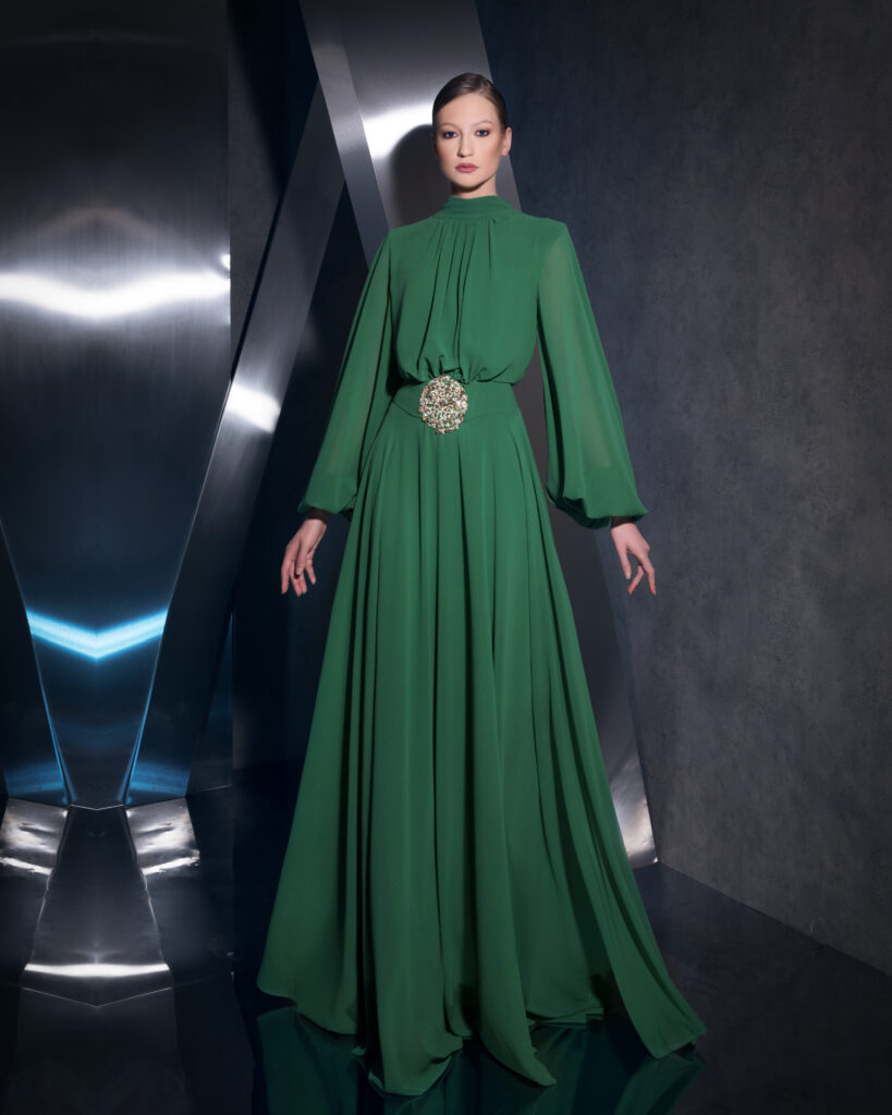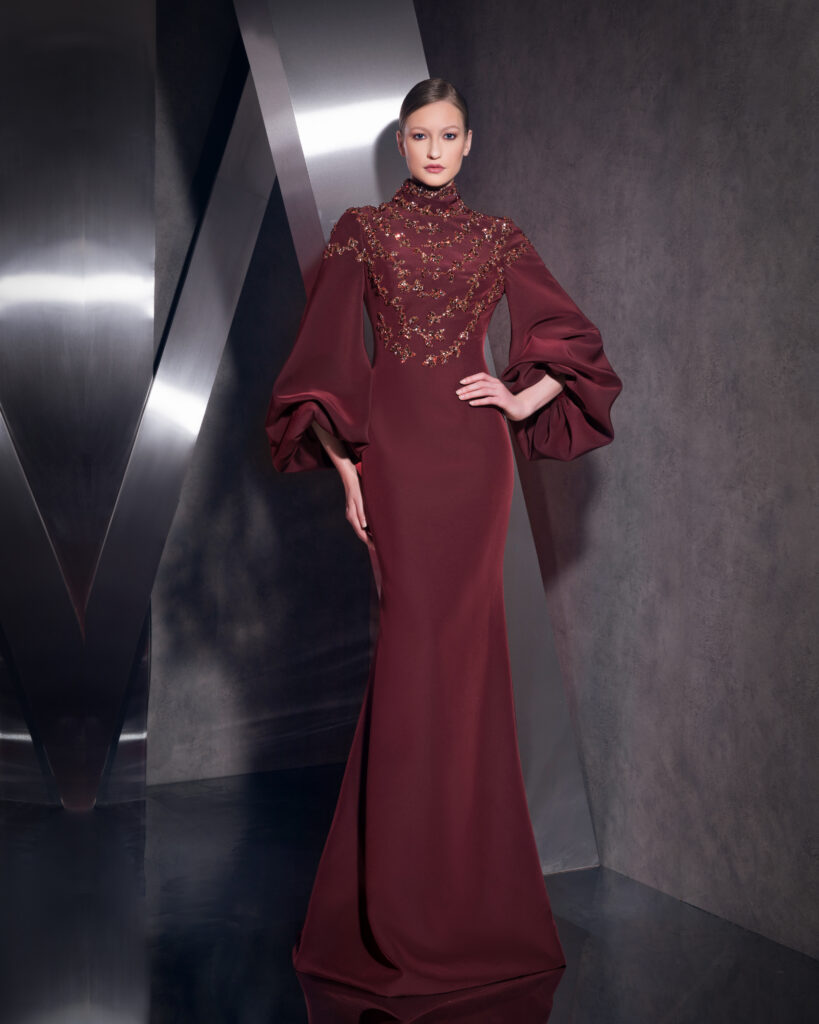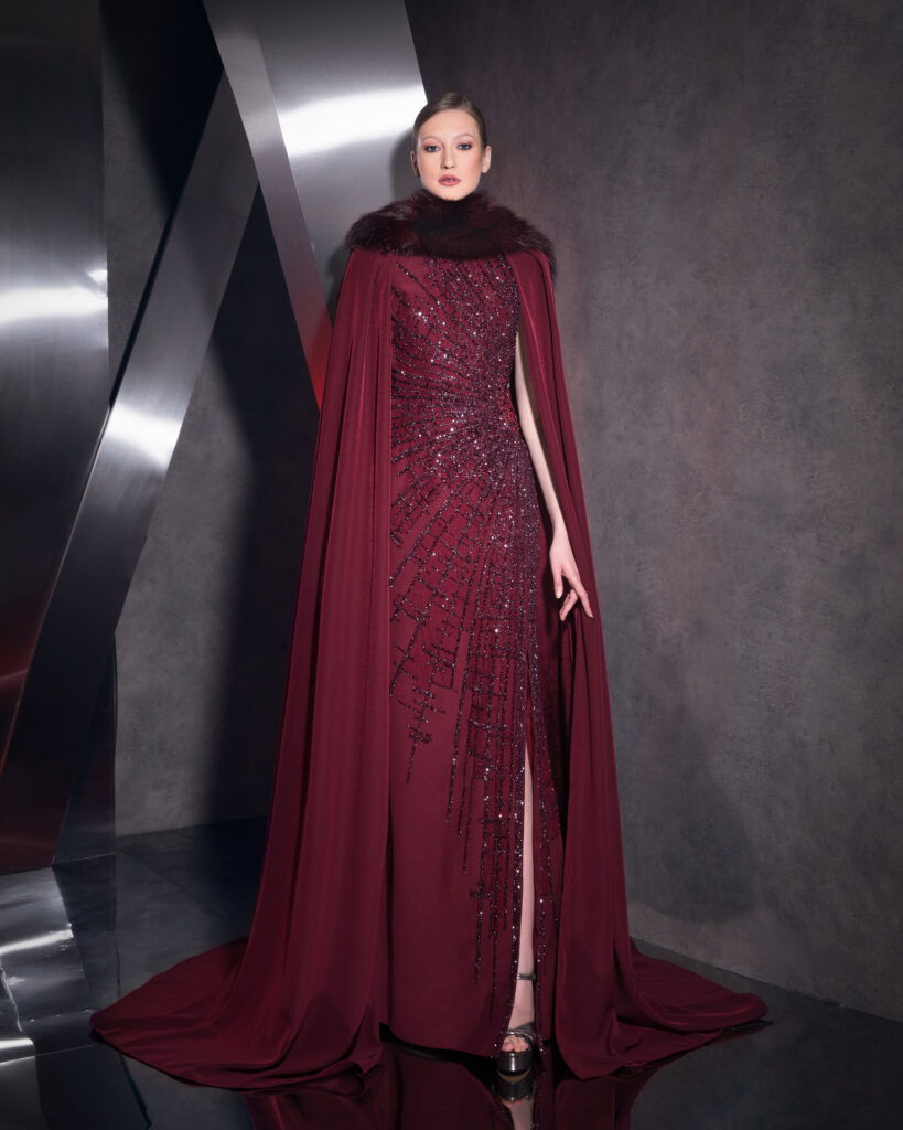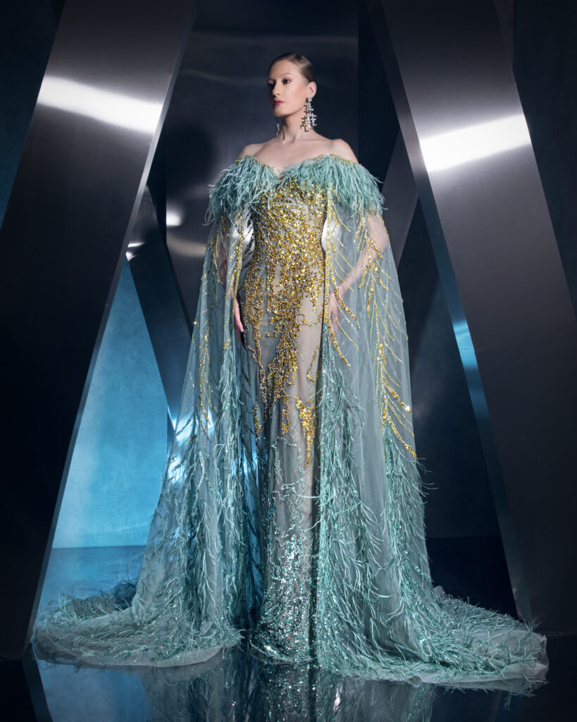Les coupes racontent une féminité affirmée, aux accents néo-romantiques. Manches bouffantes théâtrales, capes flottantes et cols montants dessinent des figures à la fois souveraines et sensuelles. Des ceintures soulignent la taille, comme une signature rythmique récurrente. Sur certaines pièces, plumes ou fleurs délicatement apposées sur les manches ou le col offrent un souffle artistique qui résonne avec le thème central de l’union.