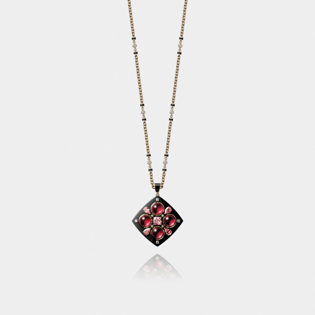En onyx poli à l’éclat de la laque, la boîte évoque le boîtier noir emblématique du fard CHANEL. Sur sa face, quatre cabochons de rubellite (~37,63 carats) forment une croix chromatique, enrichie d’une tourmaline rose taille coussin et de quatre poires (~21,49 carats), organisées selon un schéma byzantin – écho à la passion de Mademoiselle pour les mosaïques et les formes sacrées.