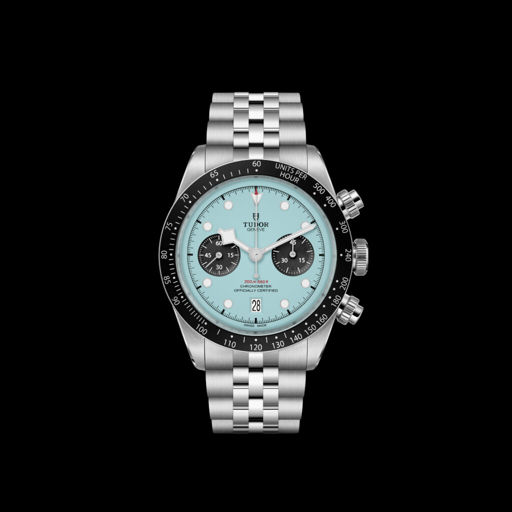 Le cadran bombé “Flamingo Blue”, inédit dans l’univers TUDOR, affiche une teinte turquoise éclatante, contrastée par deux sous-compteurs noirs cerclés et une date à 6 h. Le tout encadré par une lunette fixe en acier 316L avec insert noir mat en aluminium éloxé, gravée d’une échelle tachymétrique argentée.