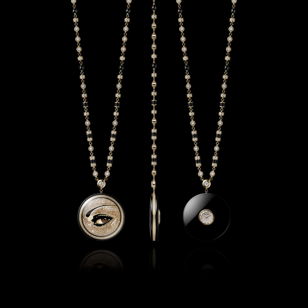 L’objet ne se contente pas de séduire, il fascine. Son écrin : une boîte en titane noire et or jaune 18 carats, sertie de 98 diamants, dialogue avec une chaîne en or jaune ponctuée de 210 diamants, un diamant central de 0,70 carat, et des perles d’onyx. Au total : 842 diamants taille brillant, pour 25,39 carats de pure lumière.