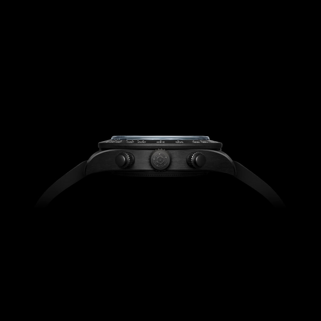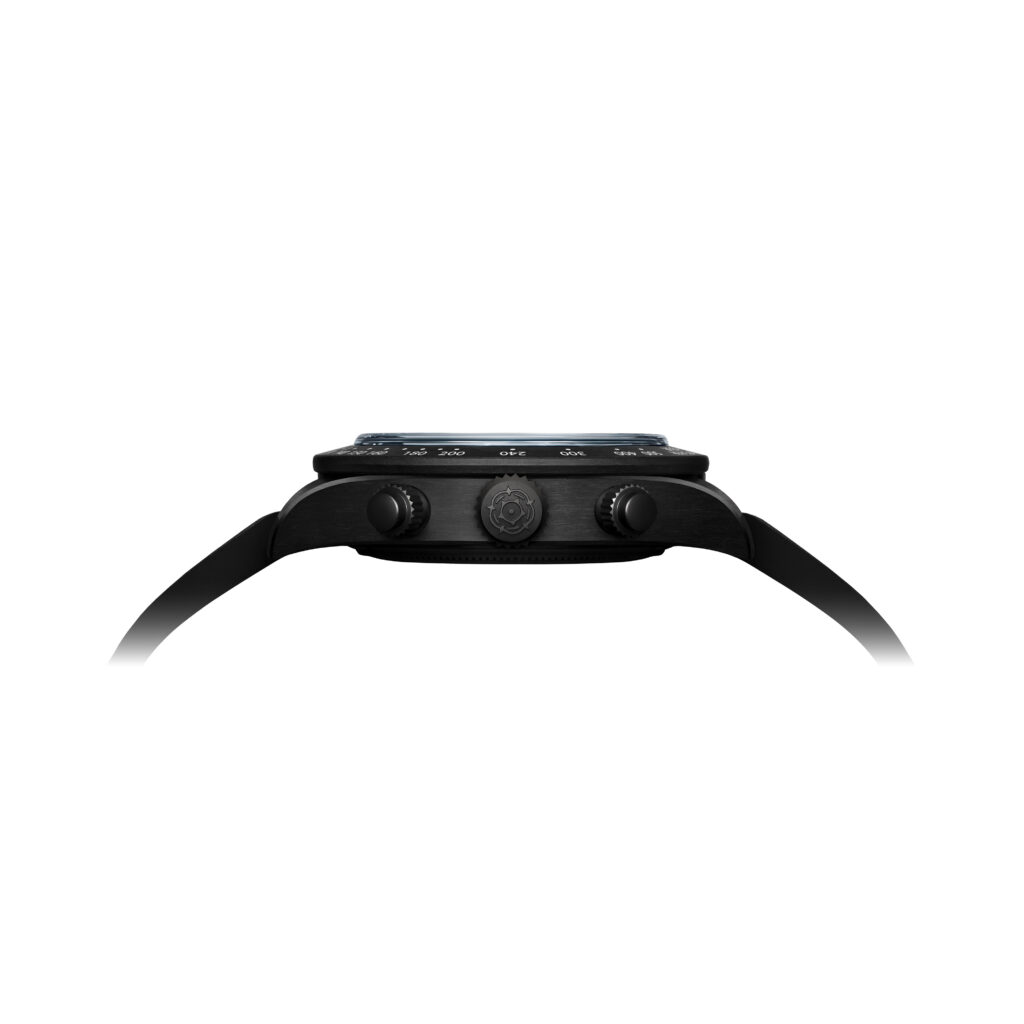 Taillée pour la vitesse, cette édition limitée à 2025 exemplaires se distingue par son boîtier monobloc en fibre de carbone de 42 mm, plus fin que ses homologues en acier, avec lunette fixe tachymétrique en carbone. Les poussoirs vissés et la couronne en titane traité PVD noir assurent une cohérence visuelle et technique sans faille.