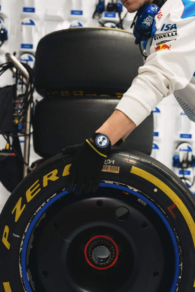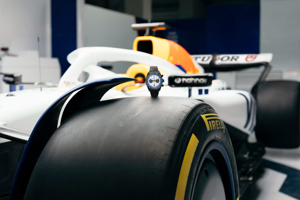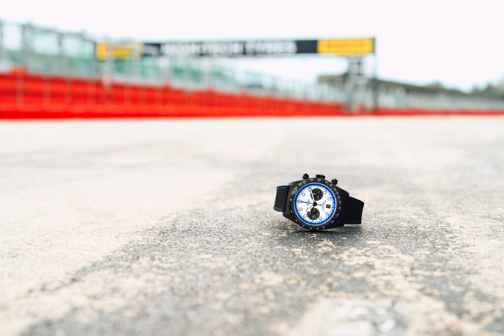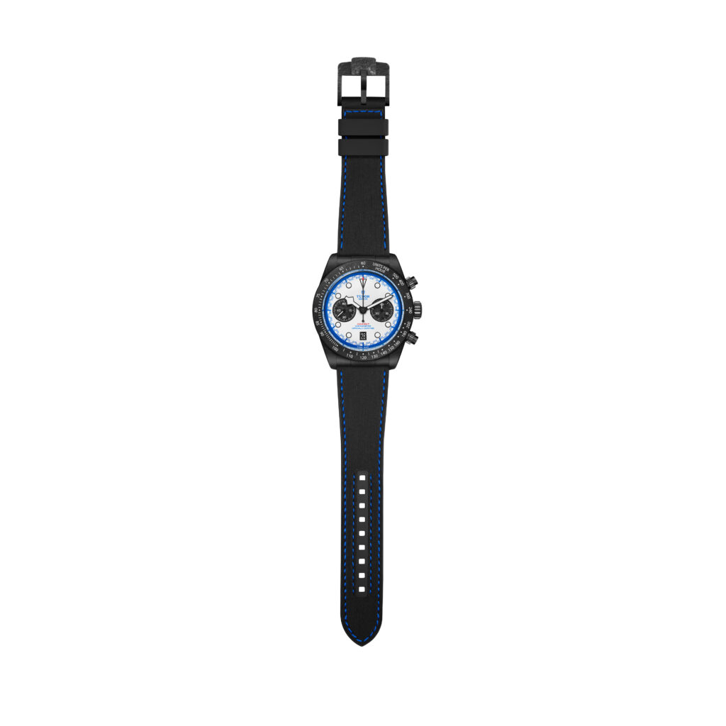 Le cadran “racing white” bombé, inspiré de la livrée 2025 de l’écurie Formula 1® Visa Cash App Racing Bulls, est ponctué de sous-compteurs en fibre de carbone, tandis que les aiguilles Snowflake noires sont recouvertes de Super-LumiNova® grade A pour une lisibilité maximale.