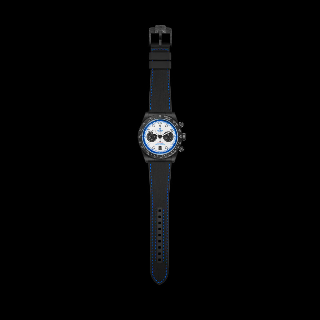 Le bracelet hybride cuir-caoutchouc à motif “pneu”, fixé par des attaches en fibre de carbone, parachève ce concentré de sportivité. La montre est étanche jusqu’à 200 m, tout en offrant un confort quotidien inégalé grâce à sa légèreté.