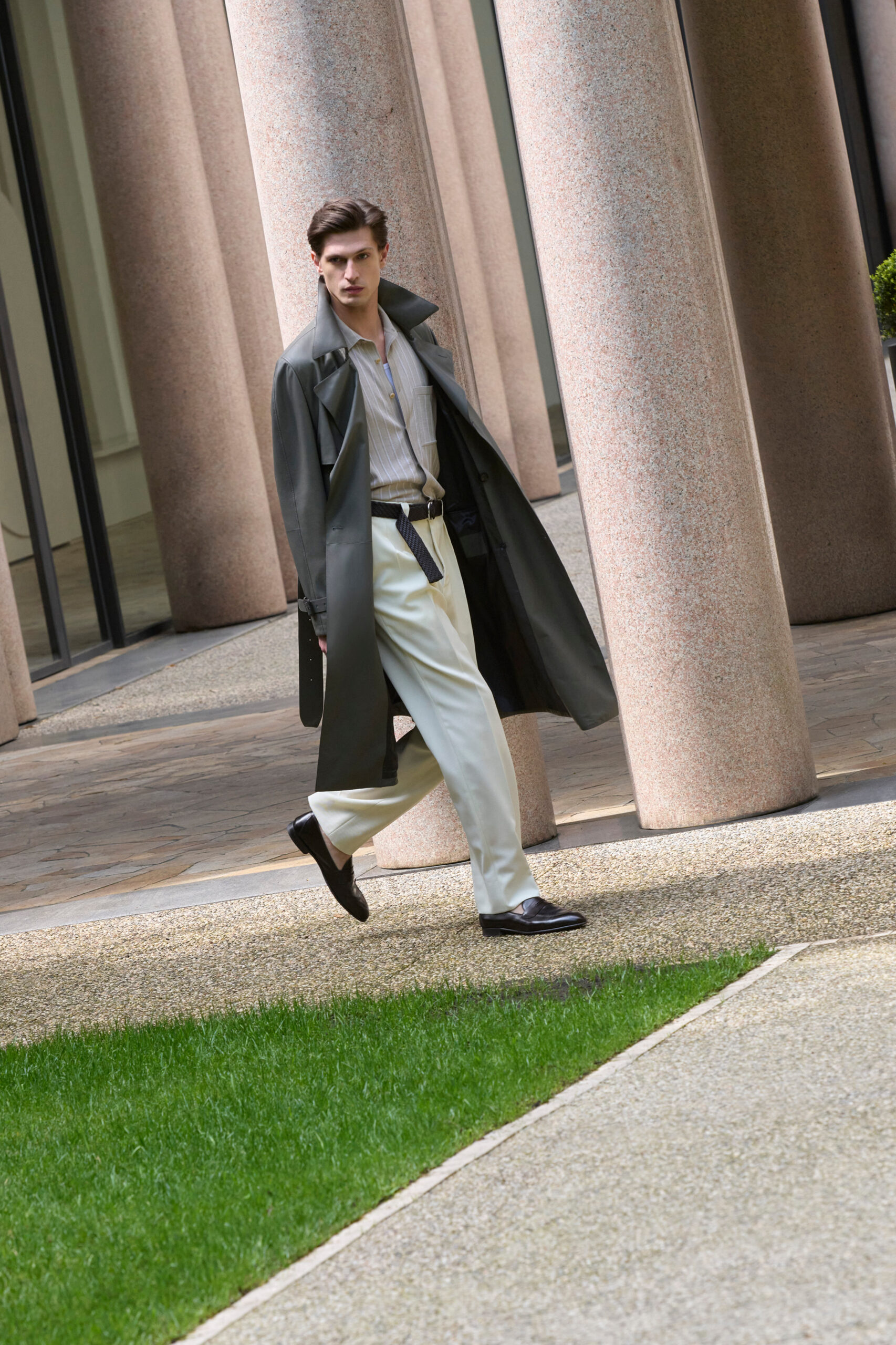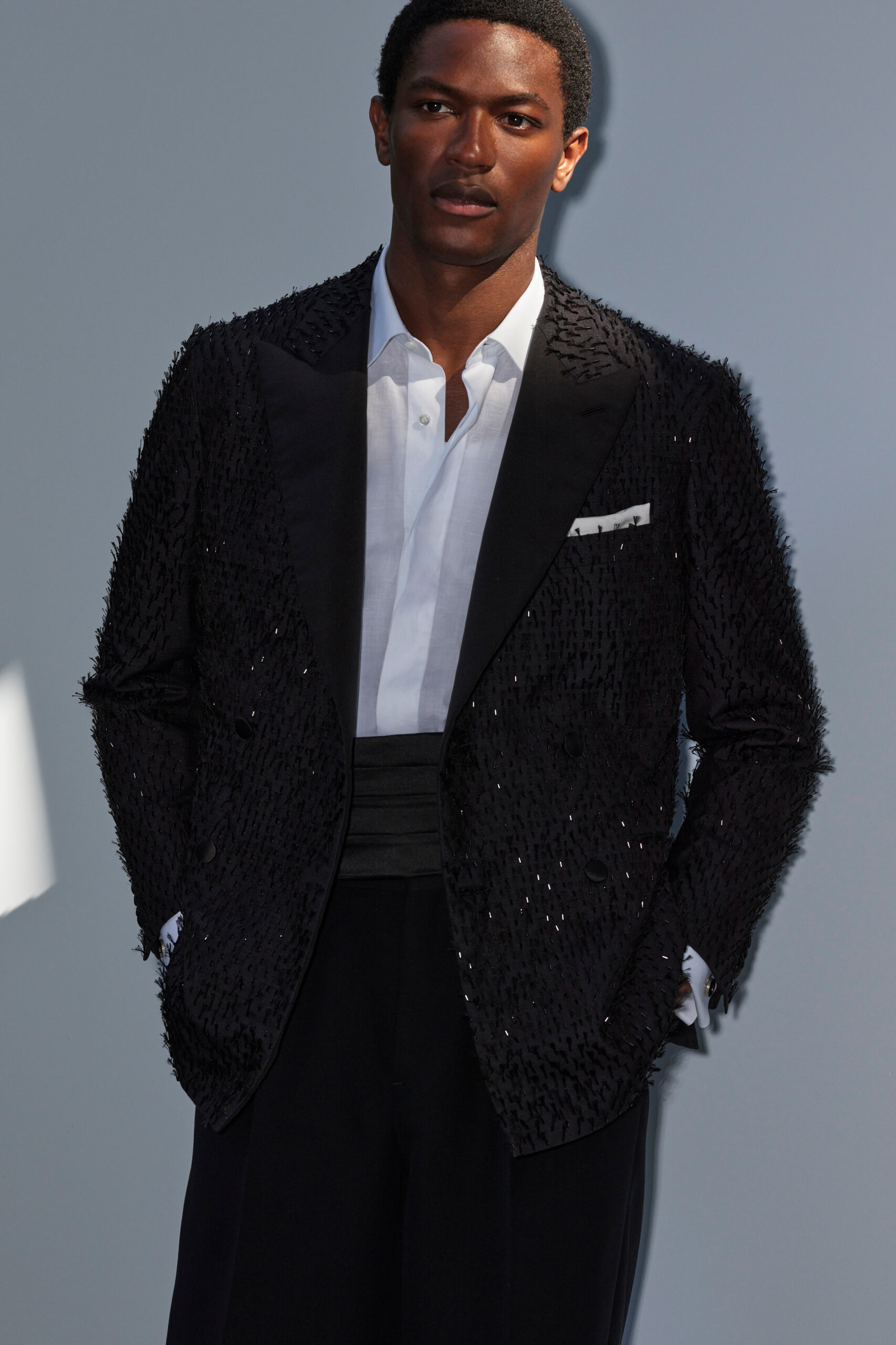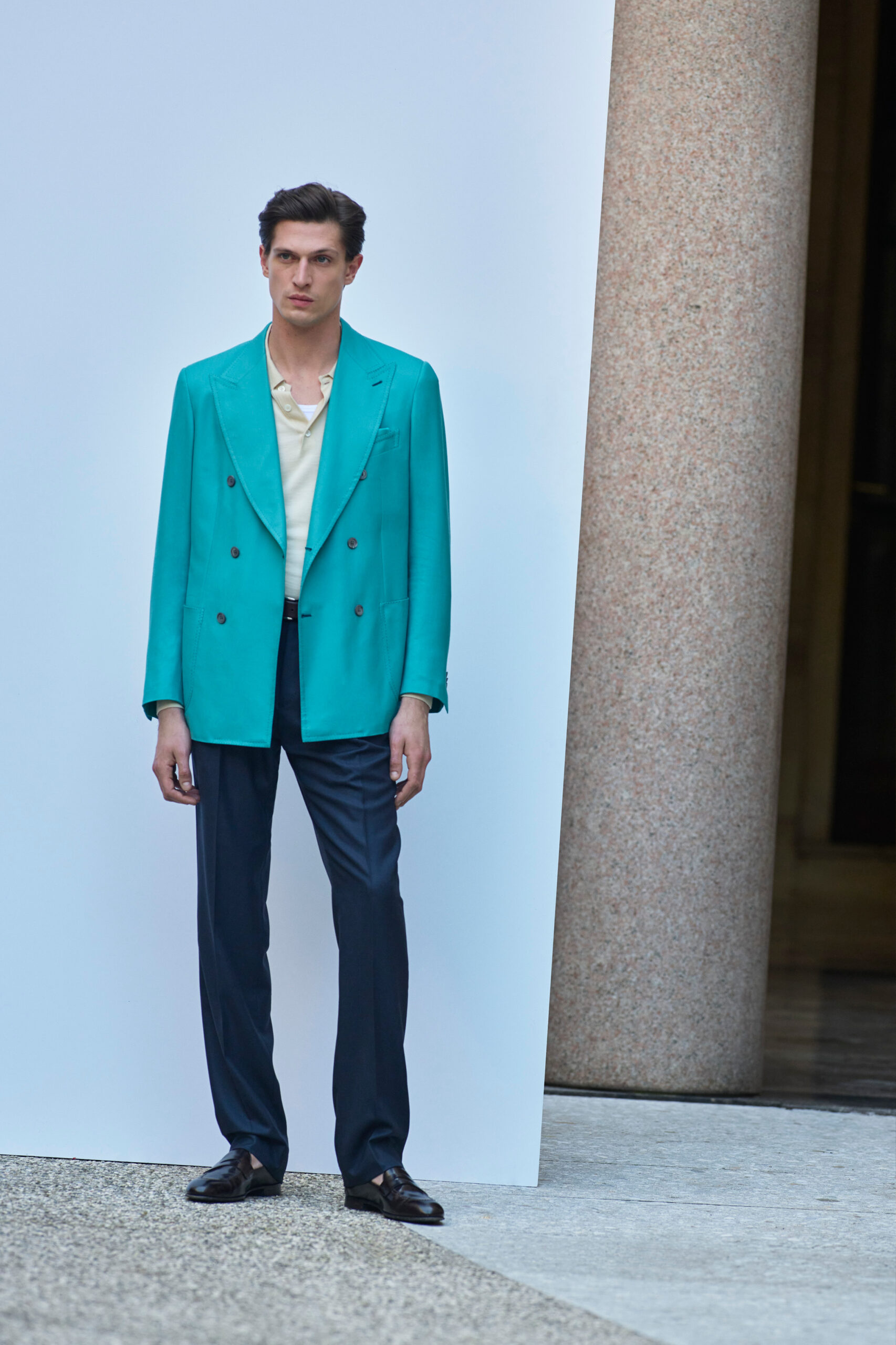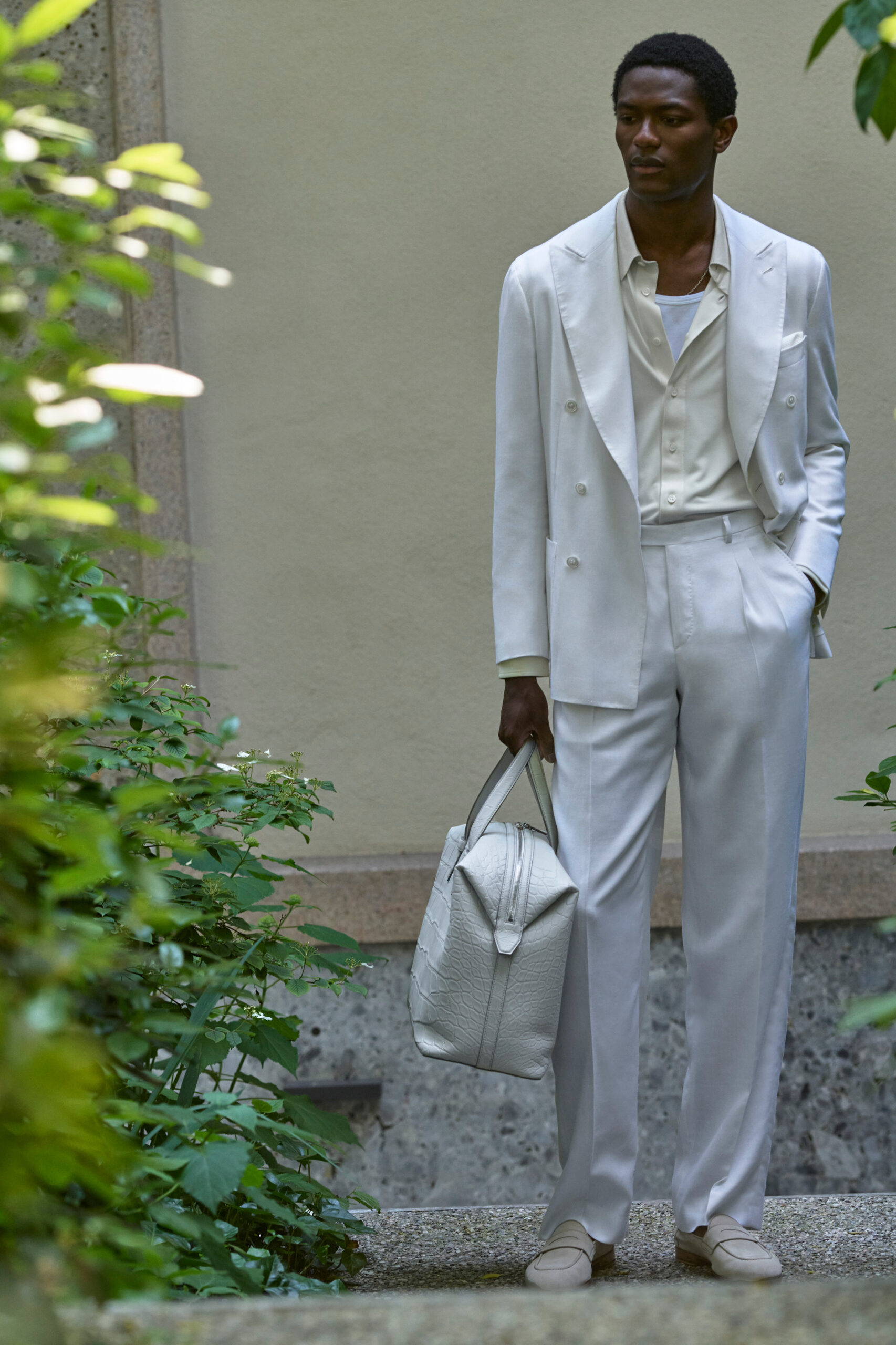 Pensée comme une garde-robe essentielle pour l’homme contemporain, la proposition de Brioni se décline à travers quarante-deux silhouettes où chaque teinte bleue devient un signe de style, une expression de soi. La palette s’enrichit de blancs éclatants, de gris perle, de noirs sobres et de touches vives inattendues, pour mieux révéler la subtilité des contrastes.