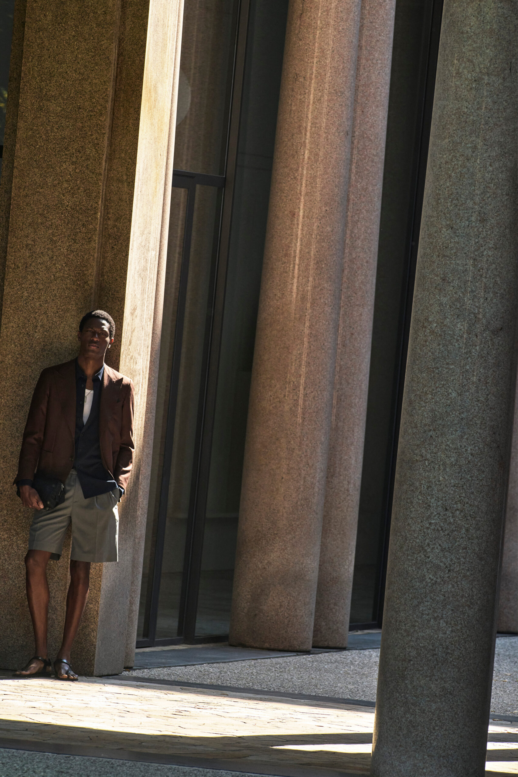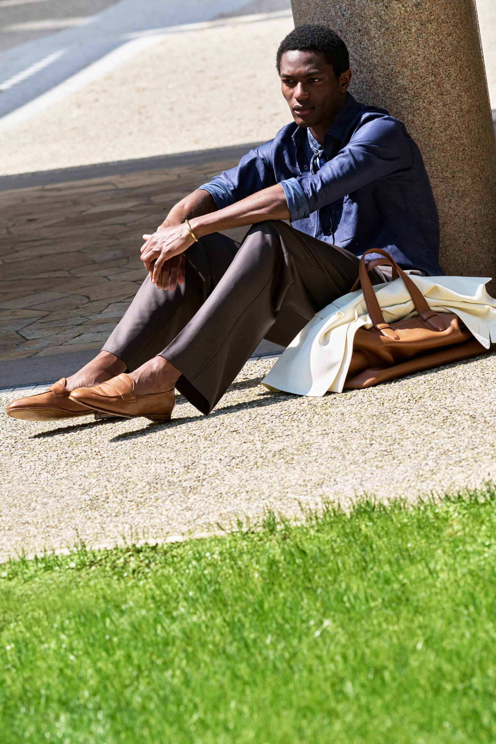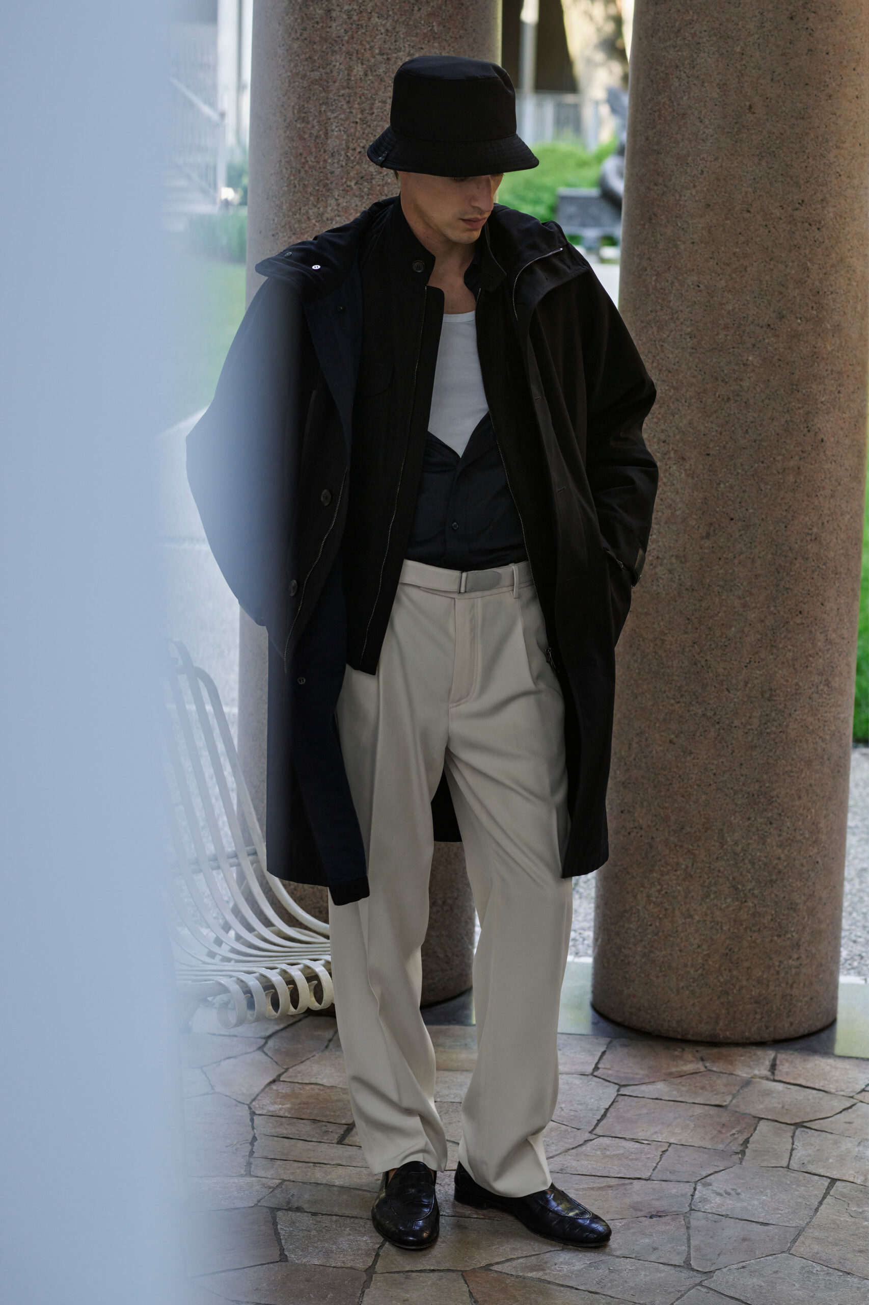 Les matières – véritables héroïnes silencieuses de la collection – évoquent la sensualité du toucher et la fluidité du mouvement : laine ultra-fine, lin vaporeux, soie lavée, coton souple, crêpe aéré. Ces tissus nobles, sélectionnés avec exigence, accompagnent des coupes parfaitement maîtrisées, entre décontraction étudiée et rigueur sartoriale. Blazers non doublés, pantalons à pinces légèrement fuselés, sahariennes revisitées, manteaux légers ou chemises à col officier se déclinent dans des volumes fluides, dessinant une silhouette aussi élégante que naturelle.
