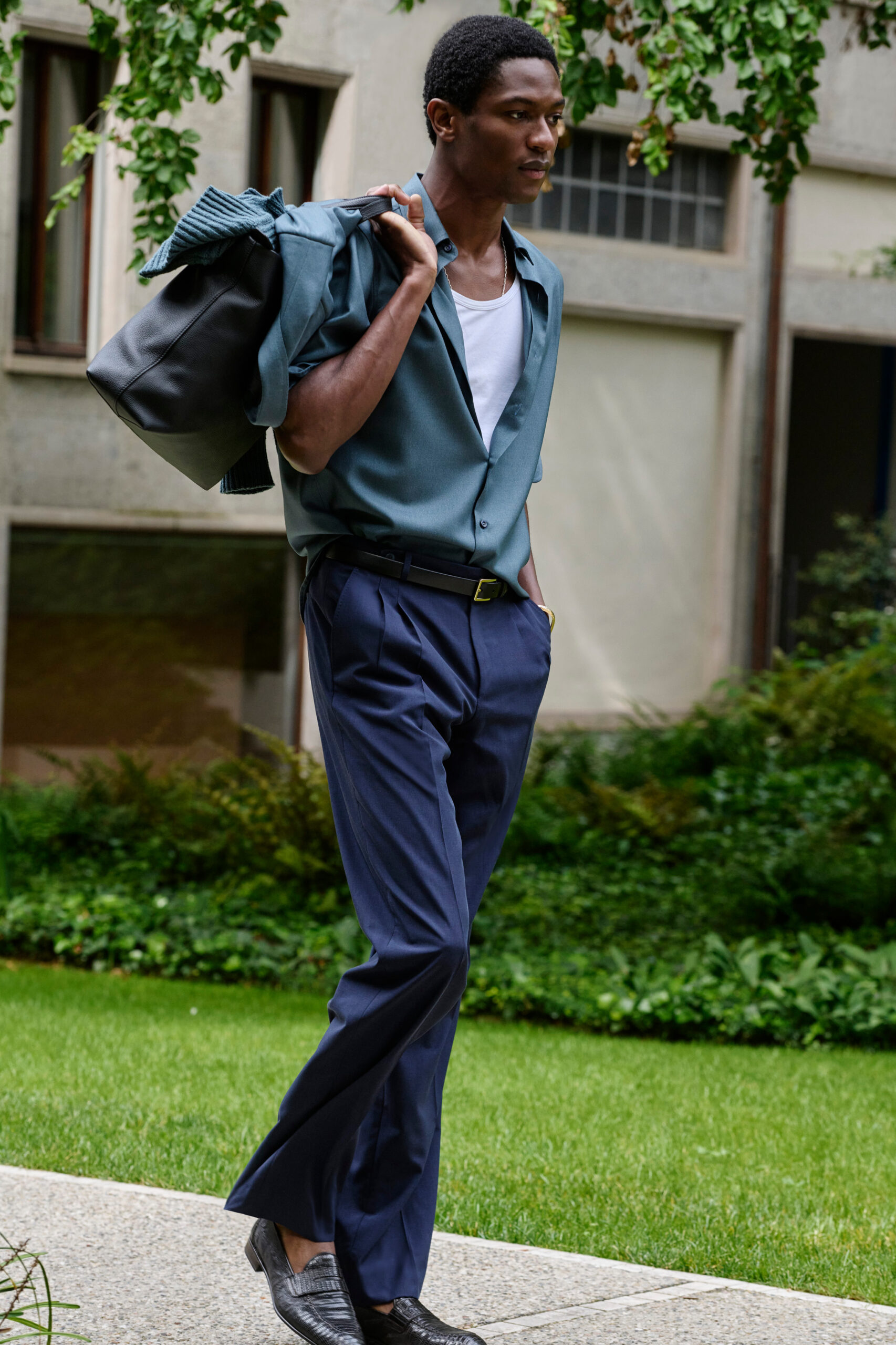 La collection suggère une sophistication sans ostentation, où l’art du tailoring romain s’exprime avec légèreté. Chaque look, du plus formel au plus décontracté, devient une exploration nuancée de la couleur bleue : un costume en serge marine se juxtapose à une chemise bleu ciel en voile de coton, tandis qu’un ensemble en lin indigo dialogue avec des accessoires en cuir naturel ou en daim poudré.