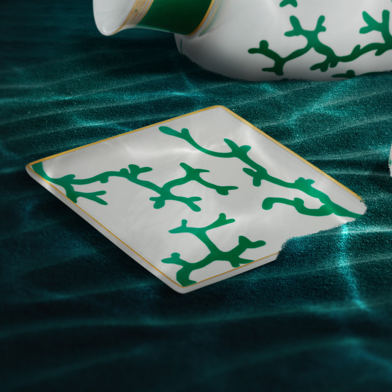 Chaque pièce de la collection est façonnée avec précision : d’abord, la forme est tournoyée sur la porcelaine fine de Limoges, au blanc immaculé, puis modelée et calibrée pour un équilibre parfait entre élégance et ergonomie. La main experte des peintres intervient ensuite pour déposer les camaïeux et nuances, selon un savant équilibre entre spontanéité artistique et rigueur technique. Les couleurs, appliquées à la main et parfois rehaussées de légers accents dorés, révèlent une texture visuelle délicieusement organique : l’œil découvre un motif à chaque regard, comme on explorerait un paysage exotique.