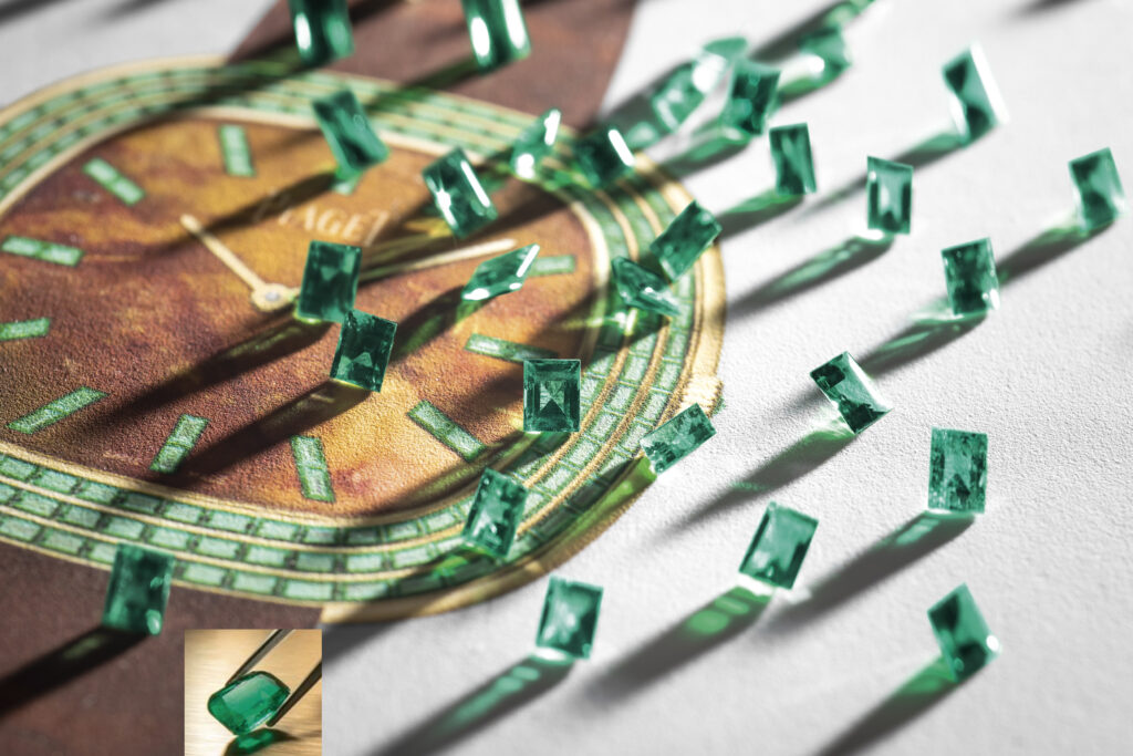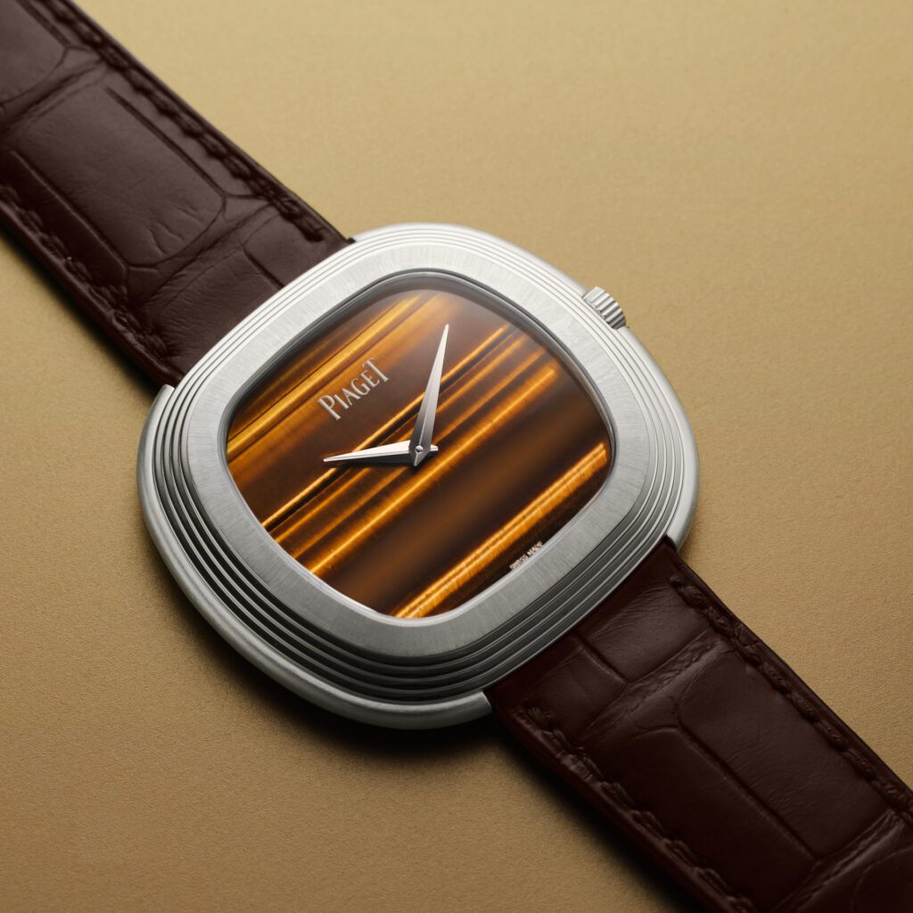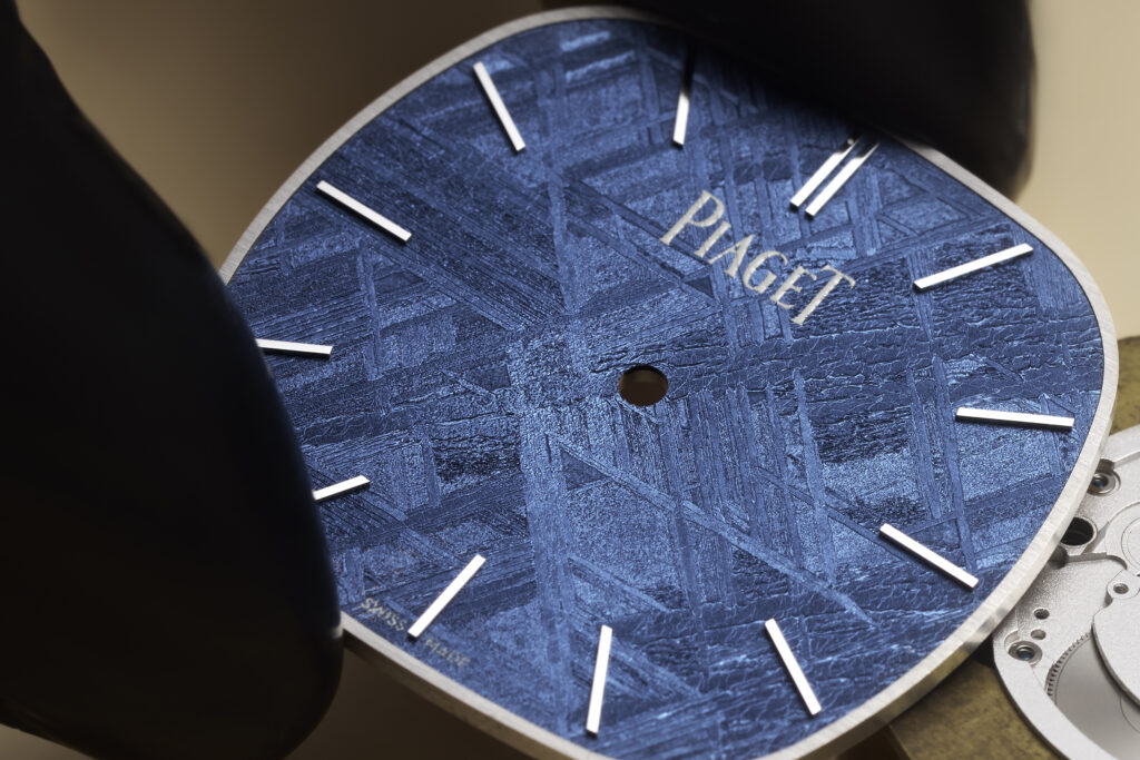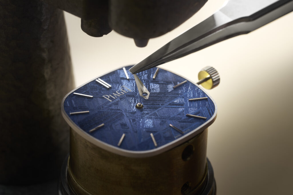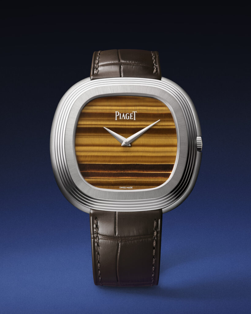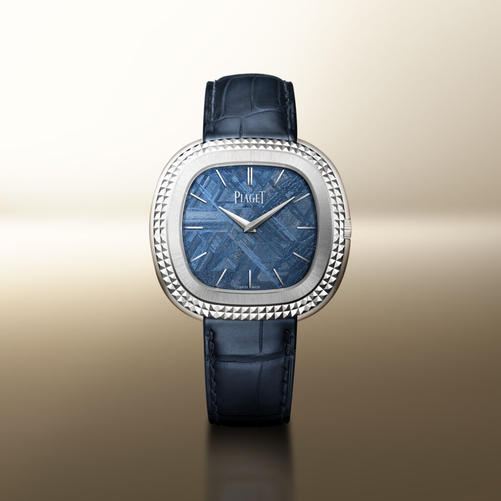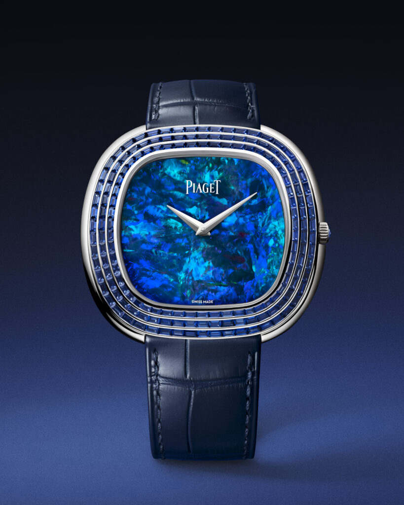 À cette version opale s’ajoutent d’autres itérations : cadran en œil-de-tigre aux stries dorées sur fond ambré, cadran en météorite bleu dans un décor Clou de Paris, et d’autres variantes en météorite verte ou blanche. Ces pièces, alimentées par le mouvement automatique Piaget 501P1, peuvent être personnalisées : aiguilles dauphines ou bâtons, bracelet en cuir dans cinq teintes, or blanc ou rose, 10 cadrans ornementaux.