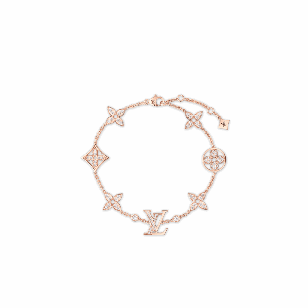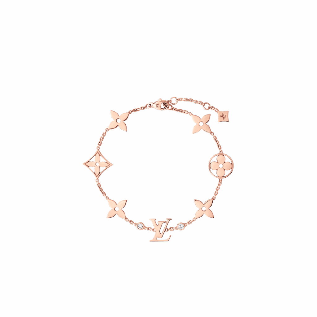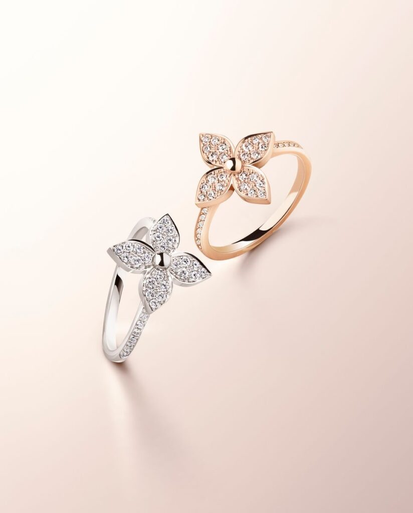 Parmi les nouveaux bracelets, l’un se révèle épuré, ciselé dans l’or rose et ponctué de deux diamants sertis clos, tandis que deux autres, en or rose et or blanc, captent la lumière grâce à un pavage scintillant de diamants. Les initiales LV, quant à elles, s’animent d’un contraste sophistiqué entre l’éclat des gemmes et le poli de l’or. Enfin, une bague en or rose est couronnée de quatre pétales élancés entièrement sertis de diamants. Autant de créations contemporaines qui renforcent l’aura intemporelle de ce symbole d’exception.