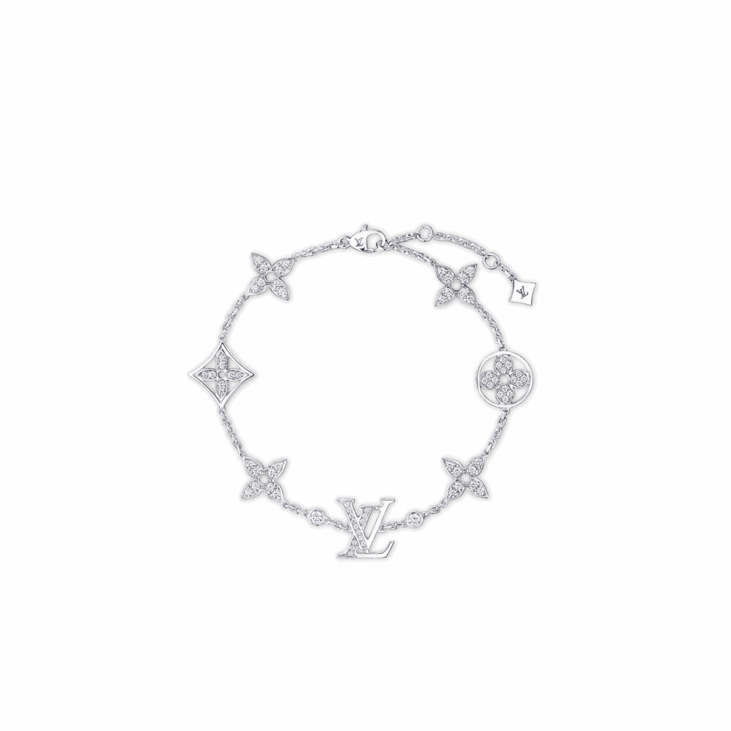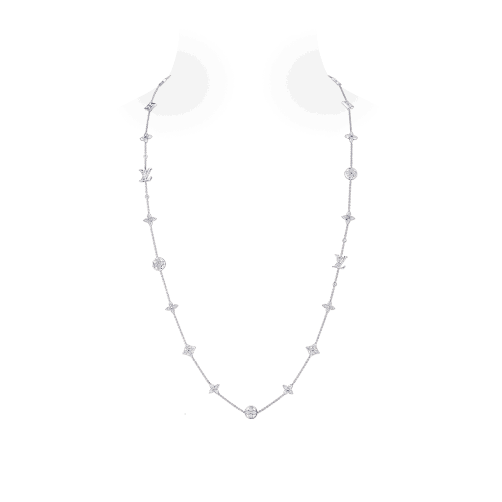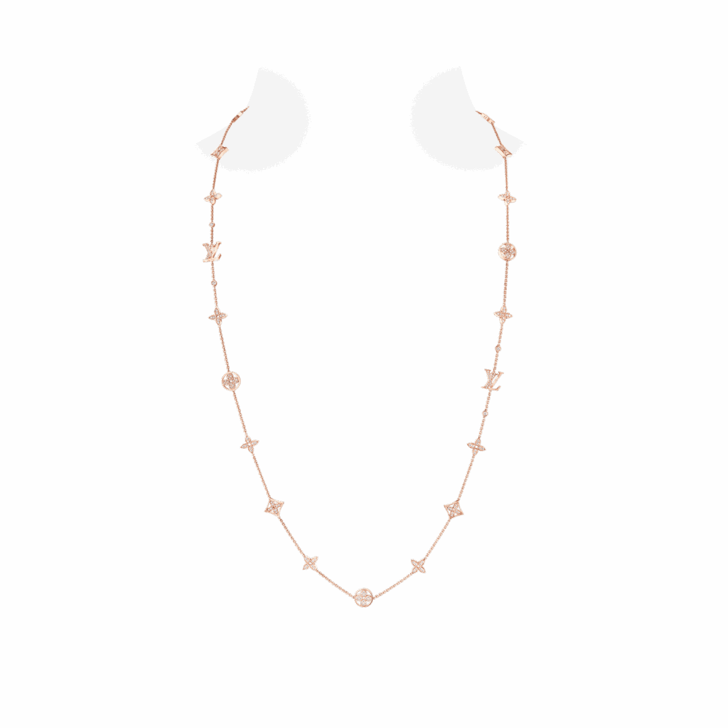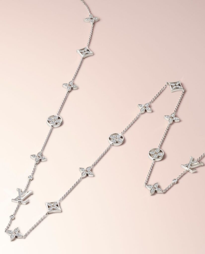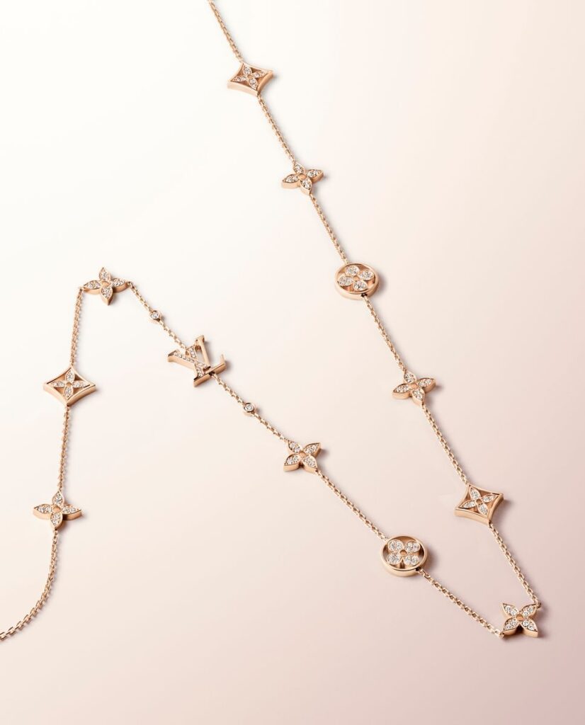 Cette saison, le Monogram, tantôt fuselé, arrondi, cerclé ou ajouré, se déploie sur deux sautoirs, trois bracelets et une bague. Les sautoirs, proposés en or rose et or blanc, se distinguent par leurs lignes contemporaines et leur fluidité, magnifiées par le sertissage de diamants.