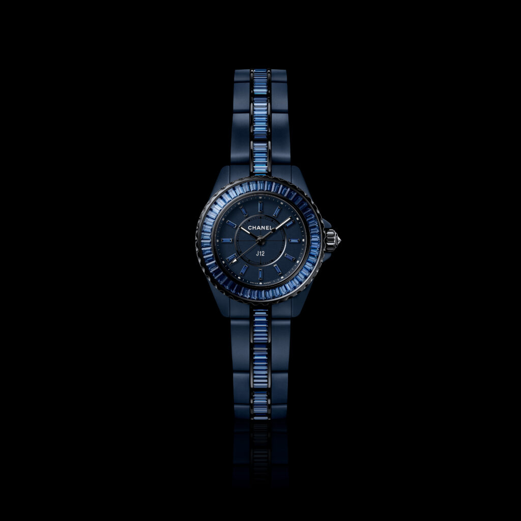 Ici, l’infinie profondeur du bleu s’exprime à travers une alliance audacieuse : céramique bleue mate et saphirs bleus taille baguette. Le cadran, la lunette et le bracelet sont sertis d’un total de 196 pierres précieuses, minutieusement posées au sein de la Manufacture CHANEL dans un travail joaillier ayant requis plus de 110 heures.