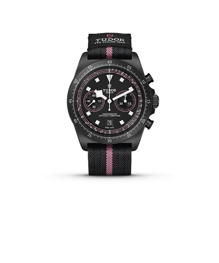 Le carbone, fibre totem du cyclisme professionnel, devient ici la matière première d’un boîtier de 43 mm à l’allure racée. Associé à du titane pour les éléments de manipulation, il assure à la montre une légèreté et une robustesse taillée pour la haute performance. L’échelle tachymétrique spiralaire – rareté horlogère – est pensée non pour la vitesse d’une voiture, mais pour celle d’un cycliste en course, une première dans la collection TUDOR.
