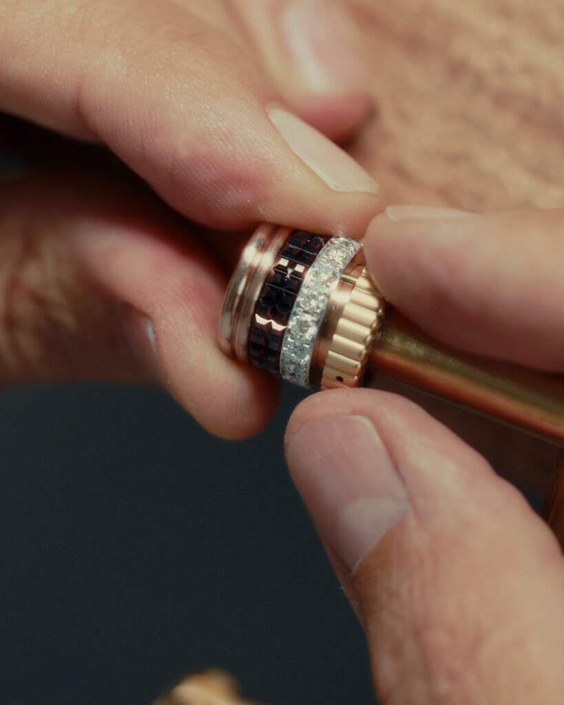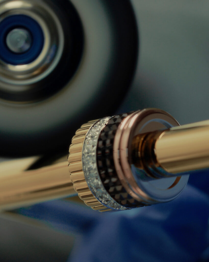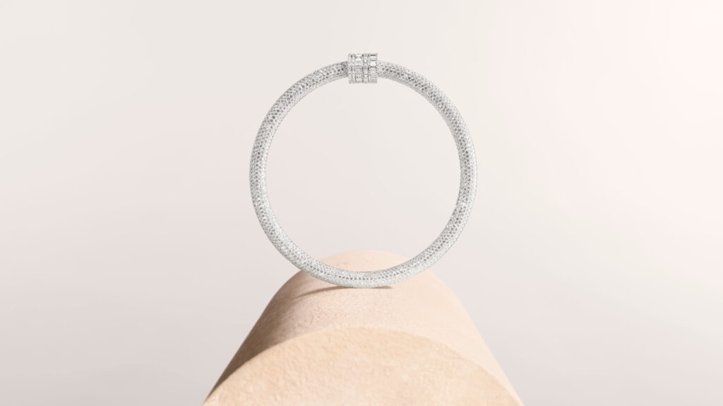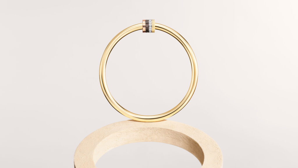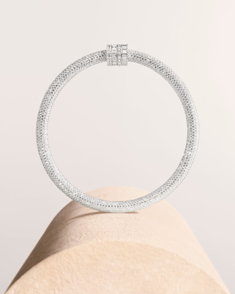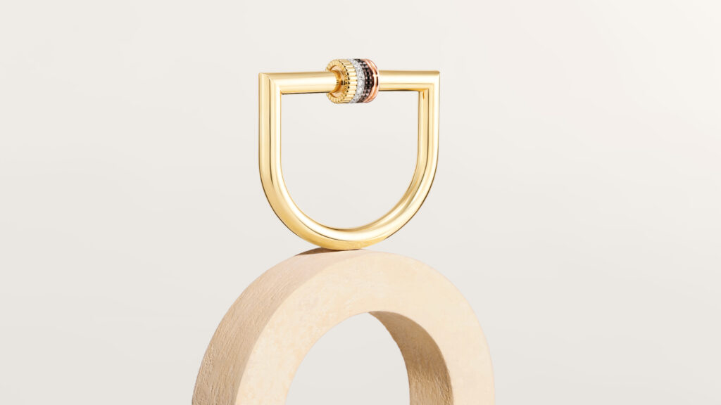 Dès sa pièce maîtresse – un torque tubulaire oversized en or jaune, blanc, rose et PVD marron –, l’intention est claire : affirmer l’objet-bijou comme un totem. Le fermoir central reprend les quatre codes historiques de la collection (Grosgrain, Double Godron, Clou de Paris, Ligne de Diamants), devenant élément architectural à part entière.