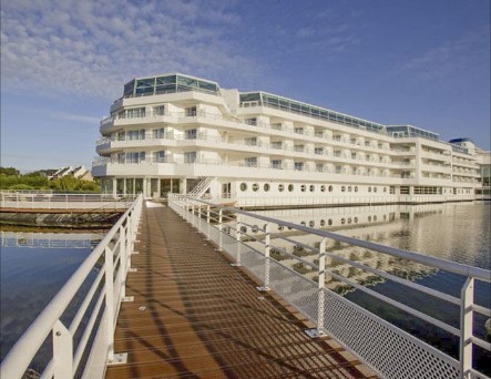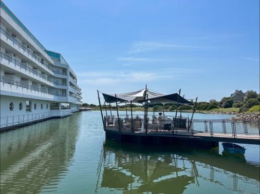 En plein cœur des villes d’Arzon et de Port du Crouesty, on aperçoit de loin ses 190 mètres de long et son architecture de paquebot avec passerelles et ponts. Il est amarré à un lac marin et est bordé par l’Océan Atlantique. En passant l’immense porche, Le Miramar La Cigale Hôtel Thalasso & Spa se dévoile petit à petit dans un camaïeu de couleurs claires et de baies ouvertes sur l’eau et le ciel.