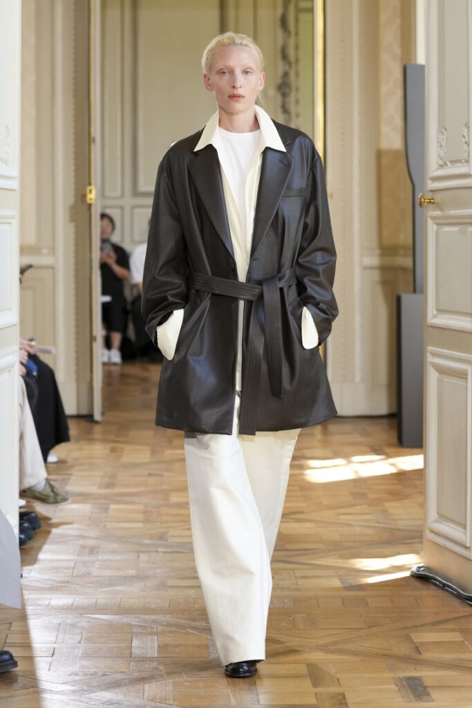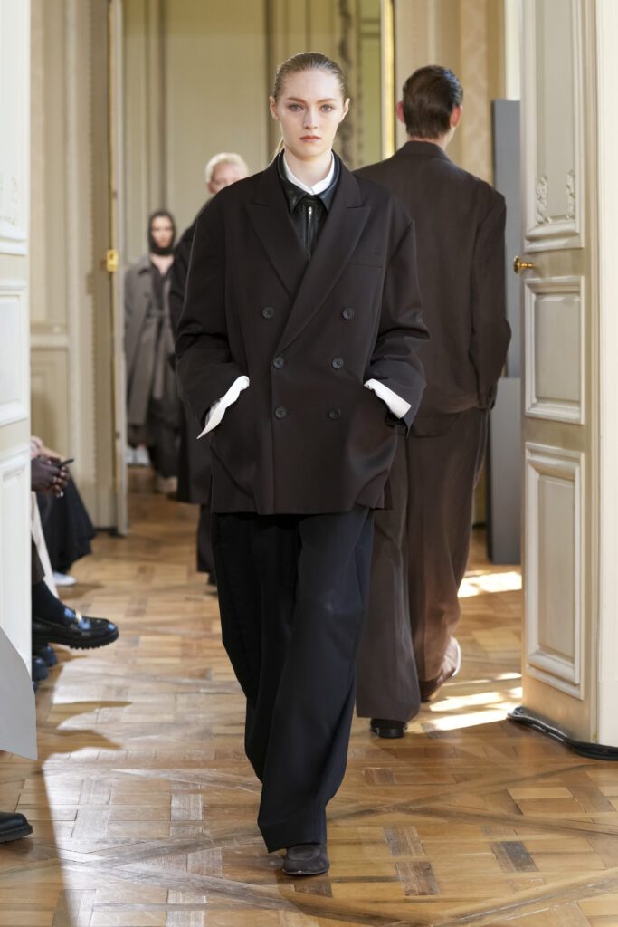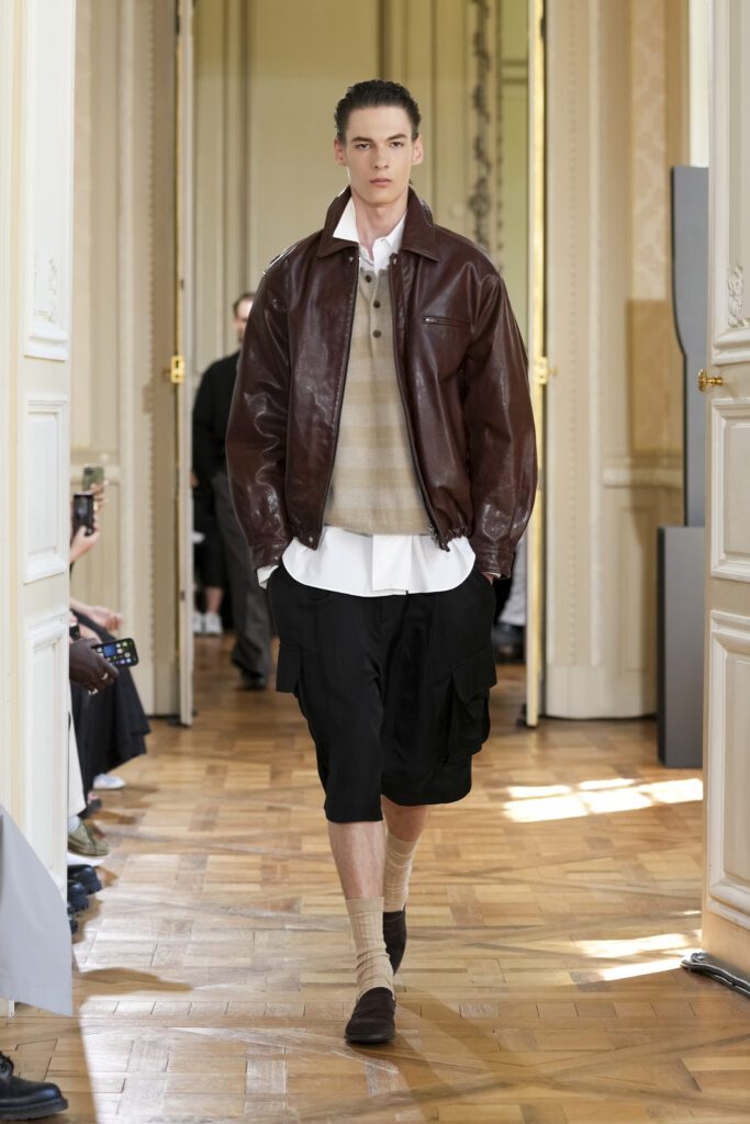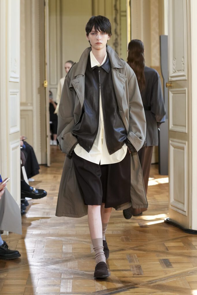 Les silhouettes revisitent les formes signatures de la marque. Un manteau doté d’un système de « docking », où le gilet intérieur est relié à la couche extérieure, se voit paré d’un nouveau col montant. Le bomber est décliné en deux versions : à taille en maille côtelée ou resserrée par un élastique. Les manteaux et vestes classiques gagnent en légèreté et en décontraction, avec des épaules naturellement arrondies grâce à un rembourrage discret.