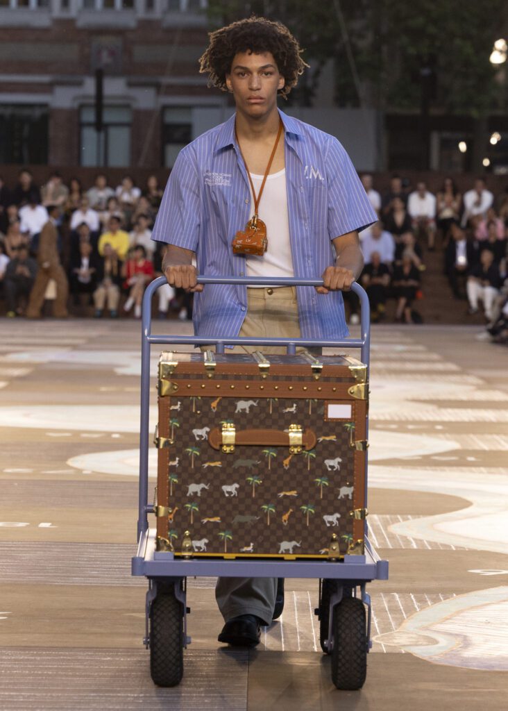 Les imprimés inspirés du graphisme urbain indien — semblables à des enseignes délavées — s’invitent sur les manteaux et sacs, notamment les modèles Speedy en cuir d’autruche ou de crocodile. Les souliers, tels que les modèles LV Jazz et Flip, affichent un aspect patiné par le soleil et le temps, incarnant l’esprit du voyage.
