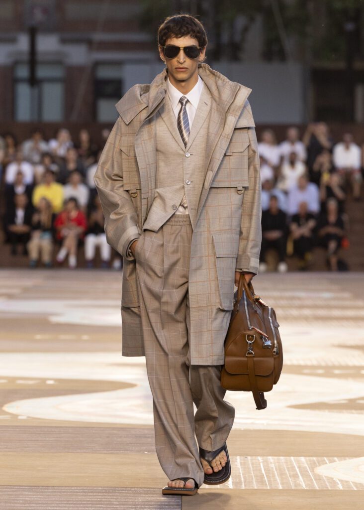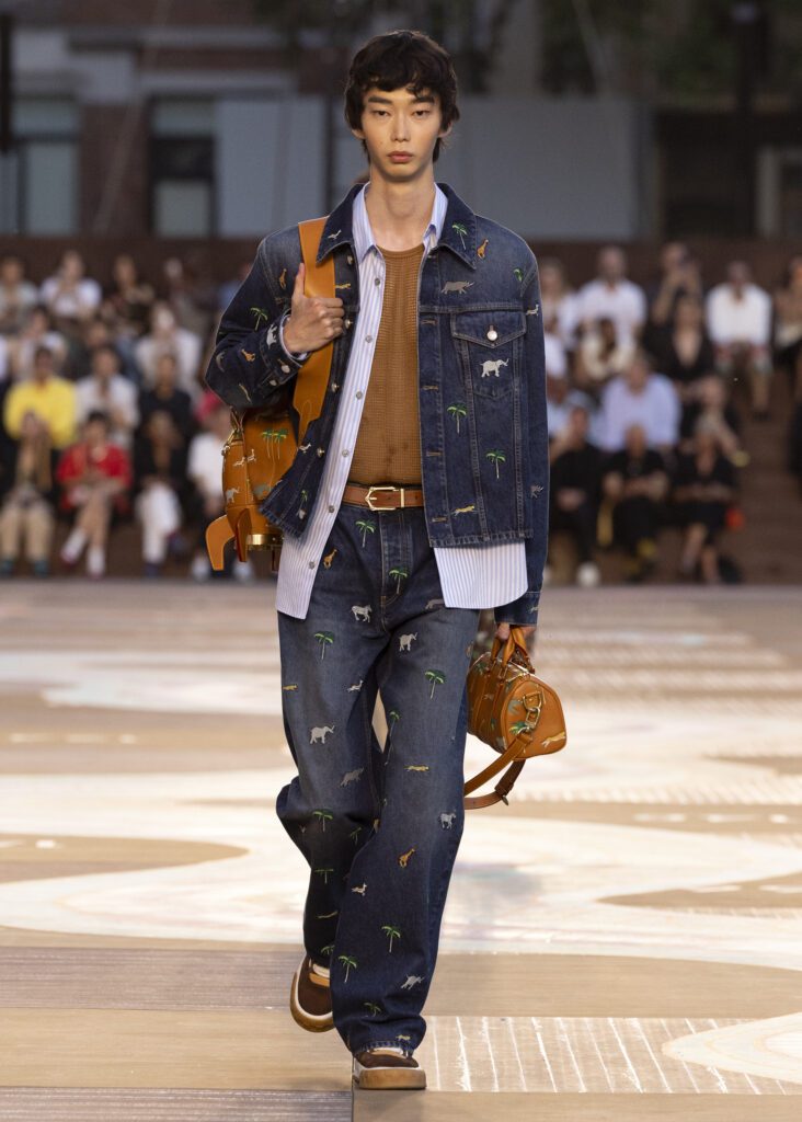 La palette chromatique évoque une promenade méditative à travers les paysages indiens — des pastels poudreux aux tons indigo, remplaçant le noir traditionnel. Un imprimé emblématique issu des valises du film The Darjeeling Limited fait ici ses débuts dans la collection, ornant manteaux, chemises et sacs d’une faune et flore généreuse au souffle continental. Le tailoring se veut fluide et sensuel, empreint de spontanéité, mêlant élégance classique, influences sportives et esprit d’expédition.