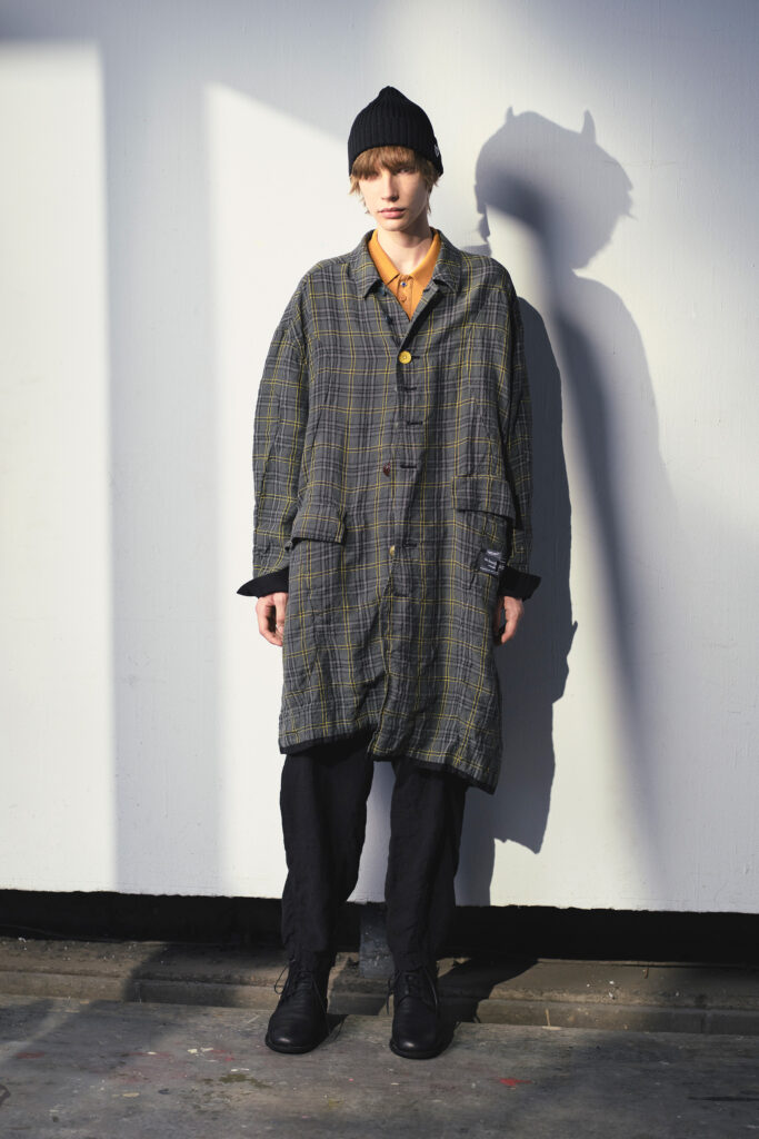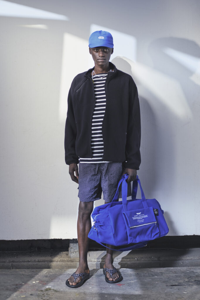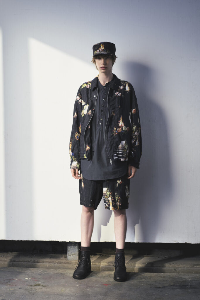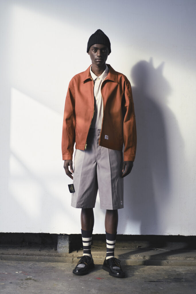 Takahashi reste fidèle à son goût pour les paradoxes visuels : étiquettes apparentes, zips décalés, coutures et poches asymétriques rendent les silhouettes familières étrangement nouvelles. Même dans ses collaborations avec Champion, Dickies ou Vans, il infuse une touche de surréalisme, transformant les pièces utilitaires en objets de haute mode.