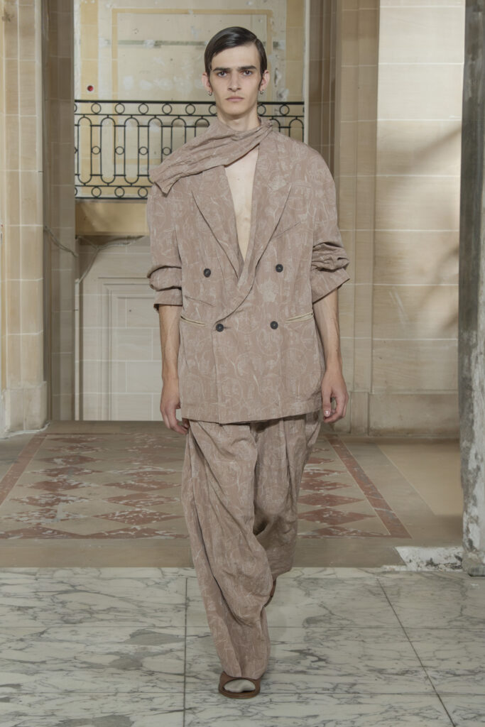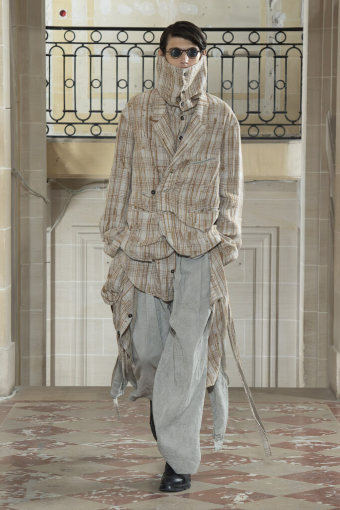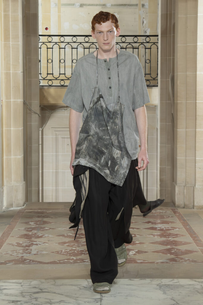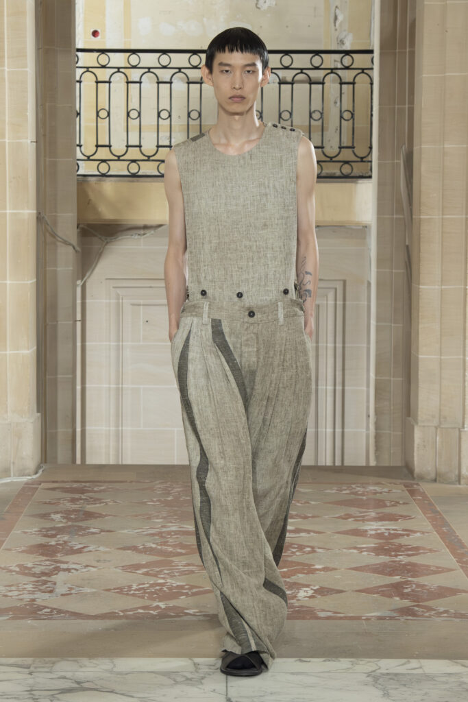 Intitulée PRITRIKE, la collection printemps-été 2026 de Ziggy Chen est une méditation poétique sur la puissance primordiale de la nature, matrice de toute forme de vie. Son nom, né de la fusion des mots primal et strike, évoque une énergie silencieuse mais irrésistible, semblable à la pluie d’été qui s’abat doucement sur la région du Jiangnan. Les vêtements semblent respirer avec légèreté, naturel et fluidité, comme s’ils étaient nés de la nature elle-même.