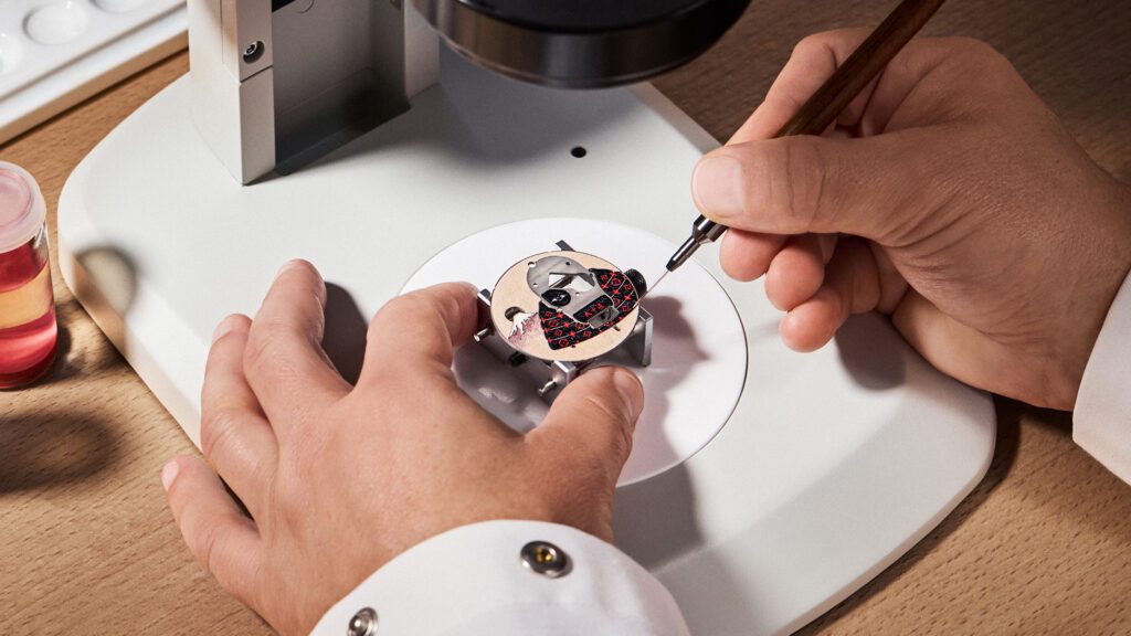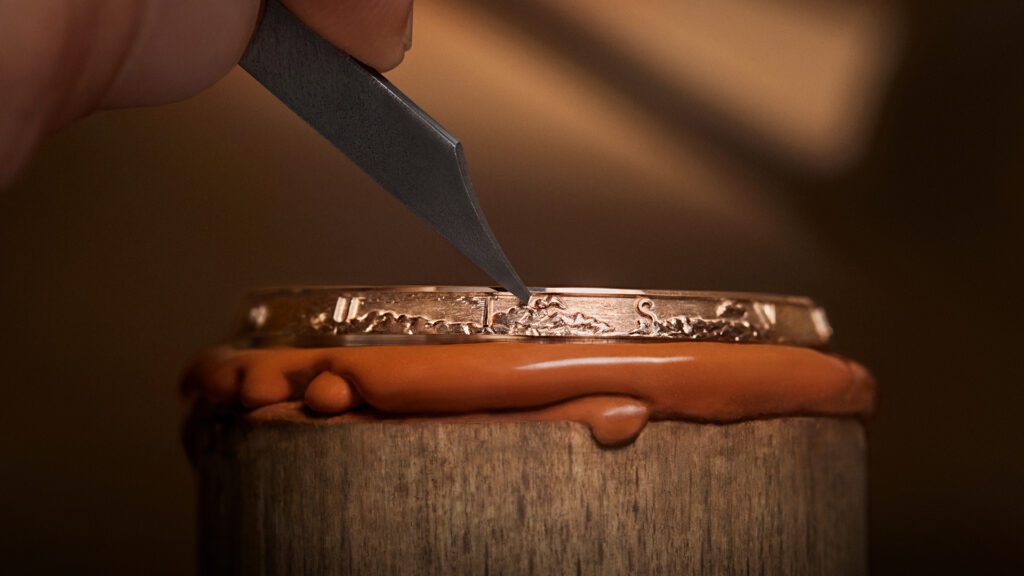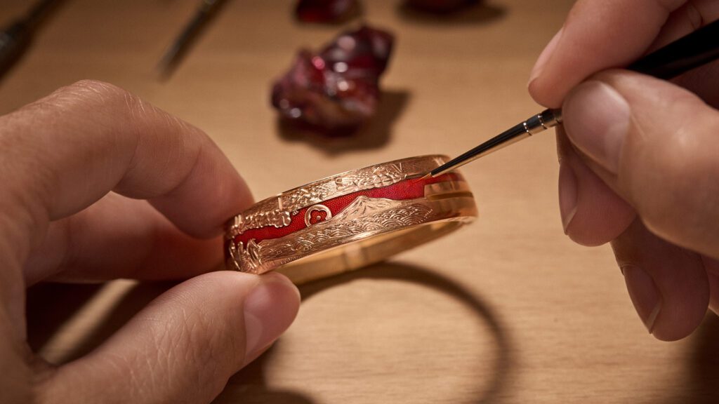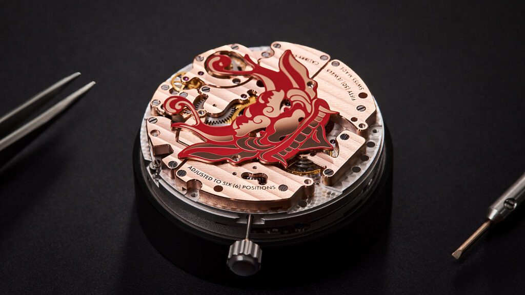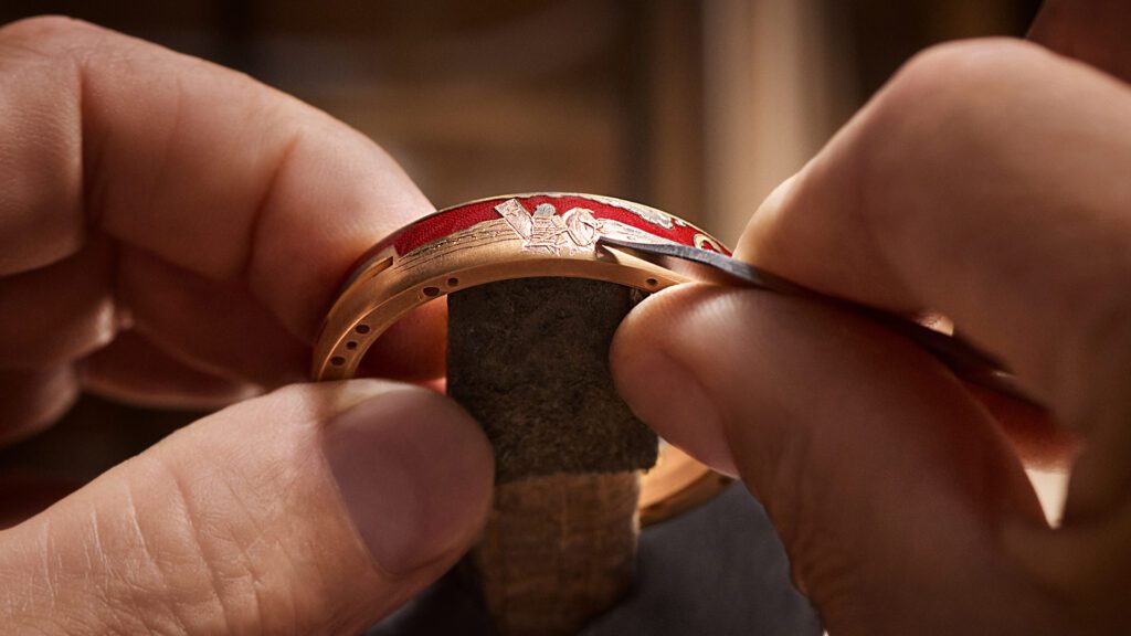 Autour du cadran, le boîtier gravé de 46,8 mm présente sur son flanc un samouraï à cheval face au Mont Fuji, sur un fond d’émail rouge flamboyant. Ce décor miniature, fruit de deux cents heures d’ouvrage, affirme l’engagement extrême de la Maison dans la création de pièces uniques à la croisée de l’art et de l’horlogerie.