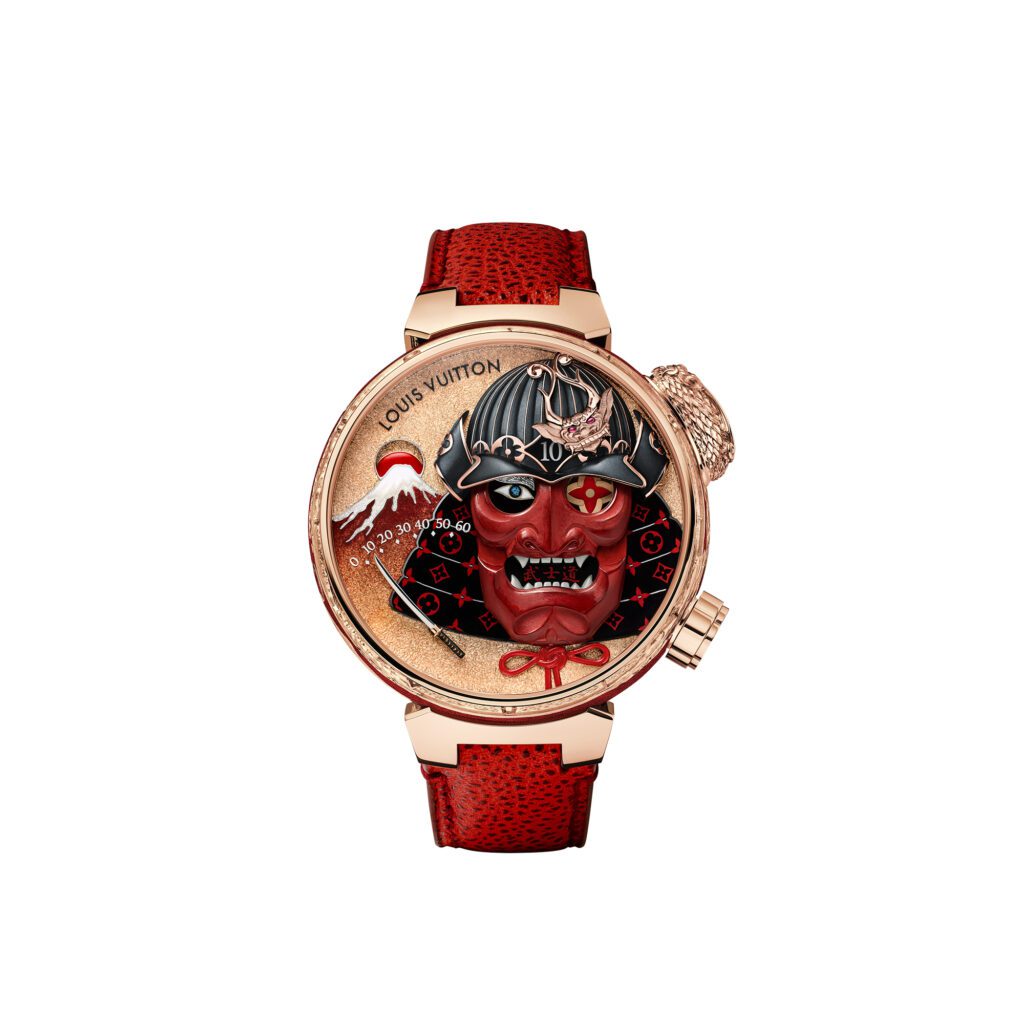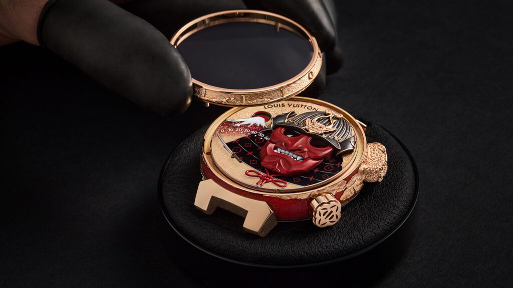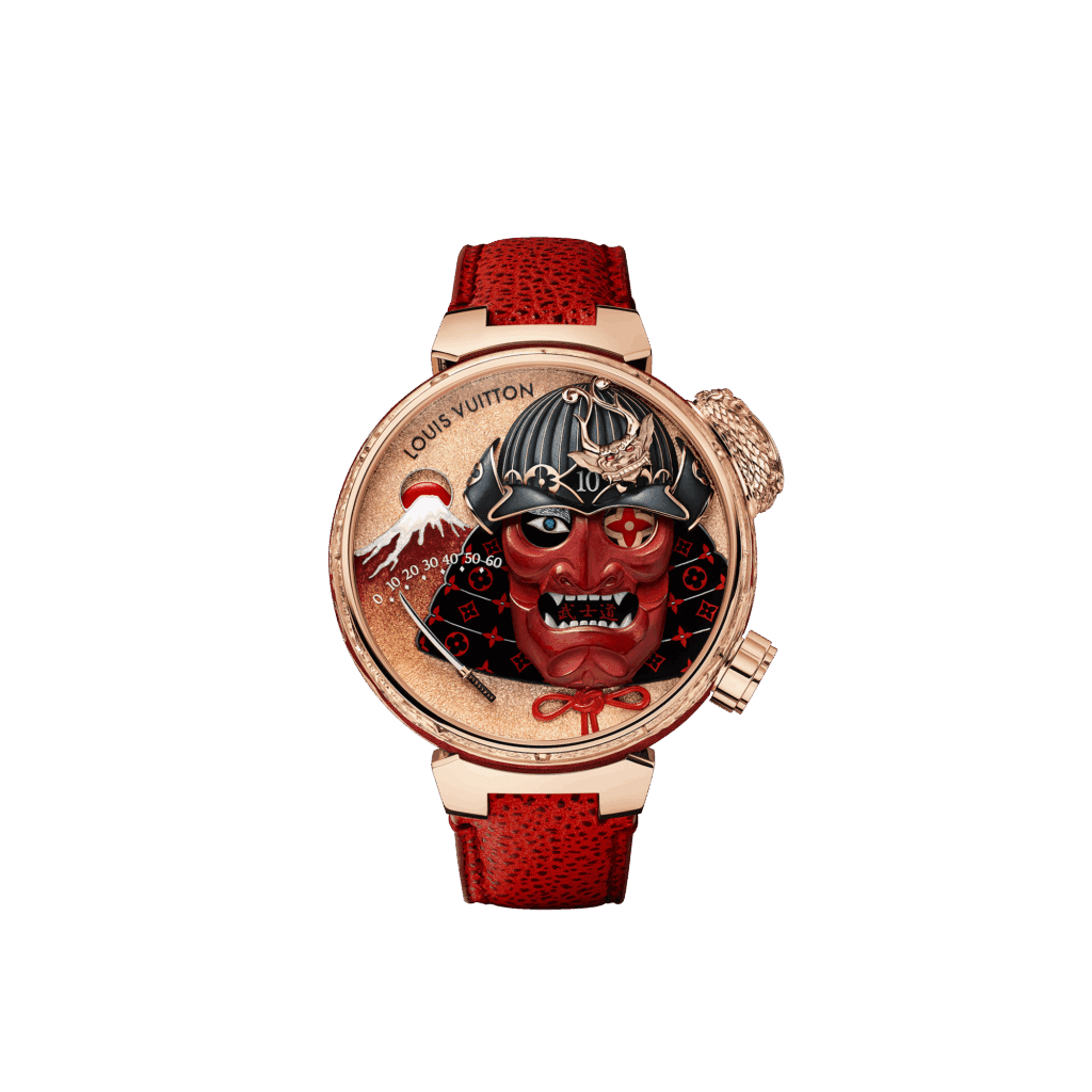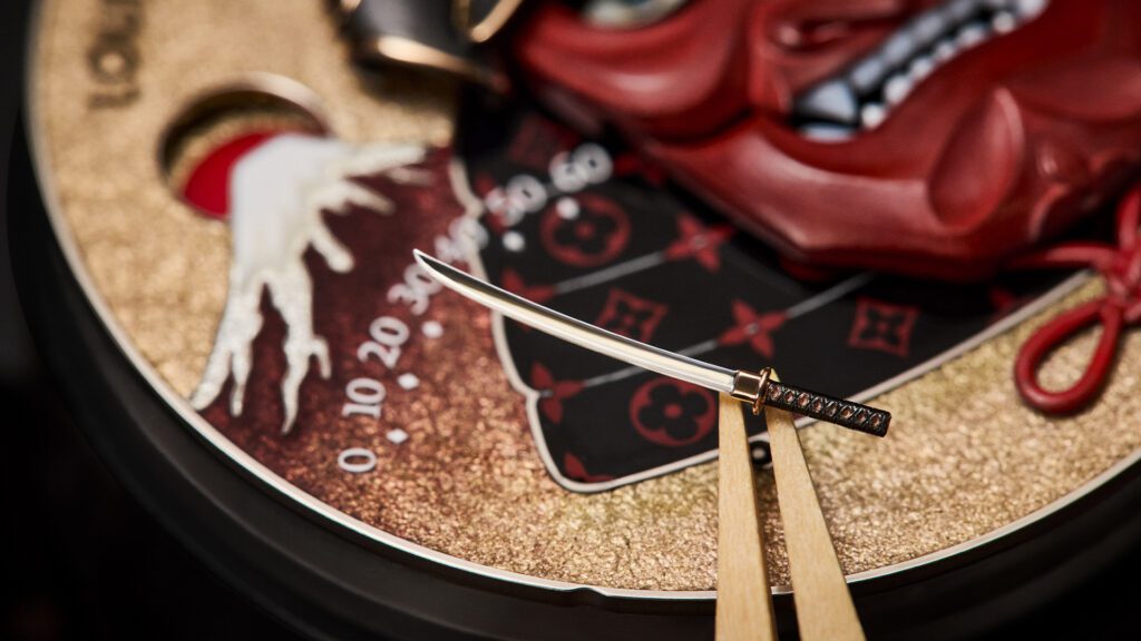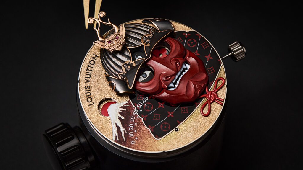 Le spectacle se joue sur un cadran d’exception mêlant or rose, or blanc, rubis, émail cloisonné, paillonné et bas-relief — véritable manifeste des métiers d’art de La Fabrique des Arts de Louis Vuitton. Le kabuto, le menpo, le yokai et le shikoro sont autant d’éléments gravés, sculptés, émaillés, incarnant la puissance rituelle et esthétique des guerriers japonais.