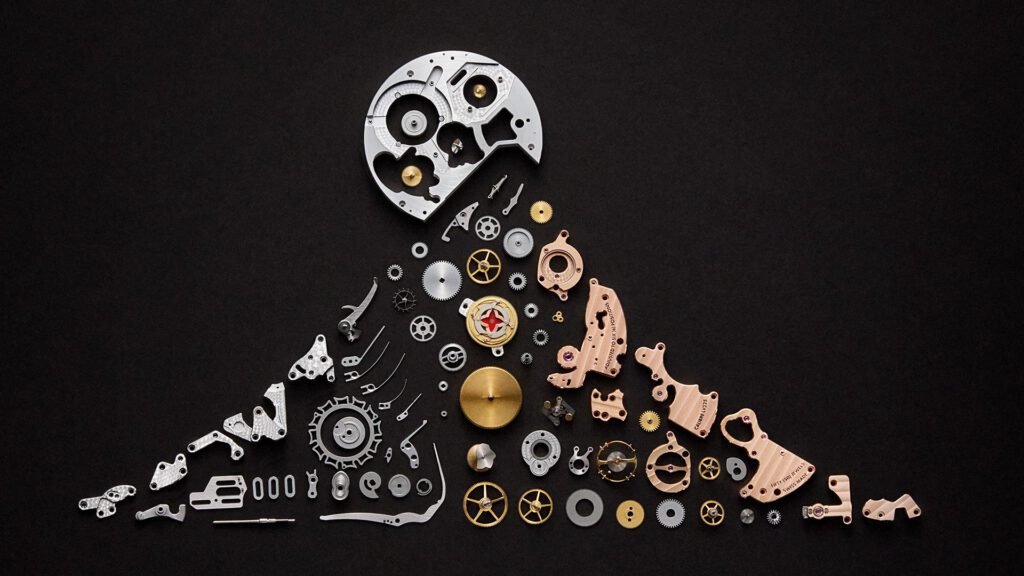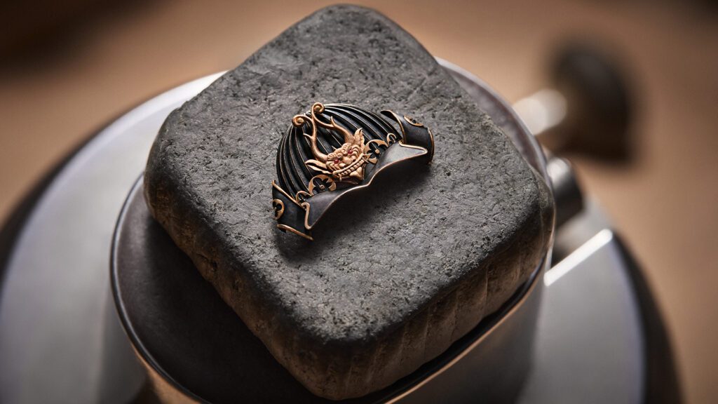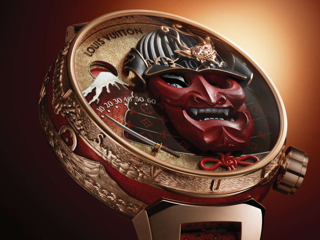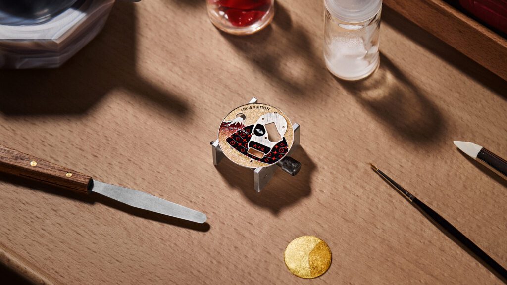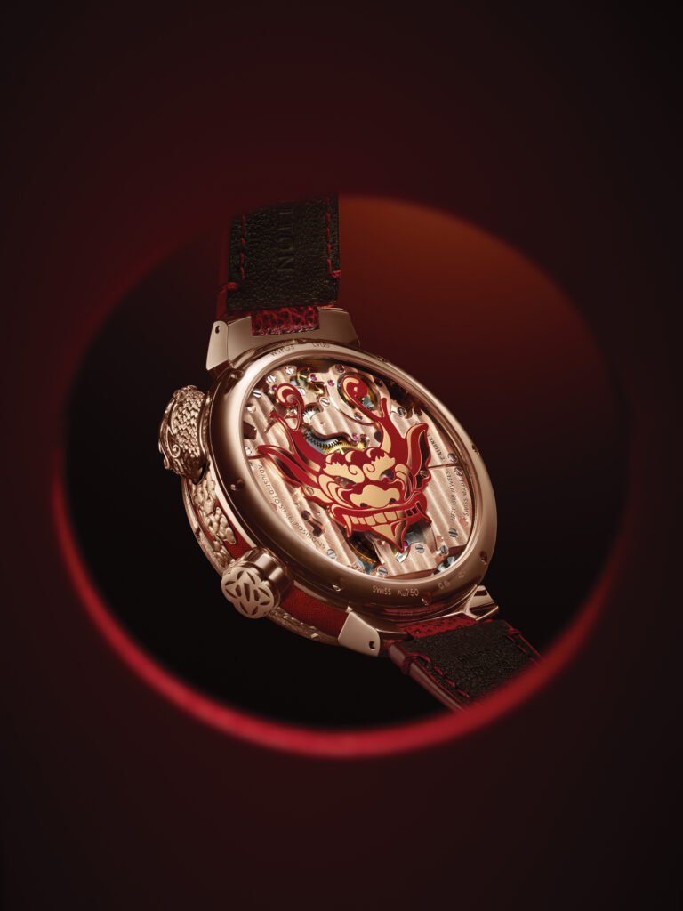 Le spectacle se joue sur un cadran d’exception mêlant or rose, or blanc, rubis, émail cloisonné, paillonné et bas-relief — véritable manifeste des métiers d’art de La Fabrique des Arts de Louis Vuitton. Le kabuto, le menpo, le yokai et le shikoro sont autant d’éléments gravés, sculptés, émaillés, incarnant la puissance rituelle et esthétique des guerriers japonais.