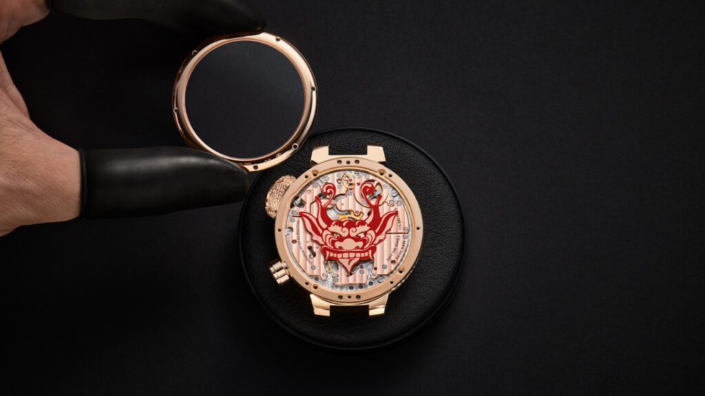 Cinq animations s’épanouissent en seize secondes hypnotiques, activées à la demande, révélant un samouraï au visage changeant, animé par le calibre mécanique LV 525. La précision technique est ici mise au service d’un imaginaire visuel puissant : katana marqueur de minutes rétrogrades, heure sautante révélée par un yokai glissant, transformation expressive du masque, jusqu’à l’apparition du mot « Bushido » en idéogrammes rouges dans une bouche animée aux dents de nacre.