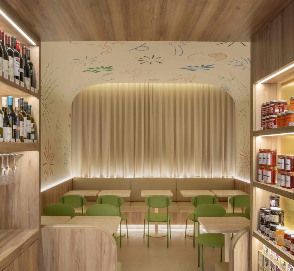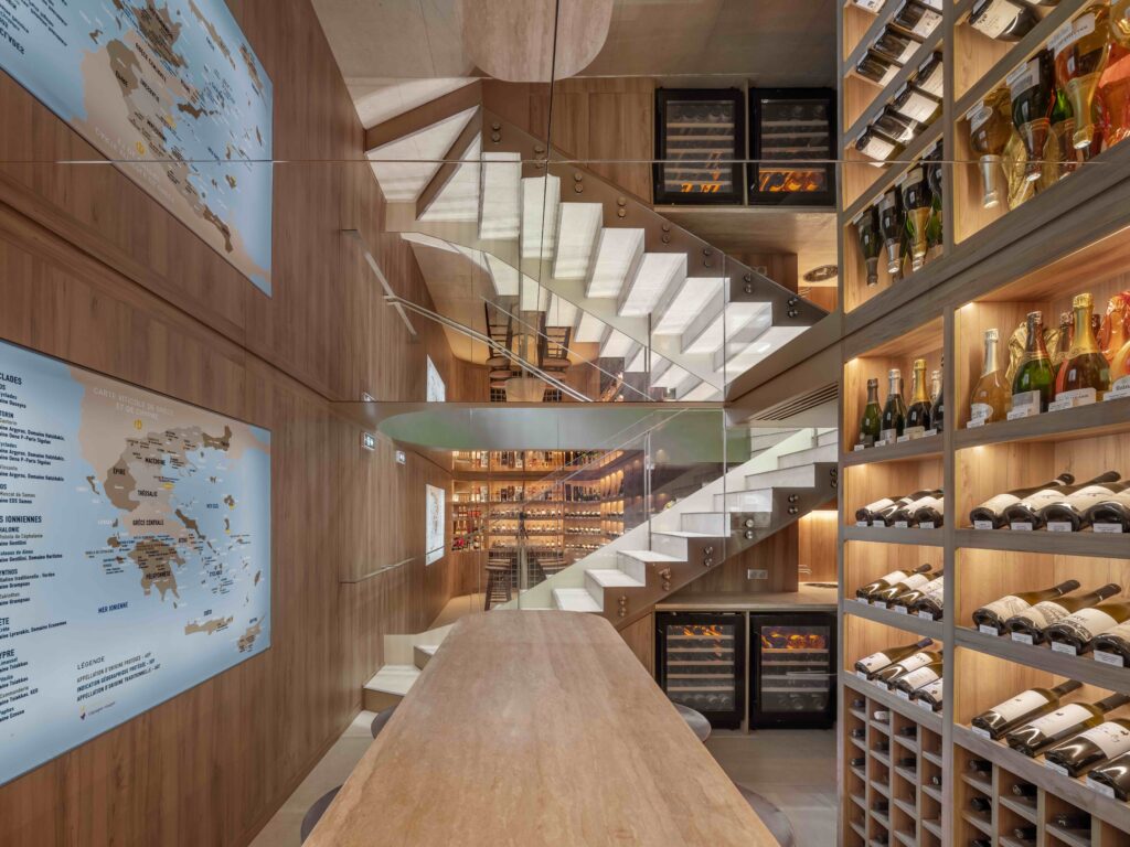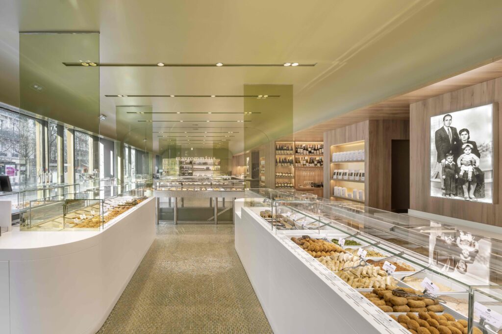 Pensé comme un lieu de circulation fluide et sensorielle, le décor marie bois clair, verre teinté vert olive et comptoirs marbrés, dans un esprit de sobriété sophistiquée. Une esthétique lumineuse et épurée, entre rigueur parisienne et chaleur méditerranéenne, parfaitement alignée avec le prestige de son nouvel environnement.